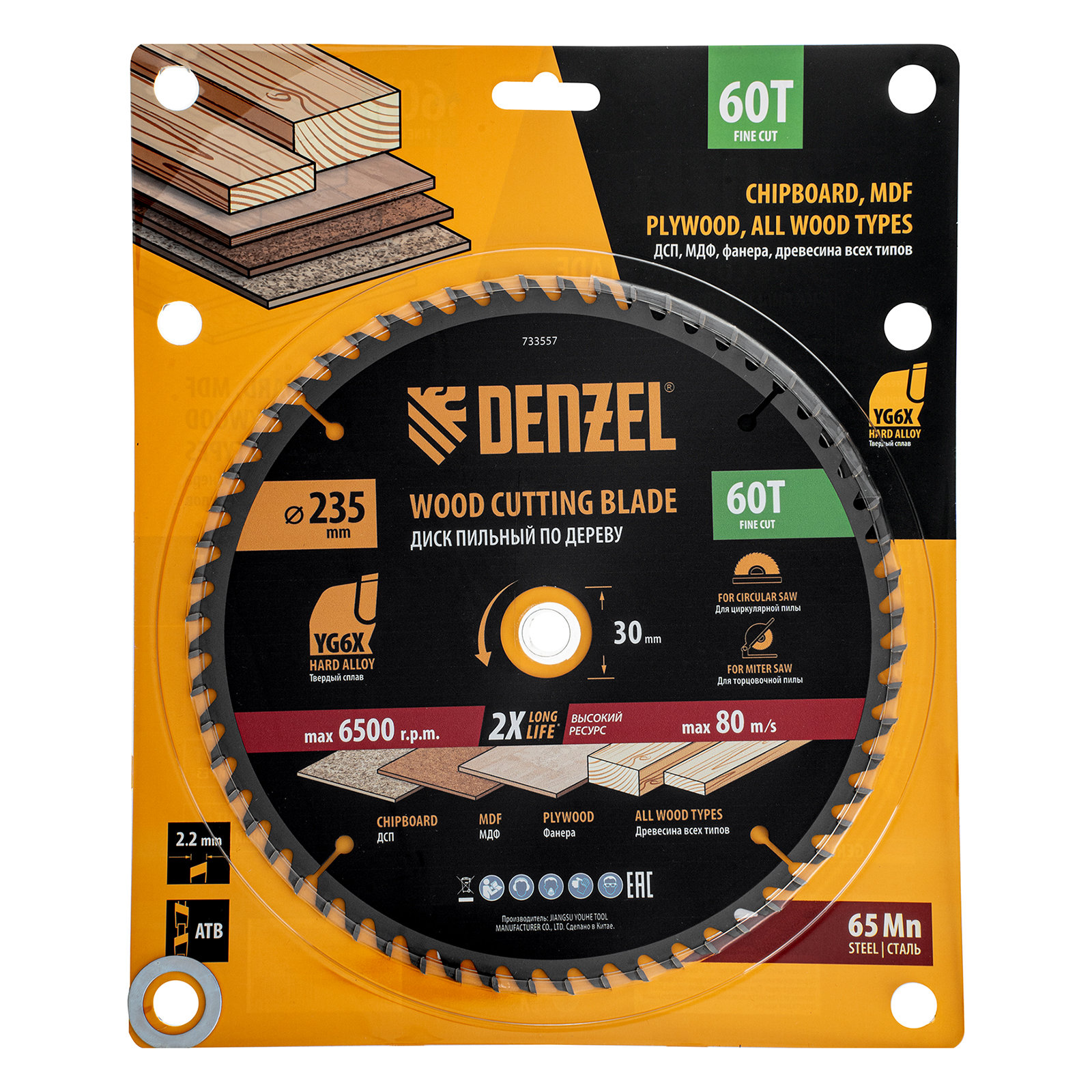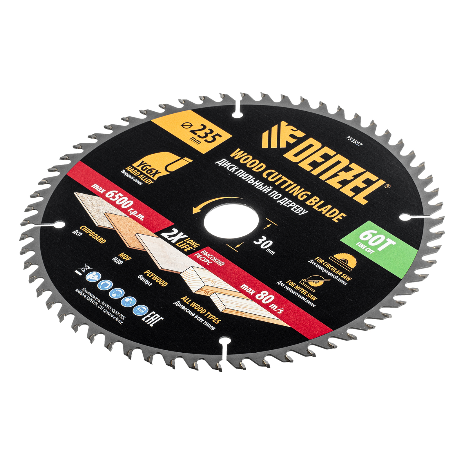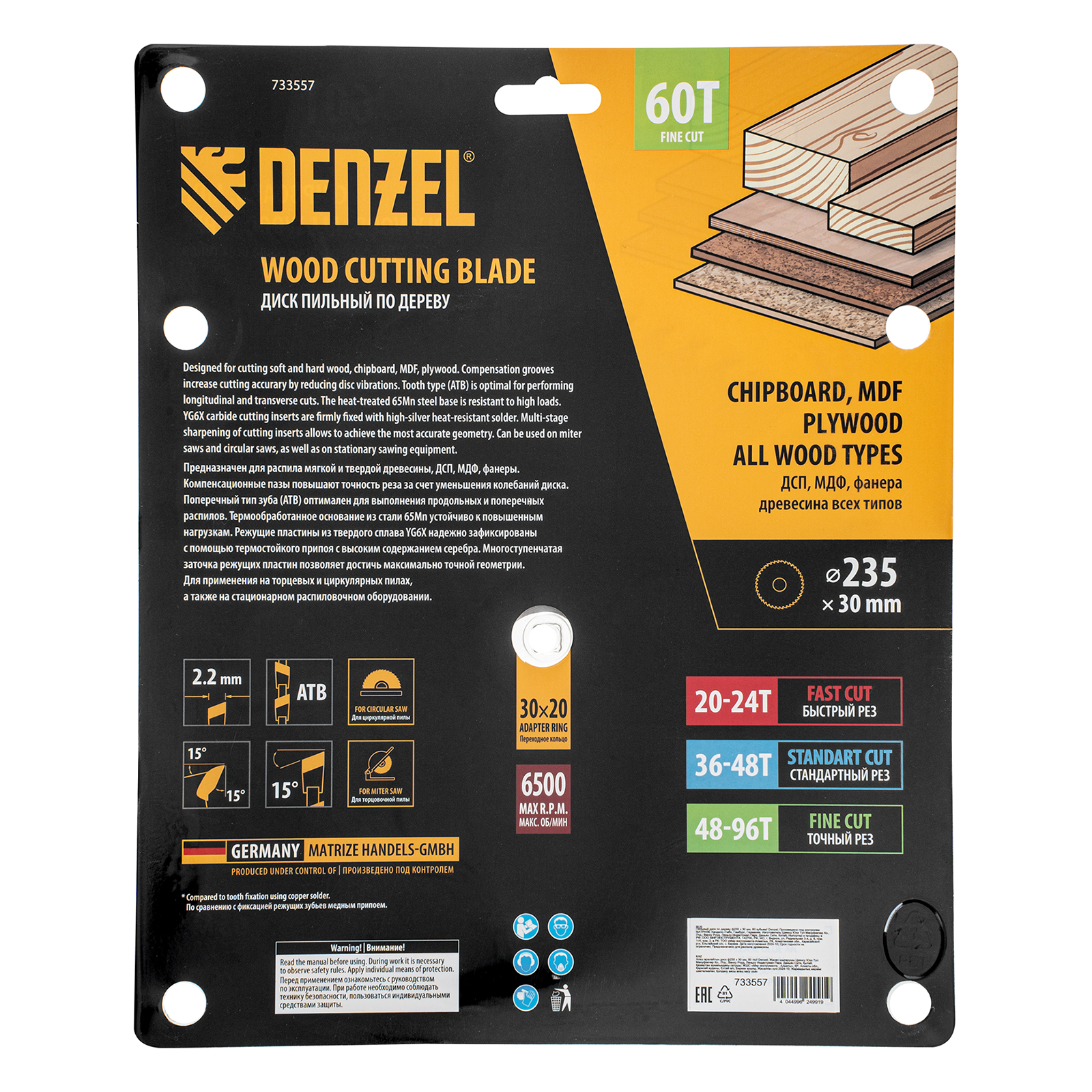 Пильный диск Denzel 733557 диаметром 235 x 30 мм, с 60 зубьями, предназначен для точного продольного и поперечного распила твердой и мягкой древесины, фанеры, МДФ, ДСП. 60 зубьев типа ATB с режущими пластинами оптимальной геометрии обеспечивают чистый рез. Режущие пластины из твердого сплава YG6X сохраняют рабочие свойства при интенсивном использовании. Диск устанавливается на циркулярную, торцовочную пилу или на распиловочный станок. В комплект поставки входит переходное кольцо с 30 на 20 мм, что позволяет изменить посадочный размер и расширяет возможности использования диска.