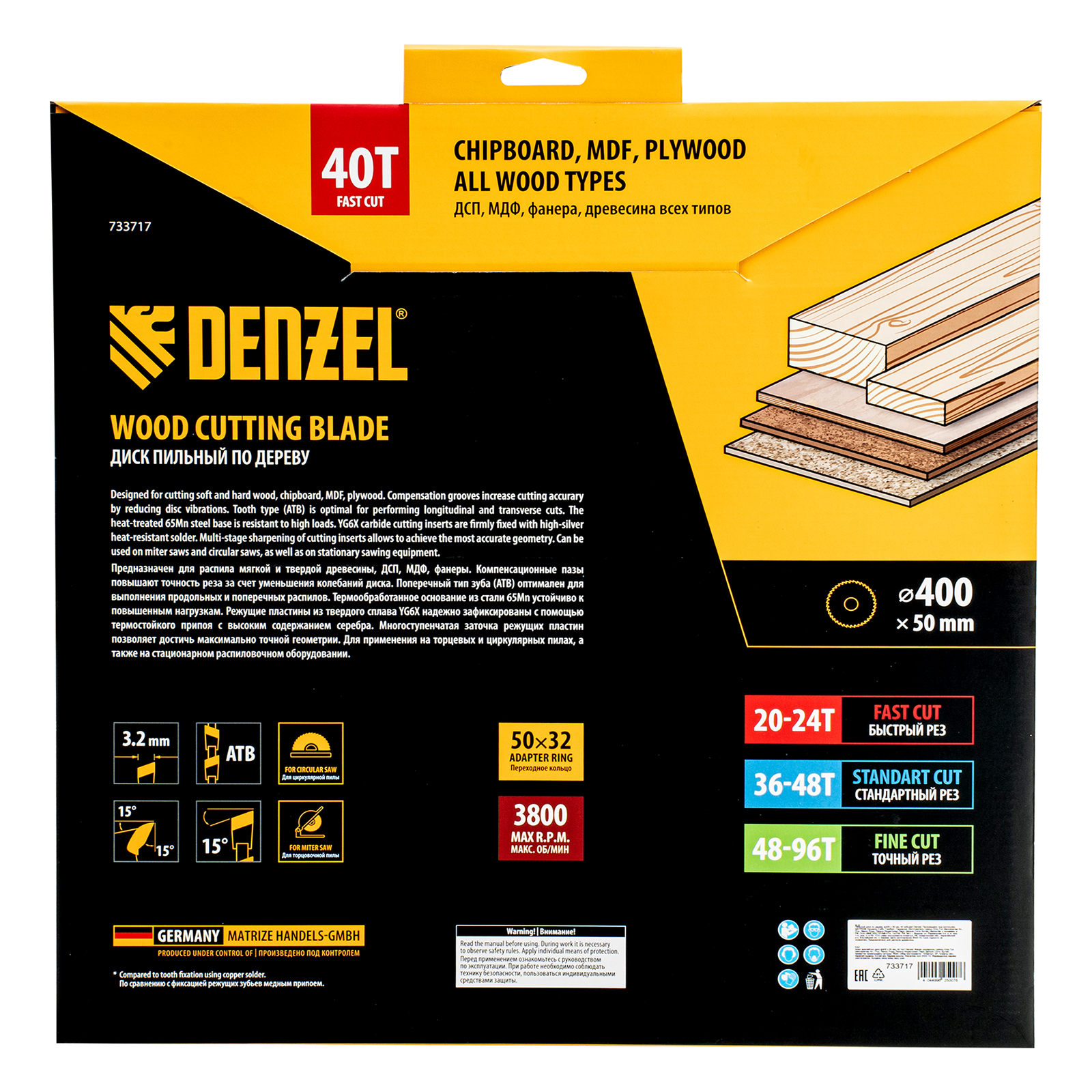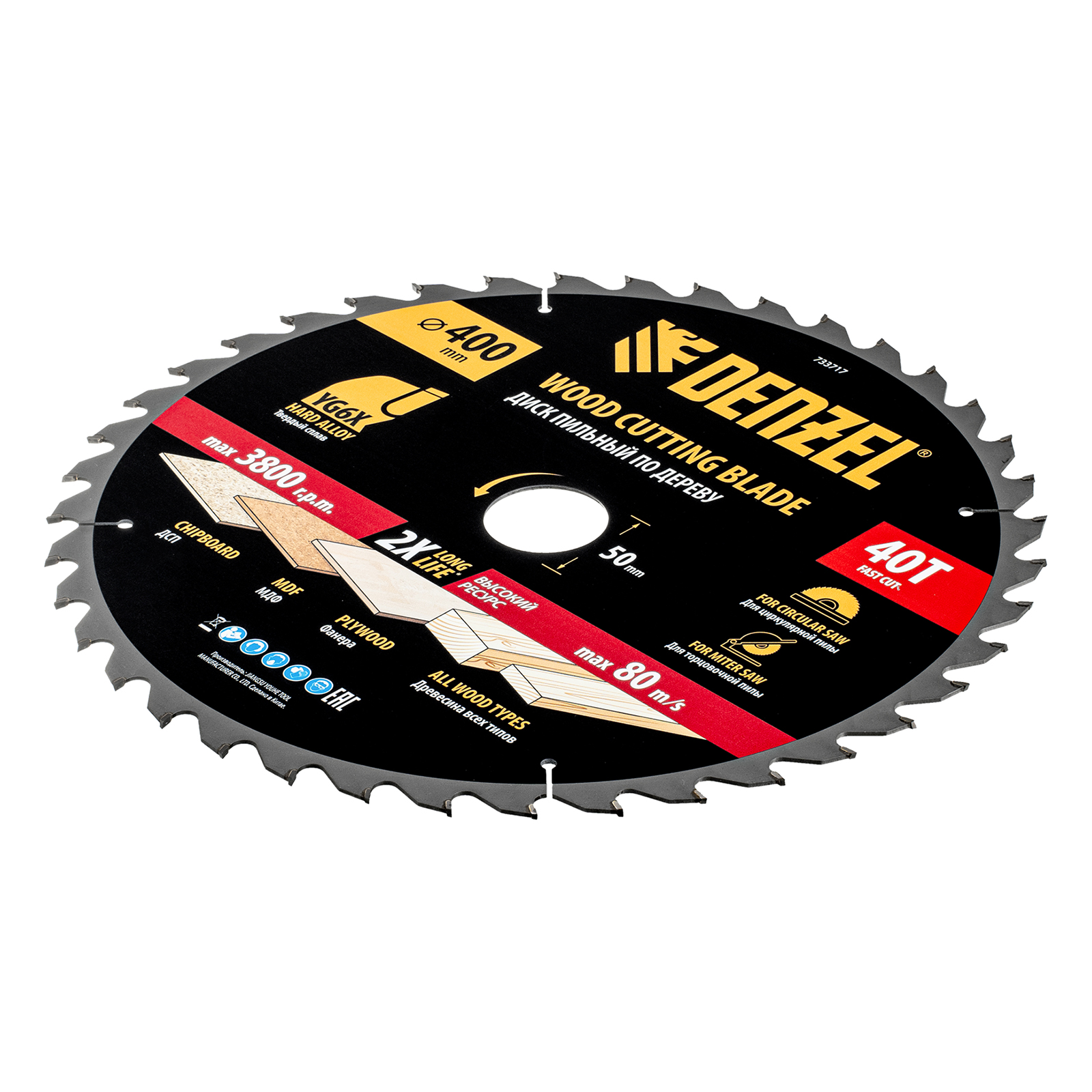 Пильный диск Denzel 733717 диаметром 400 x 50 мм, с 40 зубьями, предназначен для продольного и поперечного распила твердой и мягкой древесины, фанеры, МДФ, ДСП. 40 зубьев типа ATB с режущими пластинами оптимальной геометрии обеспечивают качественный рез. Тип реза — стандартный. Режущие пластины из твердого сплава YG6X сохраняют рабочие свойства при интенсивном использовании. Диск устанавливается на циркулярную, торцовочную пилу или на распиловочный станок. В комплект поставки входит переходное кольцо с 50 на 32 мм, что позволяет изменить посадочный размер и расширяет возможности использования диска.