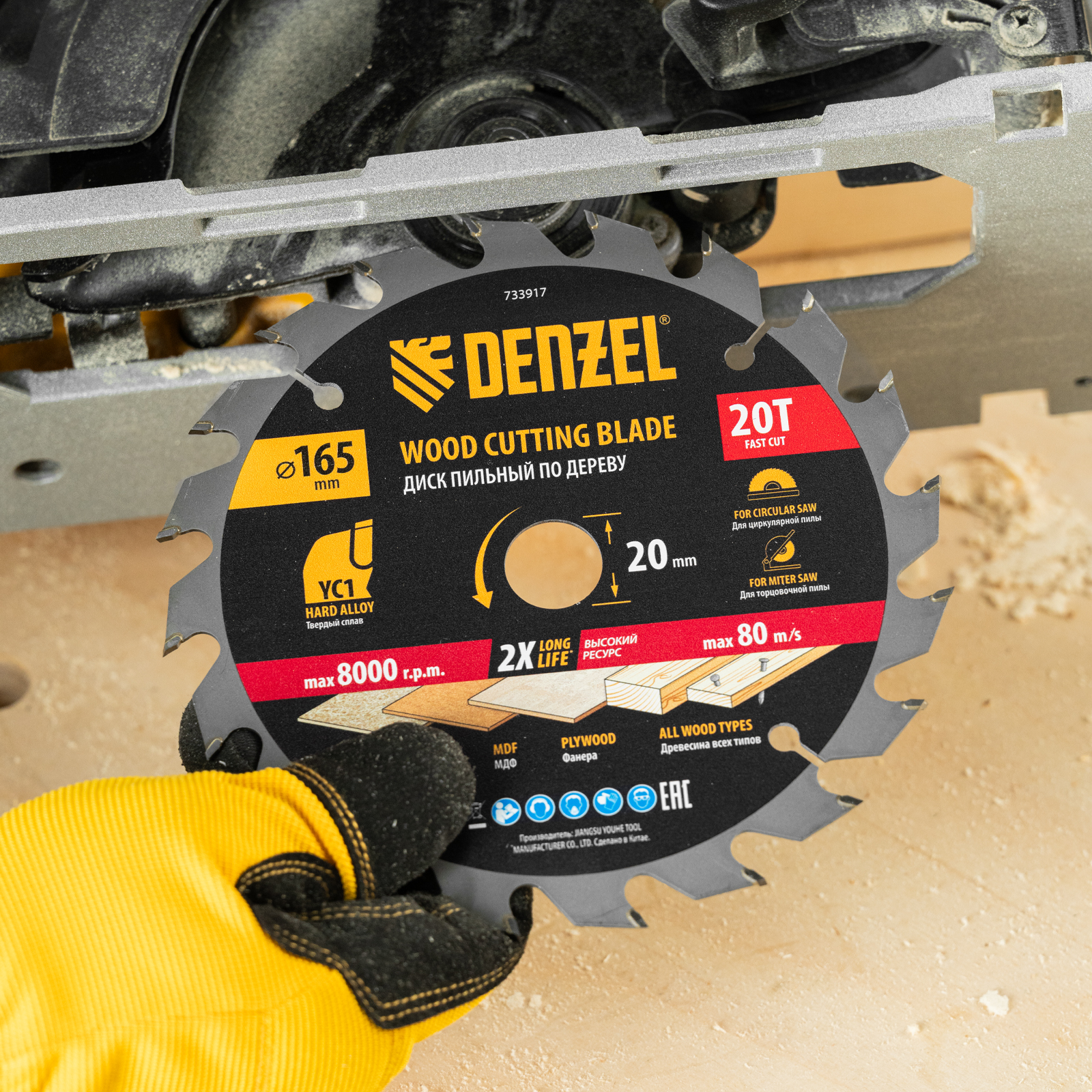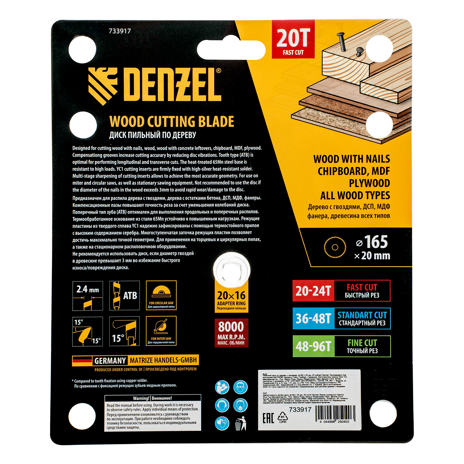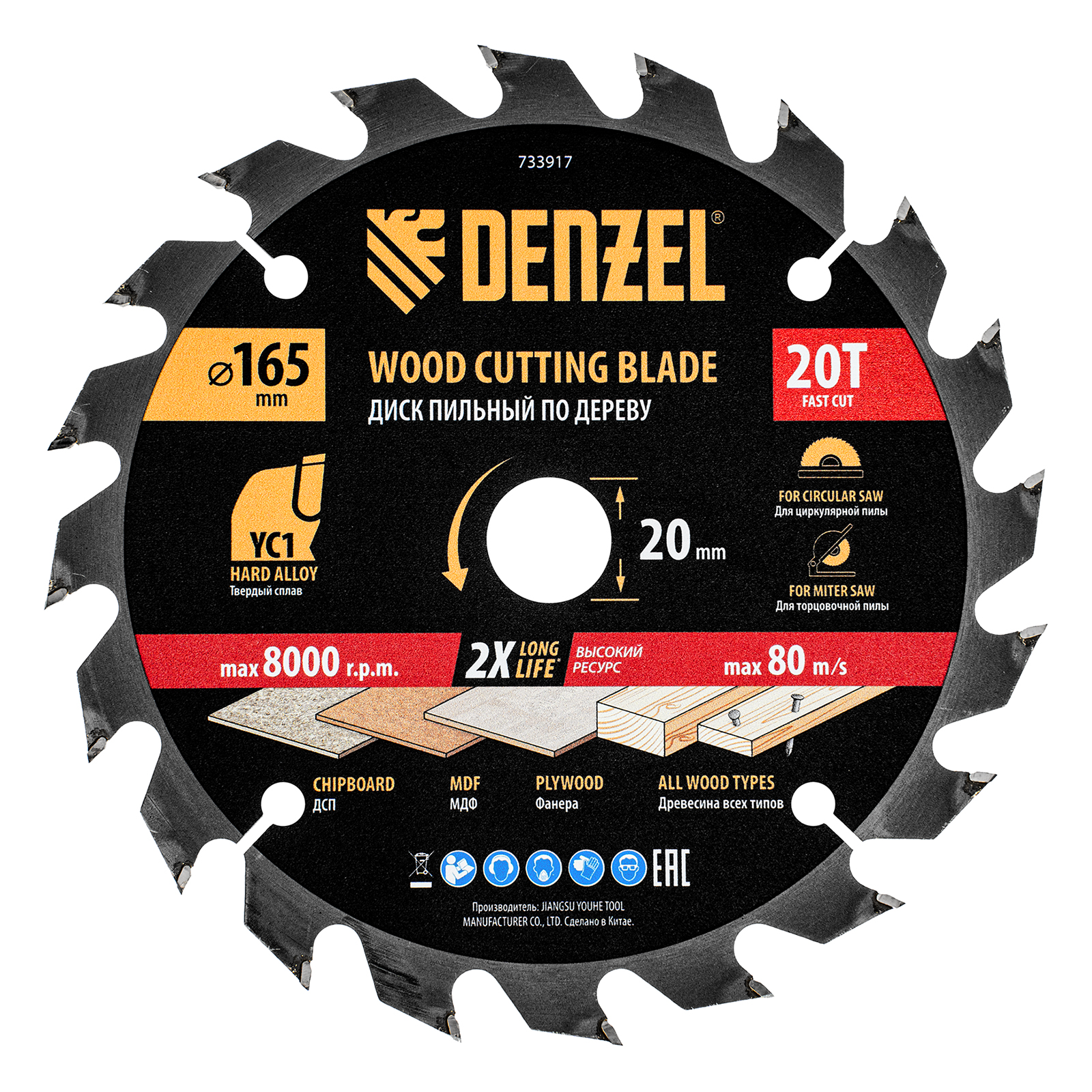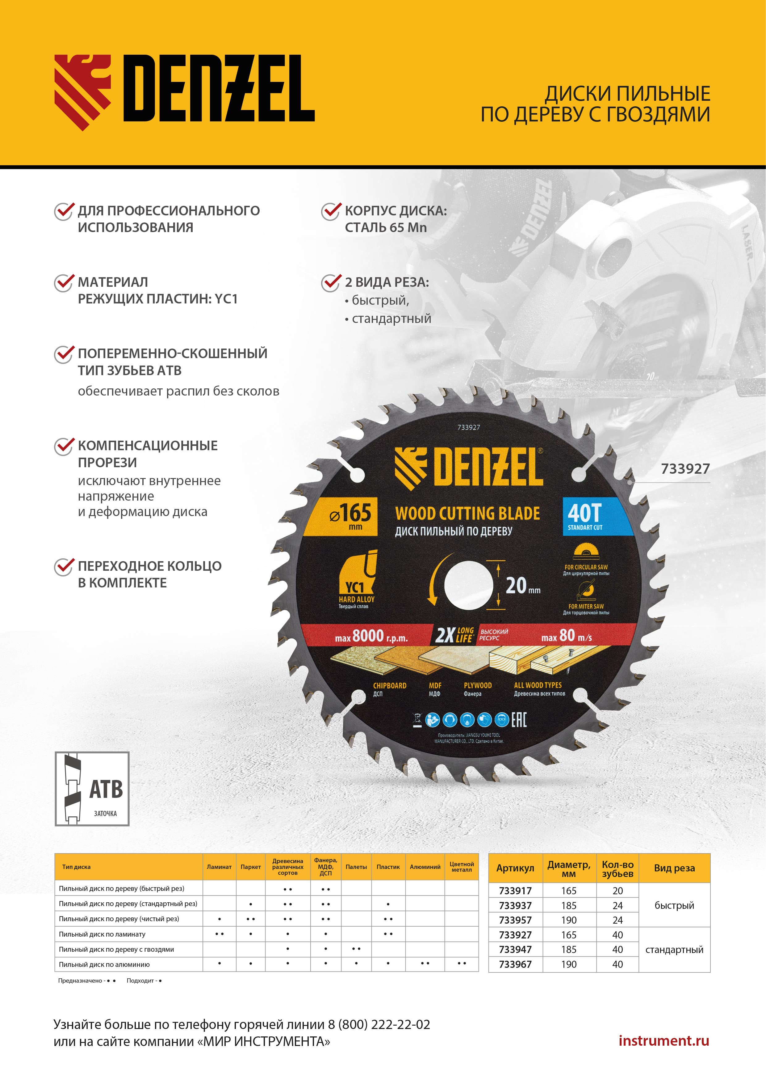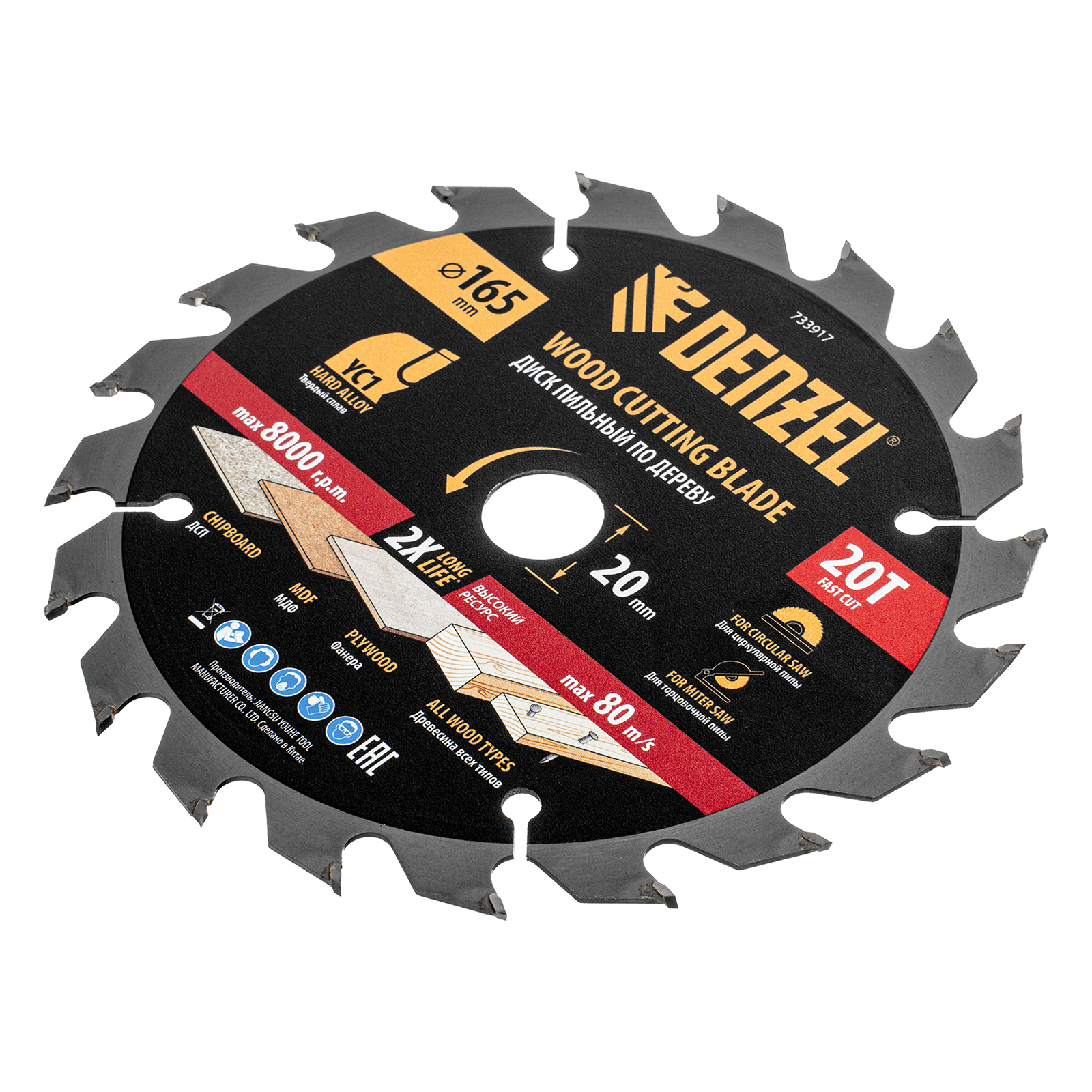 Пильный диск Denzel 733917 диаметром 165 x 20 мм, с 20 зубьями типа ATB, предназначен для быстрого продольного и поперечного распиливания древесины всех типов, в том числе с гвоздями и остатками бетона, а также ДСП, МДФ, фанеры. Режущие пластины из твердого сплава YC1, прошедшие многоступенчатую заточку, позволяют успешно справляться с прочными материалами. Диск устанавливается на циркулярную, торцовочную пилу или на распиловочный станок. В комплект поставки входит переходное кольцо 20/16 мм, позволяющее изменить посадочный диаметр при необходимости.