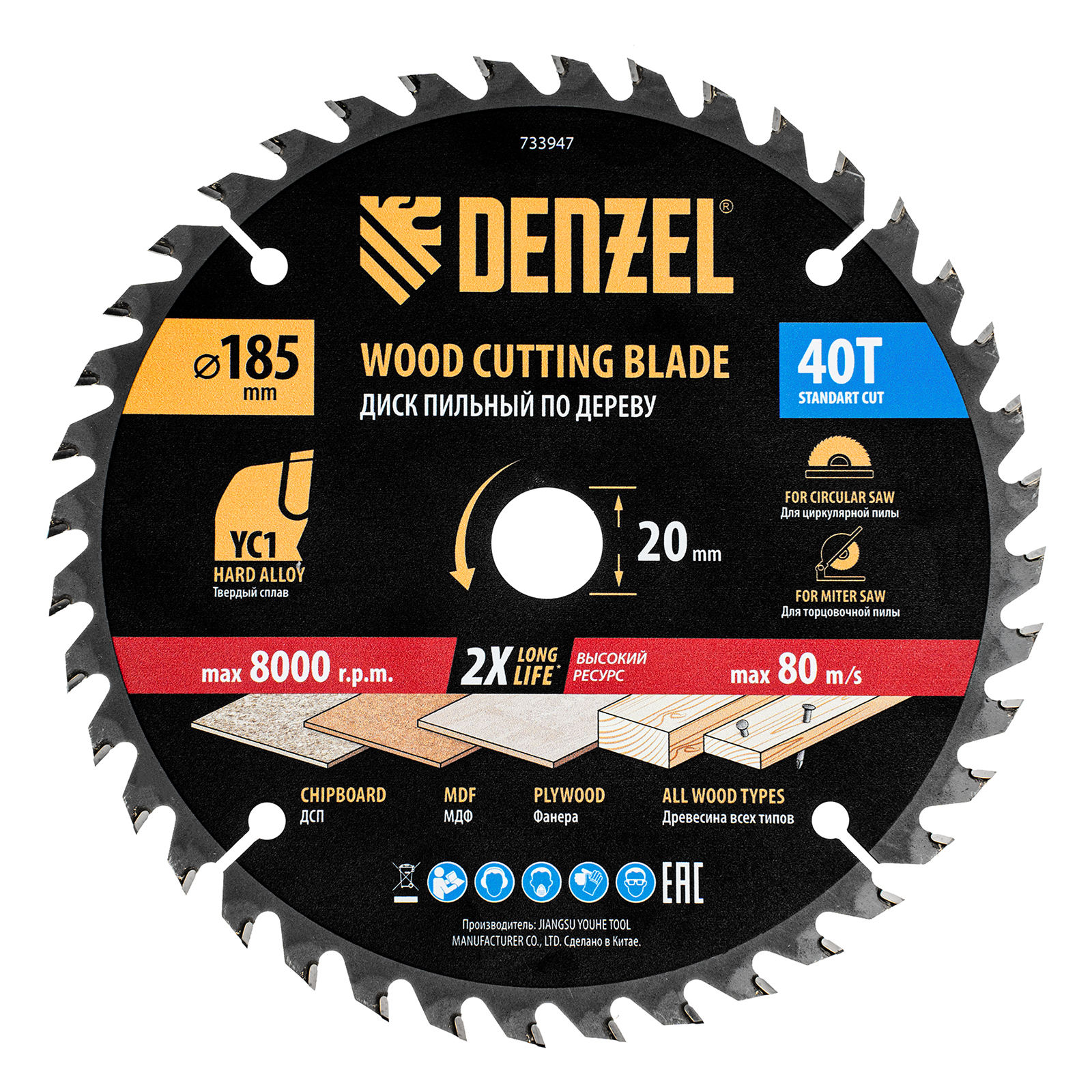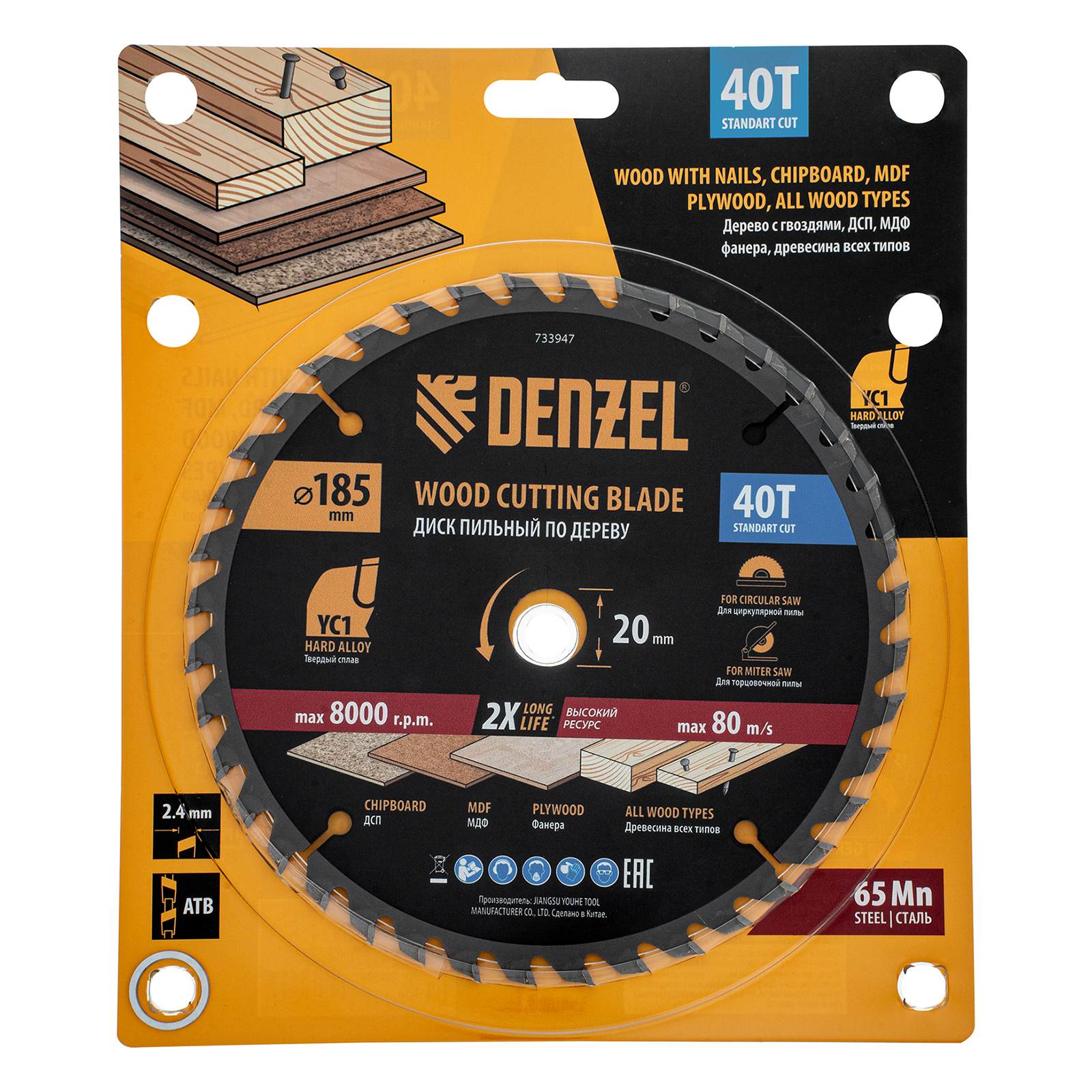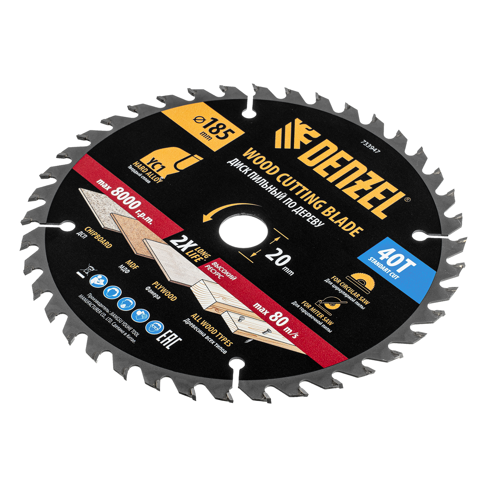 Пильный диск Denzel 733947 диаметром 185 x 20 мм, с 40 зубьями типа ATB, предназначен для продольного и поперечного распиливания древесины всех типов, в том числе с гвоздями и остатками бетона, а также ДСП, МДФ, фанеры. Тип реза — стандартный. Режущие пластины из твердого сплава YC1, прошедшие многоступенчатую заточку, позволяют успешно справляться с прочными материалами. Диск устанавливается на циркулярную, торцовочную пилу или на распиловочный станок. В комплект поставки входит переходное кольцо 20/16 мм, позволяющее изменить посадочный диаметр при необходимости.