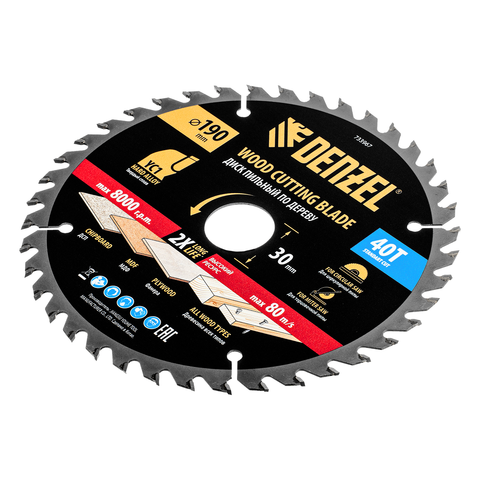 Пильный диск Denzel 733967 диаметром 190 x 30 мм, с 40 зубьями типа ATB, предназначен для продольного и поперечного распиливания древесины всех типов, в том числе с гвоздями и остатками бетона, а также ДСП, МДФ, фанеры. Тип реза — стандартный. Режущие пластины из твердого сплава YC1, прошедшие многоступенчатую заточку, позволяют успешно справляться с прочными материалами. Диск устанавливается на циркулярную, торцовочную пилу или на распиловочный станок. В комплект поставки входит переходное кольцо 30/20 мм, позволяющее изменить посадочный диаметр при необходимости.