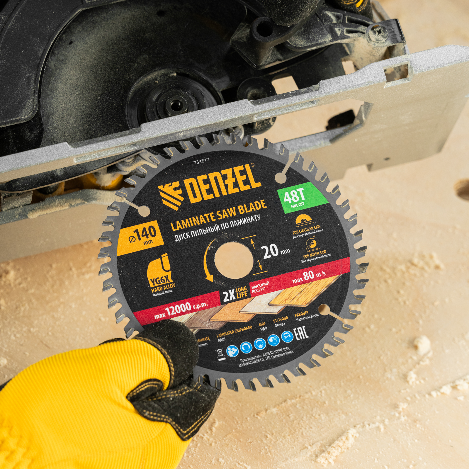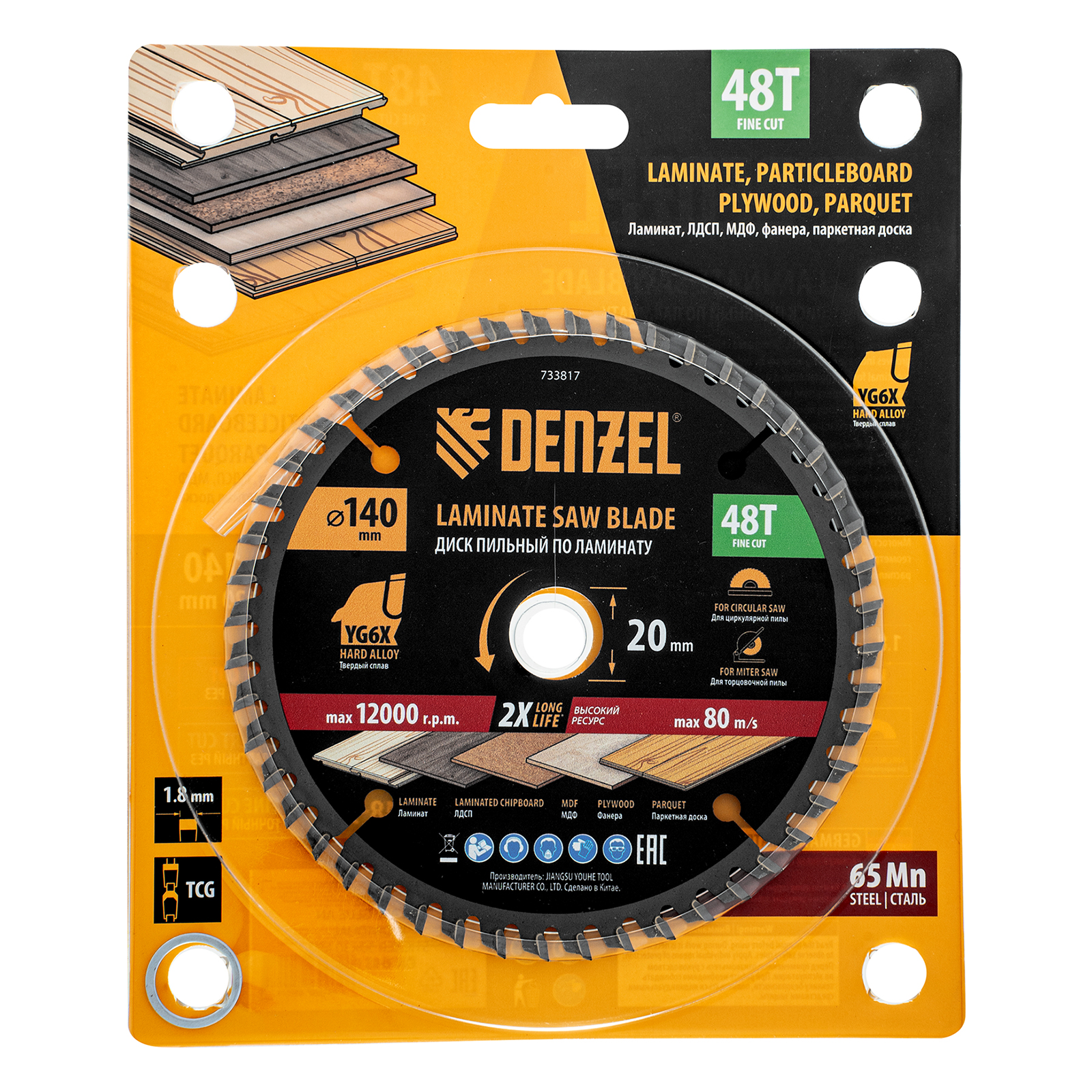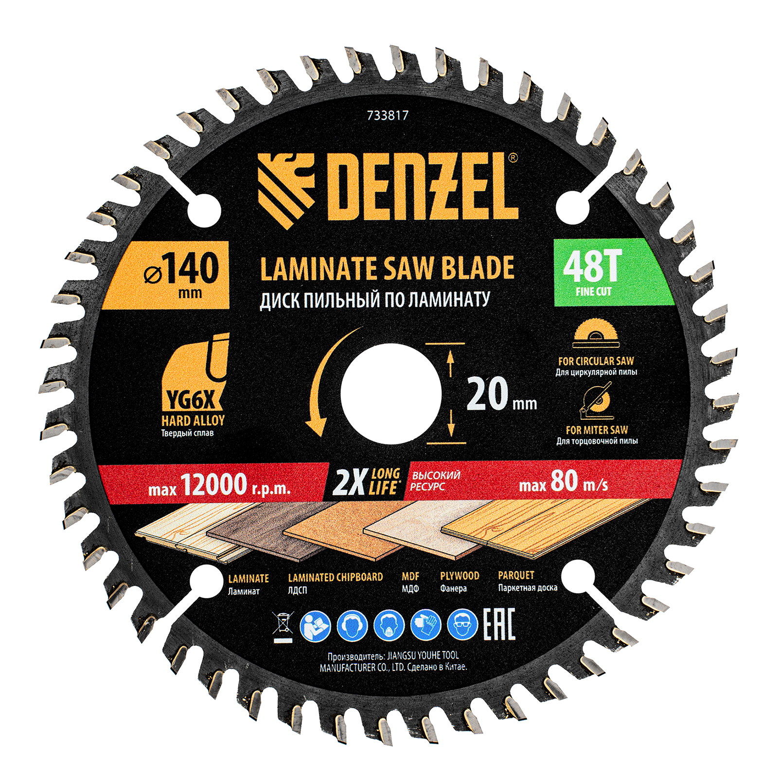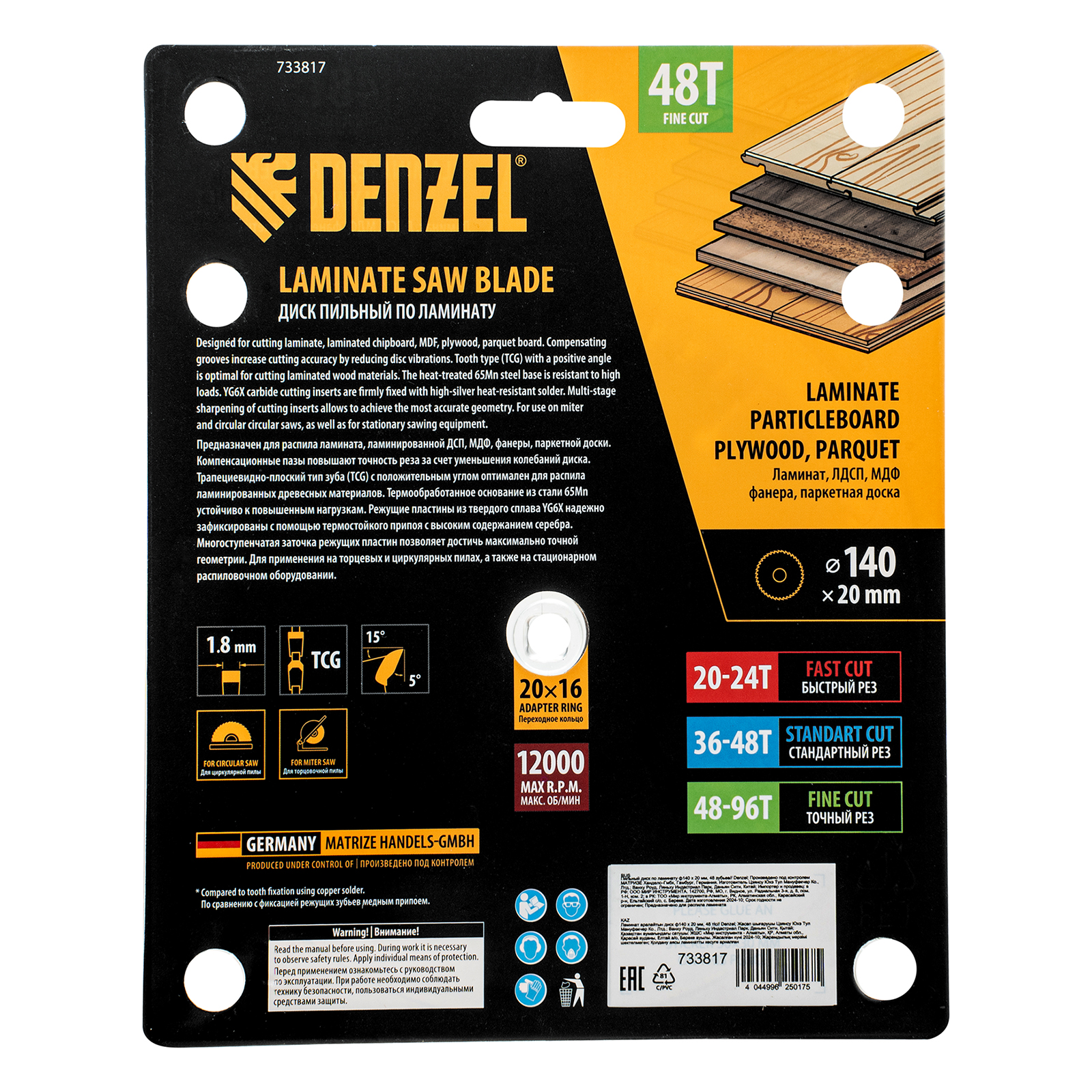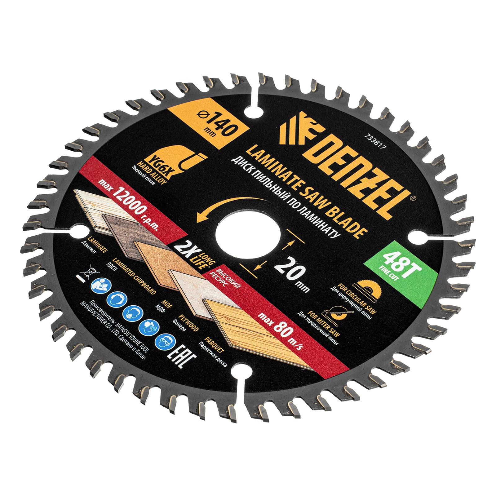 Пильный диск Denzel 733817 диаметром 140 x 20 мм, с 48 зубьями, используется для распиливания ламината, ЛДСП, МДФ, фанеры, паркетной доски. 48 трапециевидно-плоских зубьев с положительным углом заточки позволяют эффективно решать поставленные задачи, обеспечивая чистый рез. Тип реза — стандартный. Диск устанавливается на циркулярную или торцовочную пилу, а также на распиловочный станок. Можно установить оснастку на инструмент с другим посадочным диаметром — для этого предусмотрено переходное кольцо 20/16 мм.