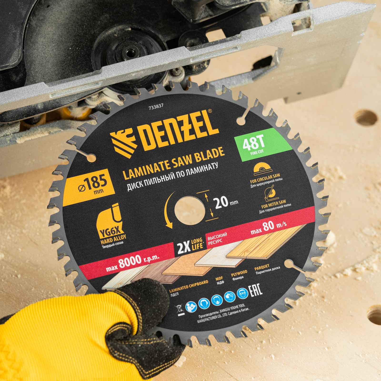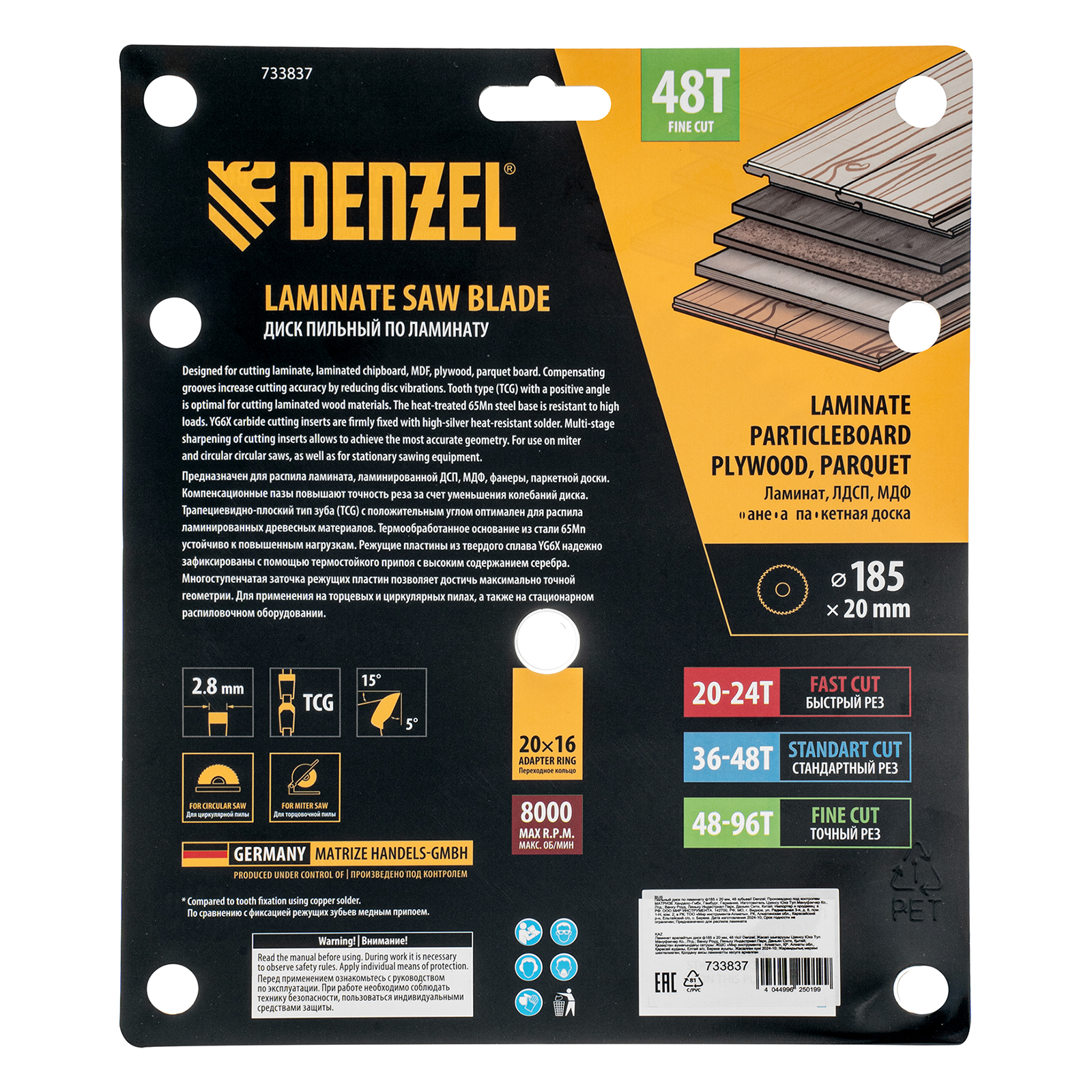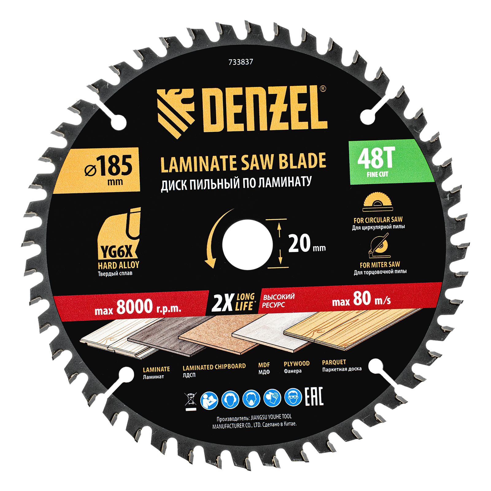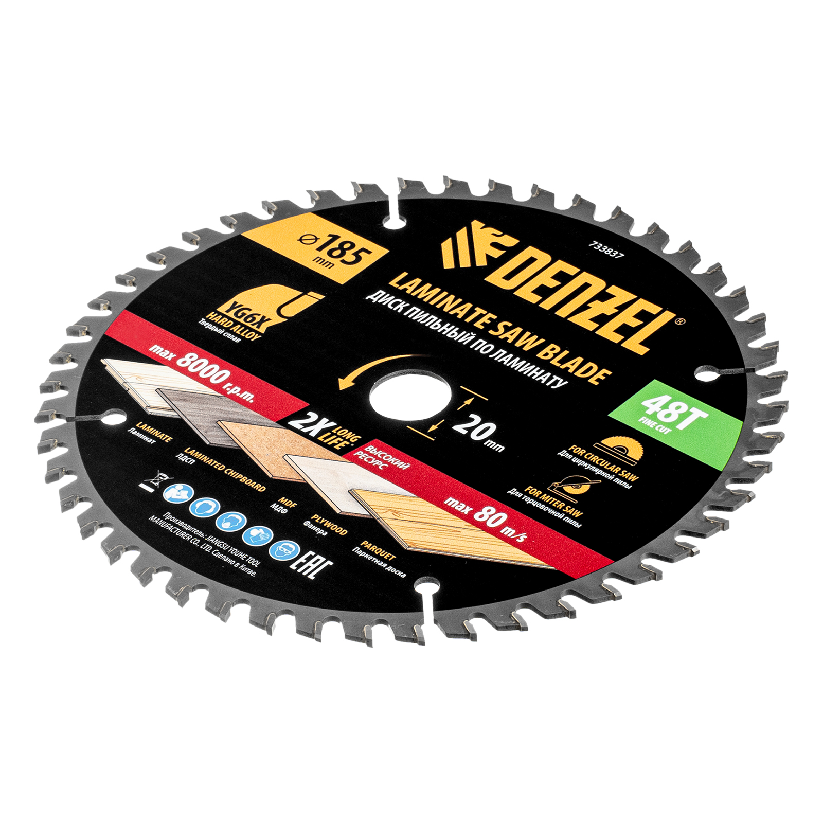 Пильный диск Denzel 733837 диаметром 185 x 20 мм, с 48 зубьями, используется для распиливания ламината, ЛДСП, МДФ, фанеры, паркетной доски. 48 трапециевидно-плоских зубьев с положительным углом заточки позволяют эффективно решать поставленные задачи, обеспечивая чистый рез. Тип реза — стандартный. Диск устанавливается на циркулярную или торцовочную пилу, а также на распиловочный станок. Можно установить оснастку на инструмент с другим посадочным диаметром — для этого предусмотрено переходное кольцо 20/16 мм.