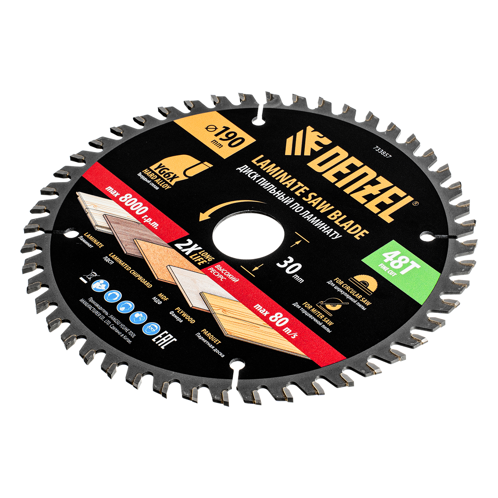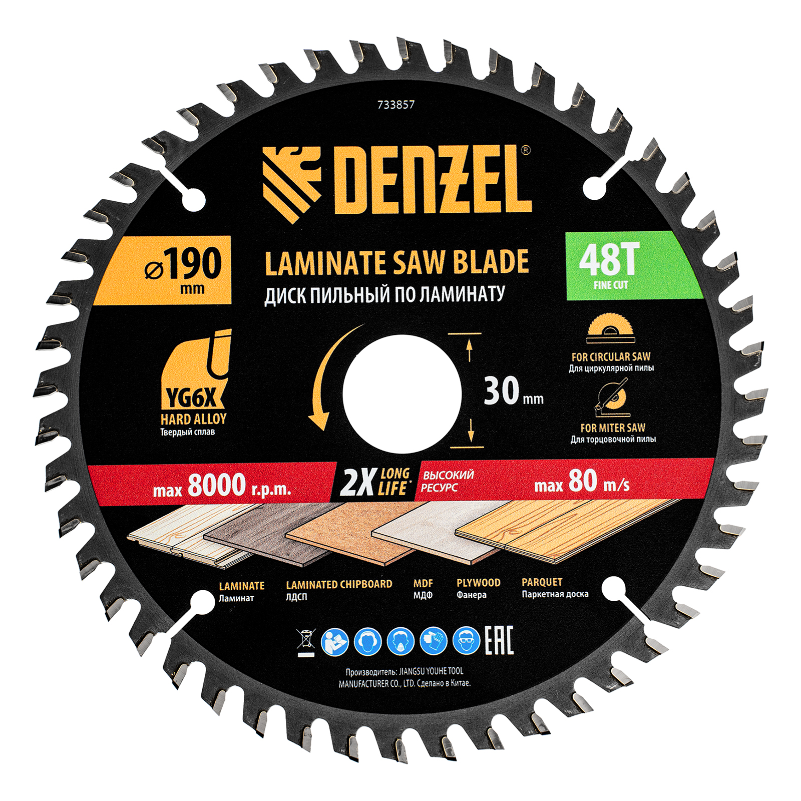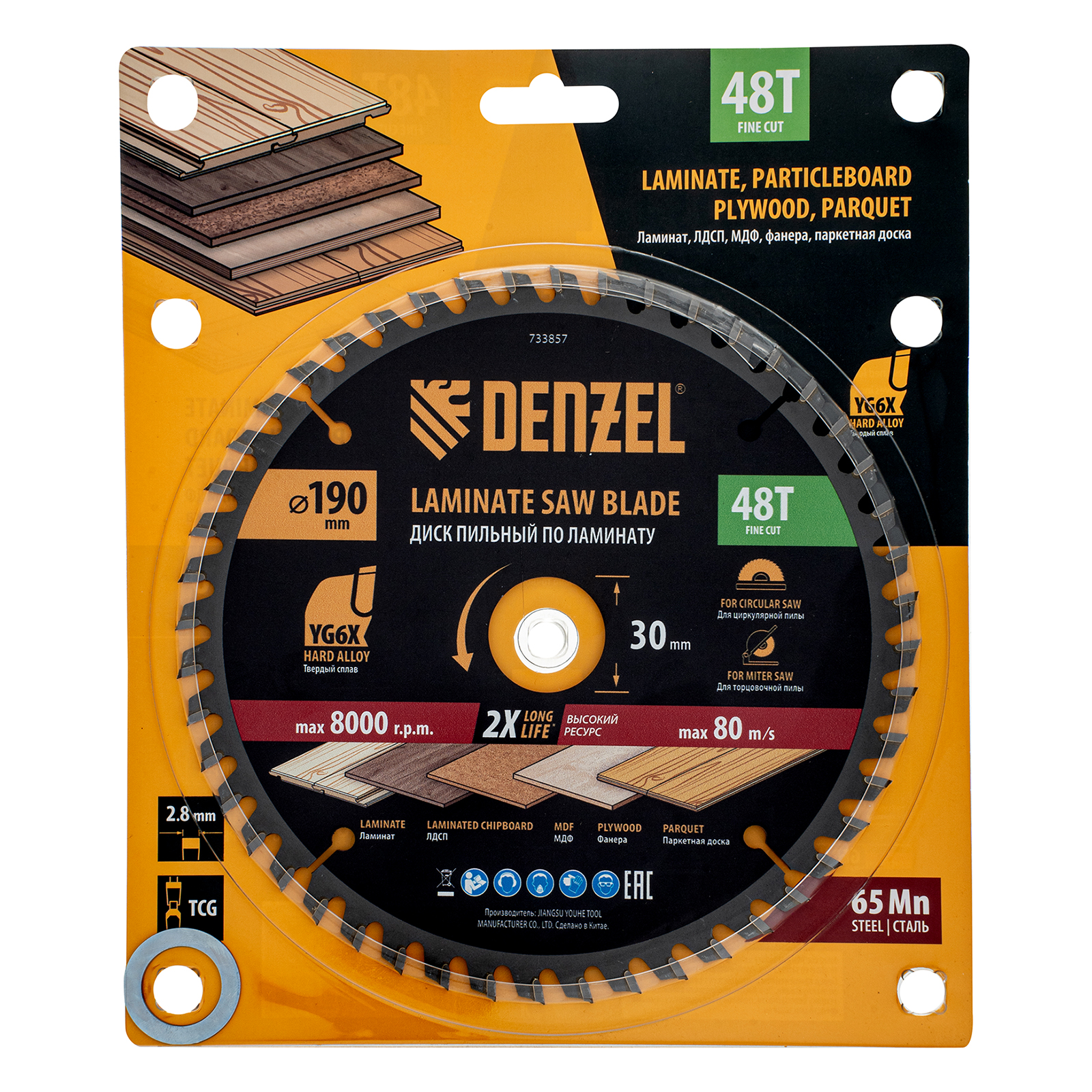 Пильный диск Denzel 733857 диаметром 190 x 30 мм, с 48 зубьями, используется для распиливания ламината, ЛДСП, МДФ, фанеры, паркетной доски. 48 трапециевидно-плоских зубьев с положительным углом заточки позволяют эффективно решать поставленные задачи, обеспечивая чистый рез. Тип реза — стандартный. Диск устанавливается на циркулярную или торцовочную пилу, а также на распиловочный станок. Можно установить оснастку на инструмент с другим посадочным диаметром — для этого предусмотрено переходное кольцо 30/20 мм.