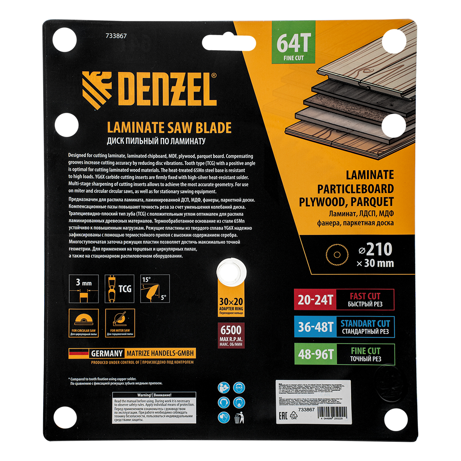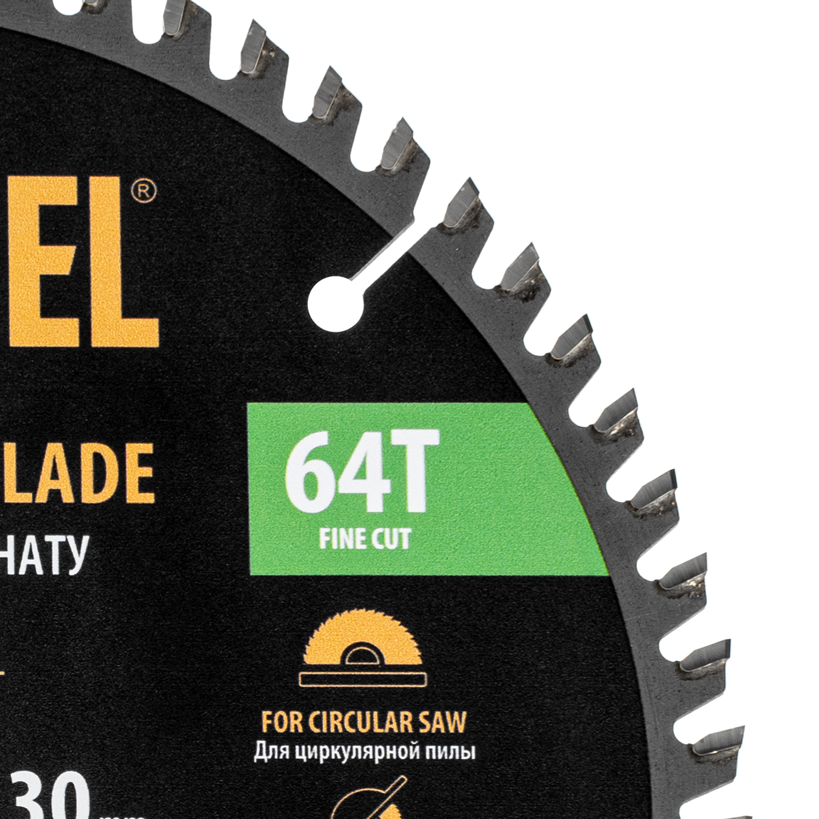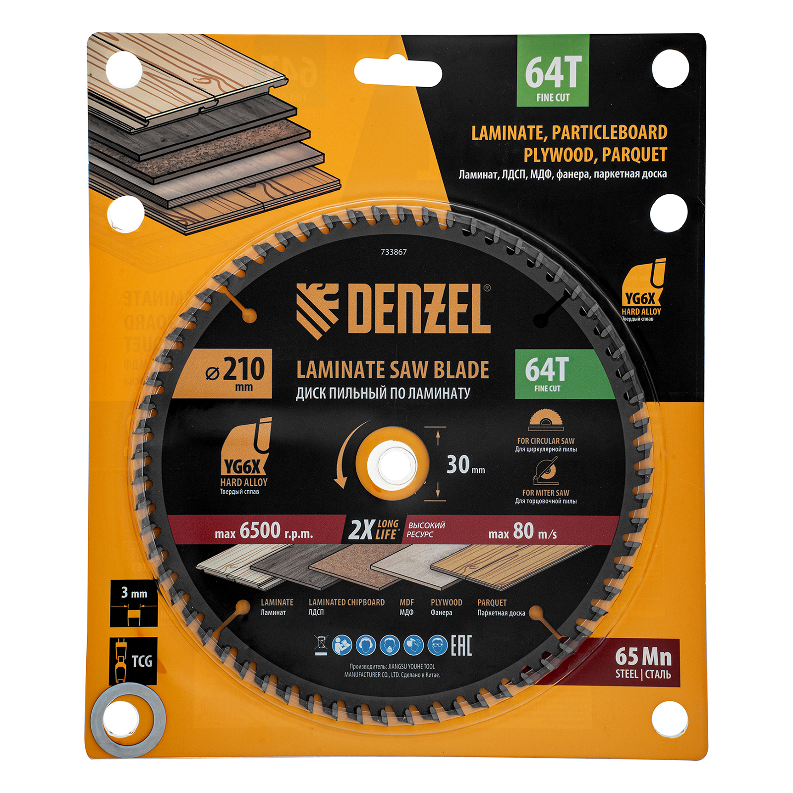 Пильный диск Denzel 733867 диаметром 210 x 30 мм, с 64 зубьями, используется для точного распиливания ламината, ЛДСП, МДФ, фанеры, паркетной доски. 64 мелких трапециевидно-плоских зубьев с положительным углом заточки позволяют эффективно решать поставленные задачи, обеспечивая чистый рез. Диск устанавливается на циркулярную или торцовочную пилу, а также на распиловочный станок. Можно установить оснастку на инструмент с другим посадочным диаметром — для этого предусмотрено переходное кольцо 30/20 мм.