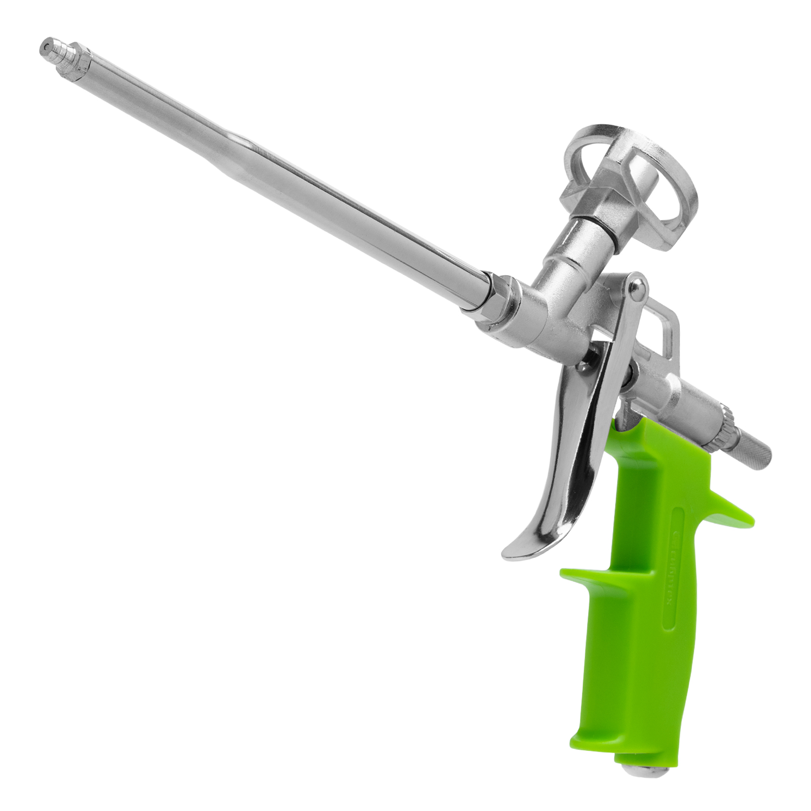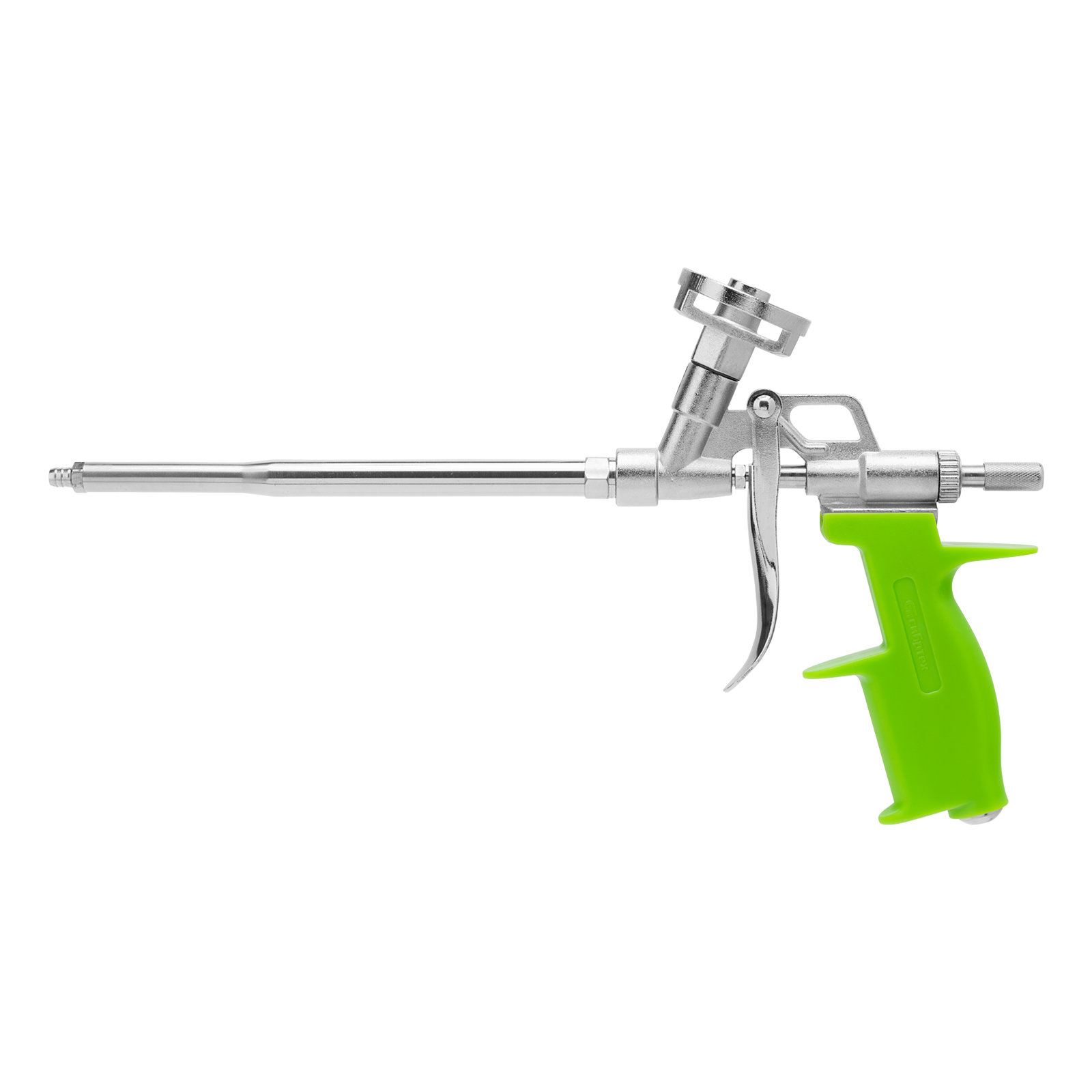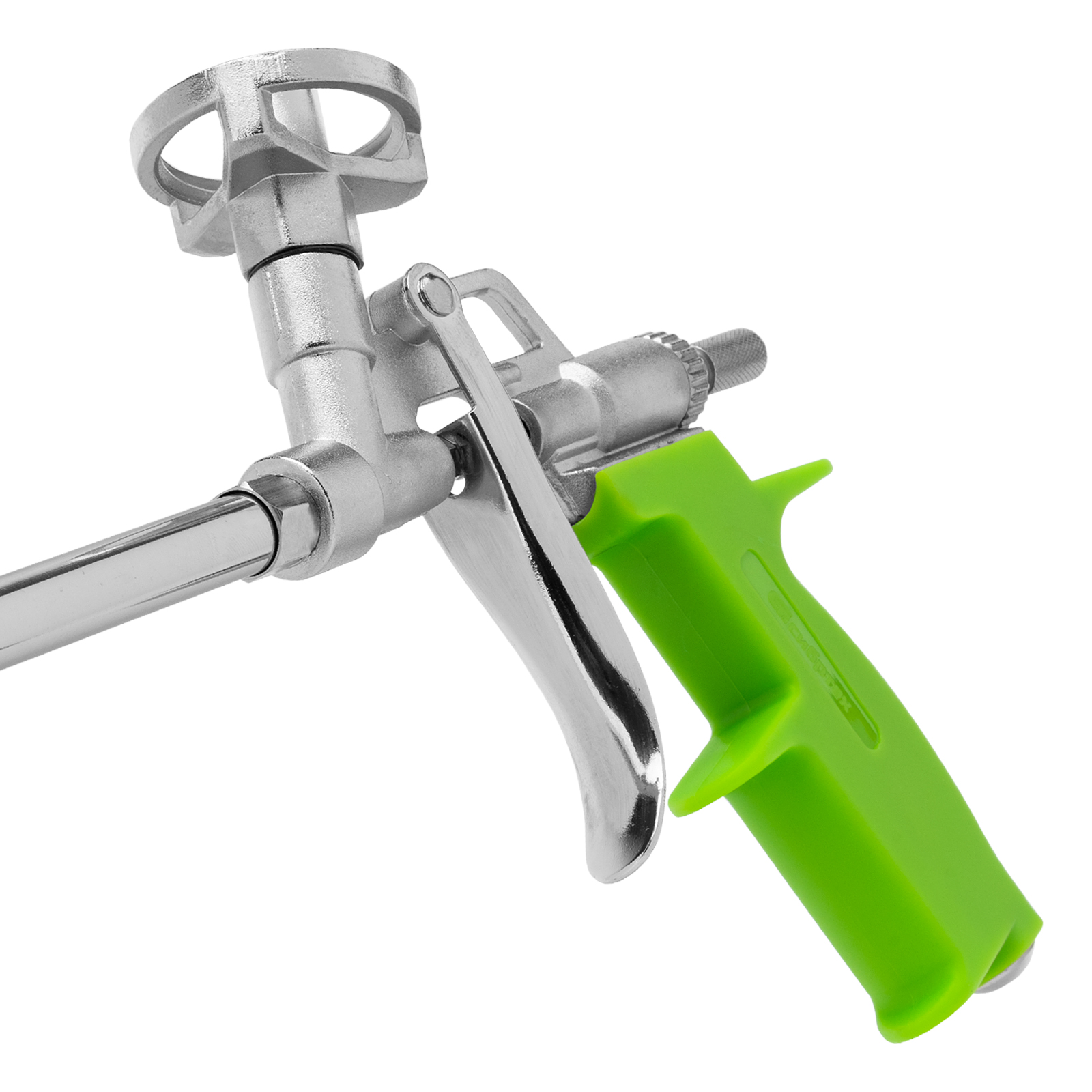 - Контроль скорости и объема выпуска монтажной пены — производитель предусмотрел трещоточный винт-регулятор.