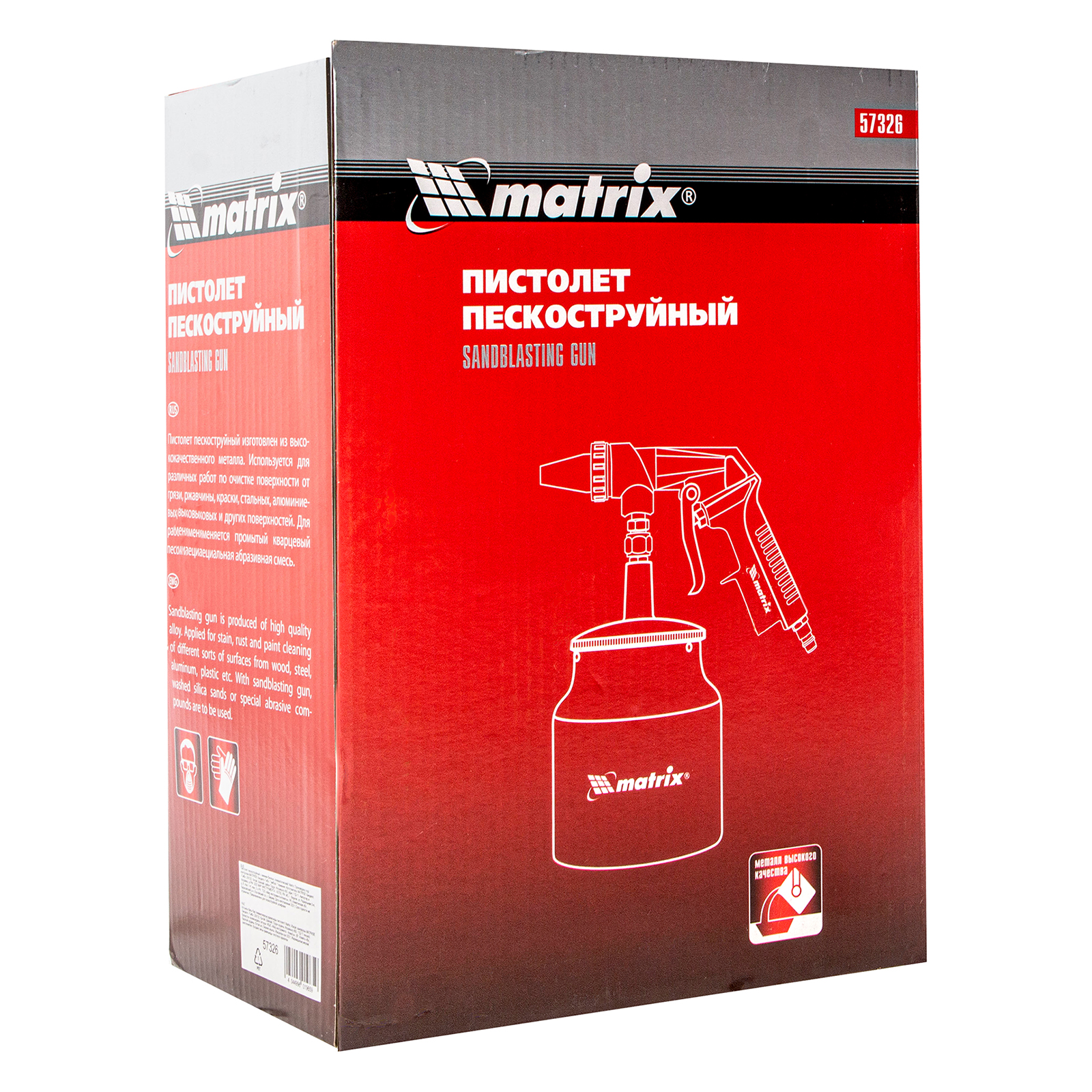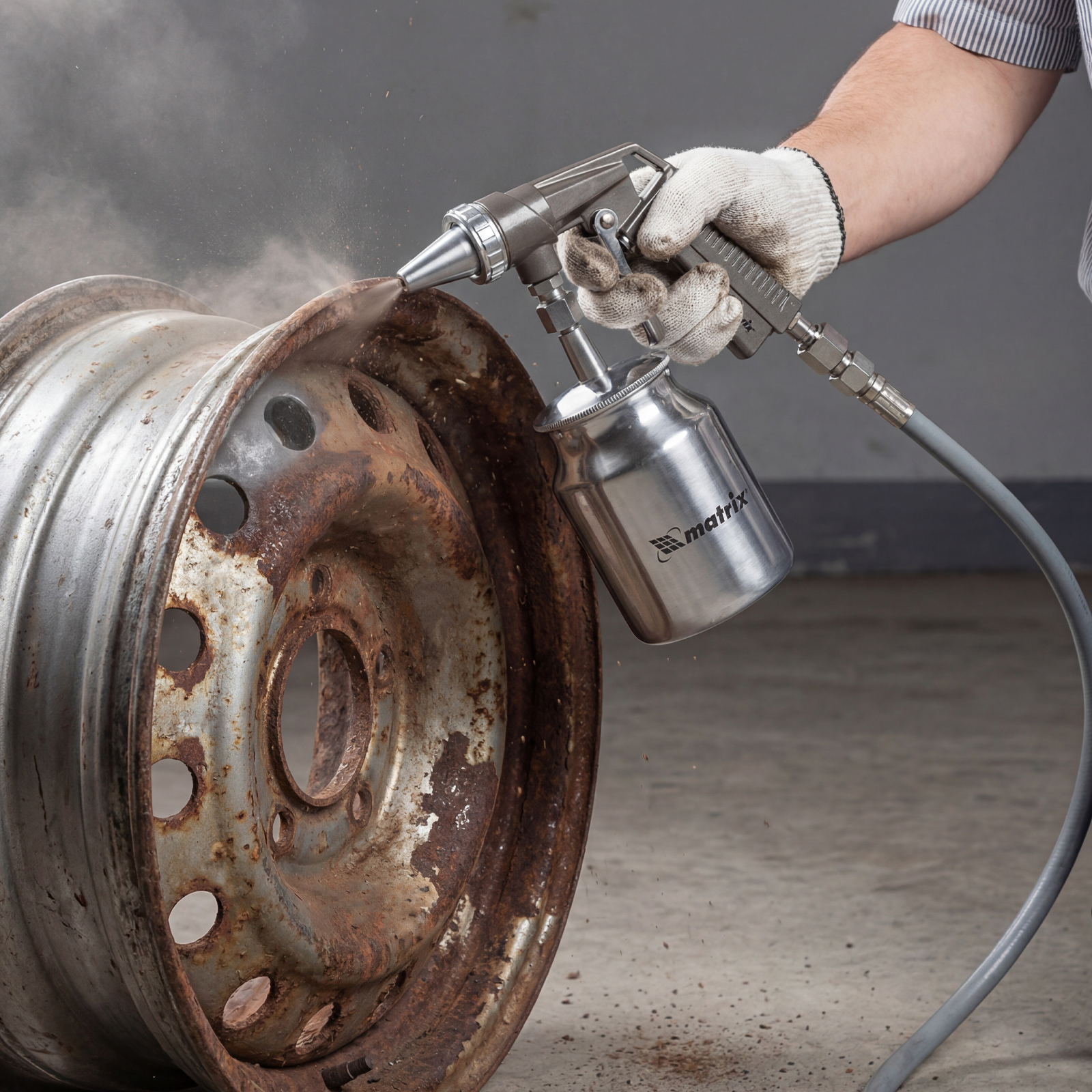 Пескоструйный пистолет Matrix 57326 используется для очищения загрязненных поверхностей, удаления краски, очагов коррозии и ржавчины с помощью кварцевого песка или специального абразива размером до 1,6 мм. Встроенный бачок для песка объемом 1000 мл делает пистолет мобильным и избавляет мастера от необходимости присоединять дополнительный шланг.
