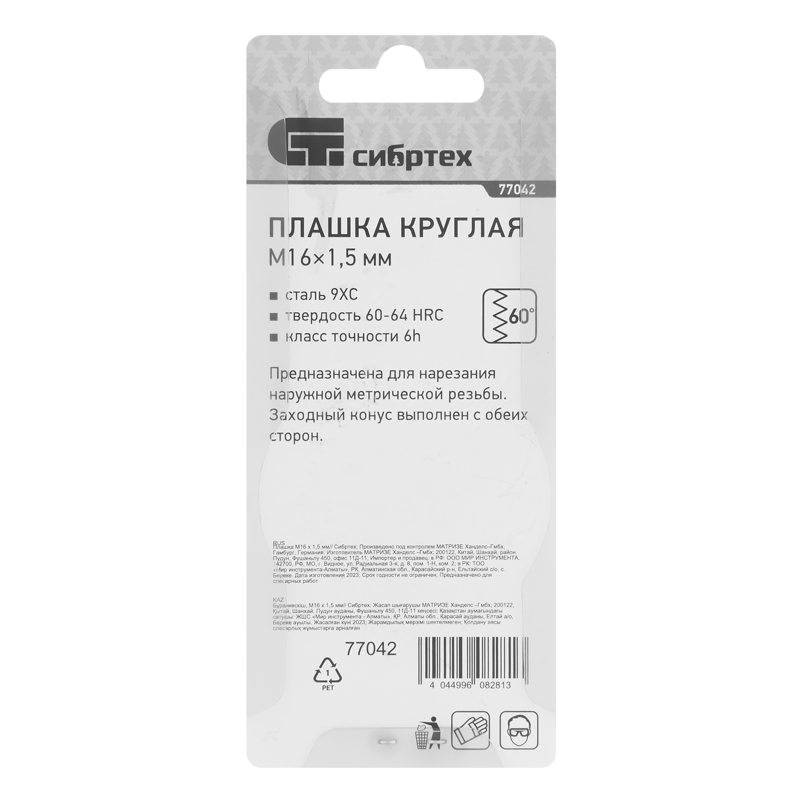 Плашка Сибртех 77042 типоразмера М16 х 1,5 мм предназначена для нарезания внешней метрической резьбы. Проста в использовании, поэтому пригодится даже начинающему мастеру для проведения слесарных и монтажных работ в быту. Цельная конструкция плашки позволяет полностью захватить деталь и нарезать высокоточную резьбу за один проход.