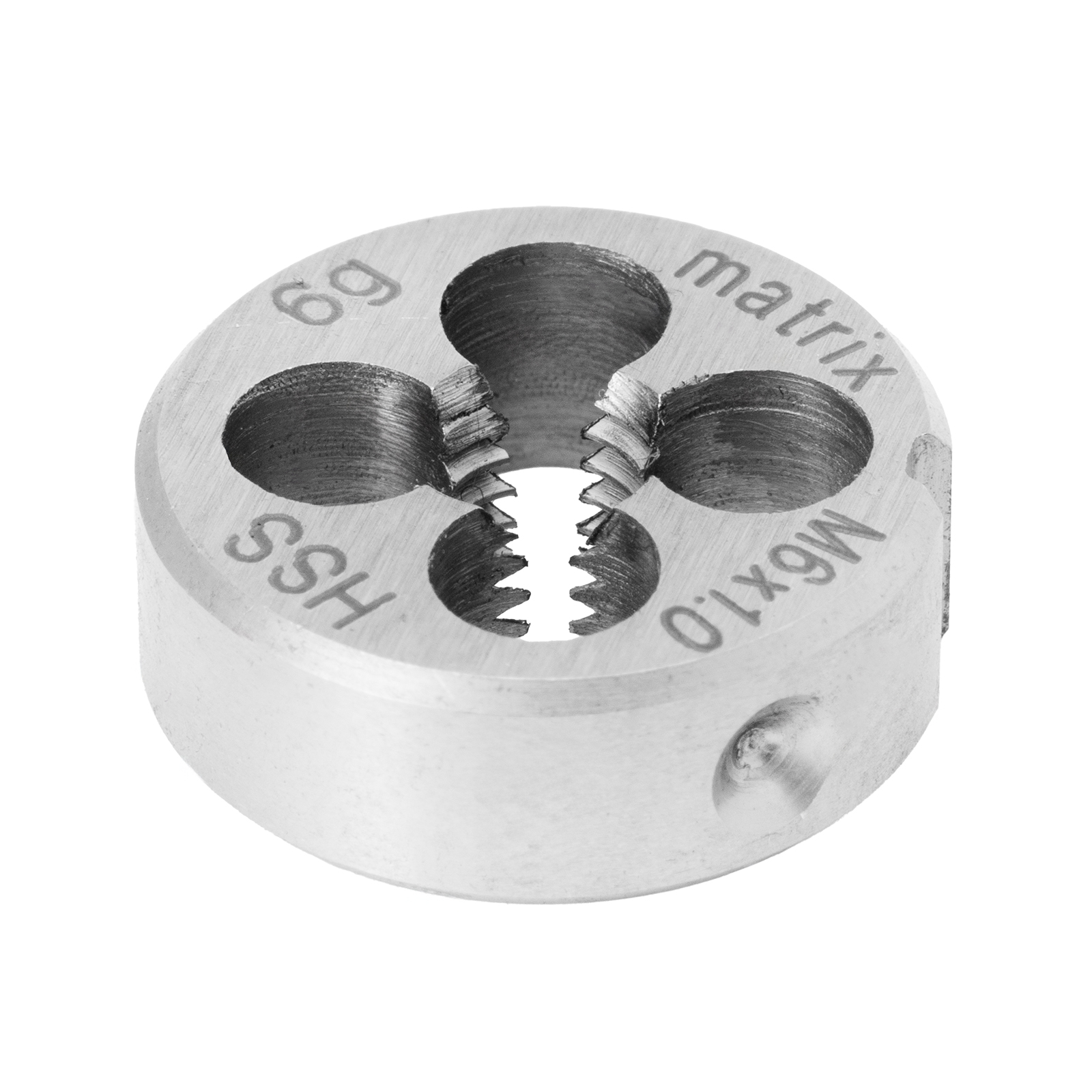 Плашка Matrix 77075 типоразмера М6 х 1,0 мм, из стали HSS, — резьбонарезной инструмент, предназначенный для восстановления старой или создания новой внешней метрической резьбы на металлических деталях. Для эксплуатации плашки не требуются особые навыки, что позволяет выполнять слесарные и монтажные работы в домашних условиях. Цельный корпус обеспечивает жесткое сцепление с деталью для получения высококачественной резьбы.
