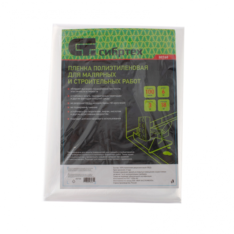 Полиэтиленовая пленка Сибртех 88768 размером 3 х 6 м и плотностью 100 мкм используется для проведения малярных и строительных работ. Применяется для укрывания поверхностей, оконных рам, дверей мебели и других предметов для защиты от строительного мусора и краски. Также будет полезна при транспортировке грузов.
