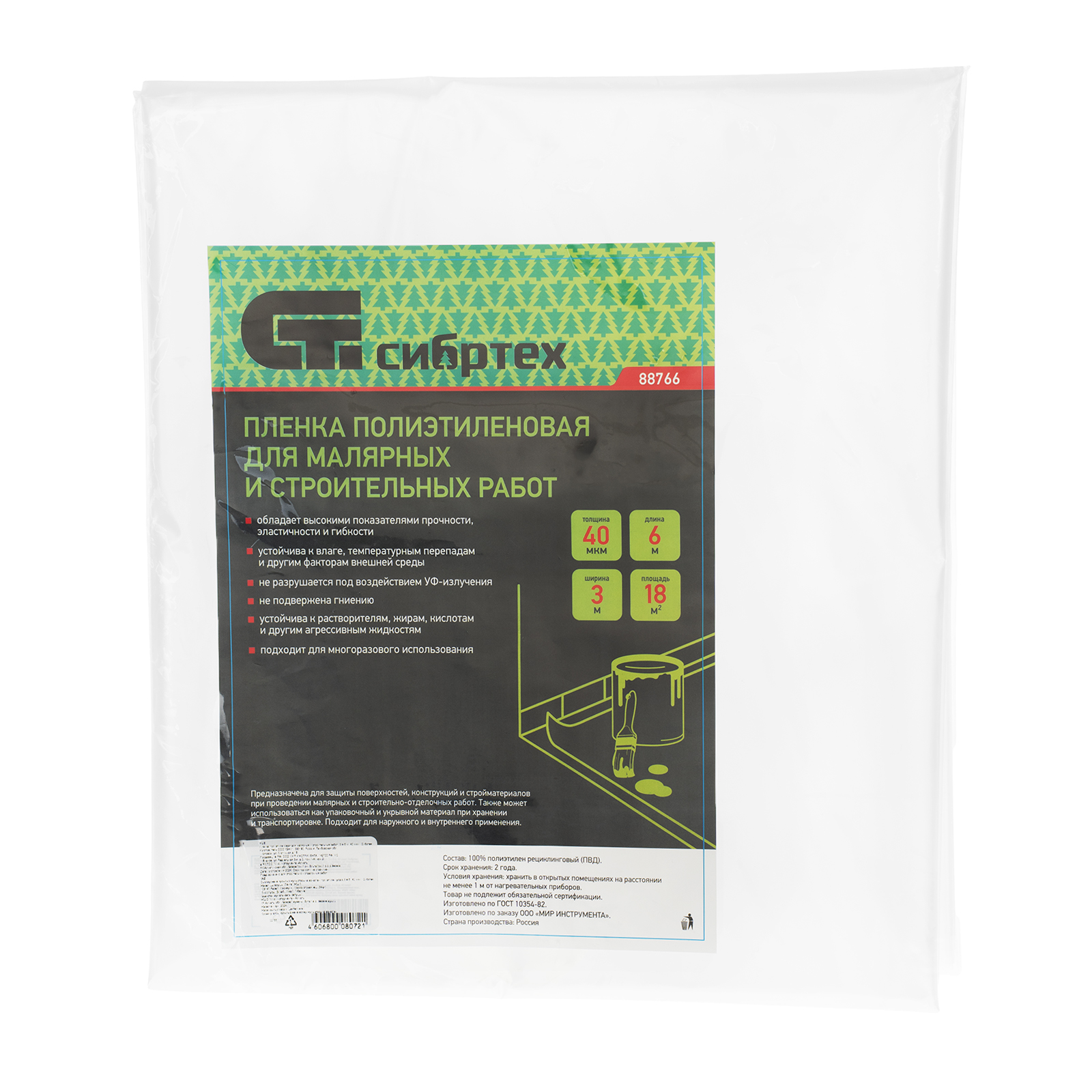 Полиэтиленовая пленка Сибртех 88766 размером 3 х 6 м и плотностью 40 мкм используется для проведения малярных и строительных работ. Применяется для укрывания поверхностей, оконных рам, дверей мебели и других предметов для защиты от строительного мусора и краски. Также будет полезна при транспортировке грузов.