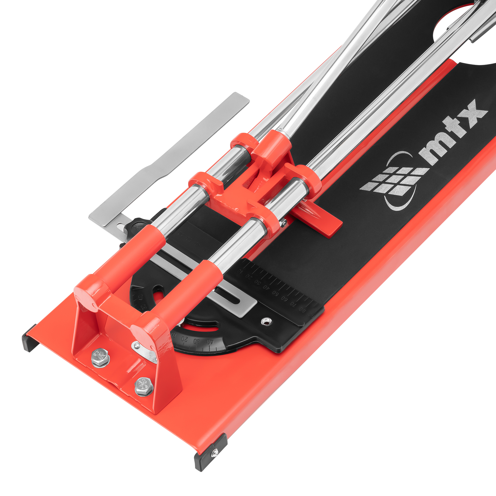 - Неподвижность плитки — плиткорез с широким основанием снабжен мягкими амортизирующими накладками, угольник-угломер дополнительно фиксирует заготовку.