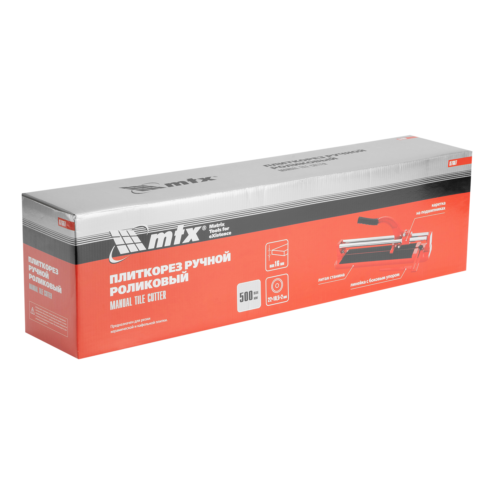 Плиткорез MTX 87607 с литой станиной, кареткой на подшипниках и усиленной рукояткой, используется для резки кафельной плитки размером до 500 х 16 мм. Ходовая каретка представляет собой массивный цельнолитой закрытый корпус, внутри которого размещаются цилиндрические шариковые подшипники, благодаря которым каретка перемещается по направляющим свободно даже при их загрязнении. Отсутствие люфтов в каретке позволяет выполнять рез максимально точно. Инструмент будет полезен мастерам в ходе бытовых облицовочных работ.