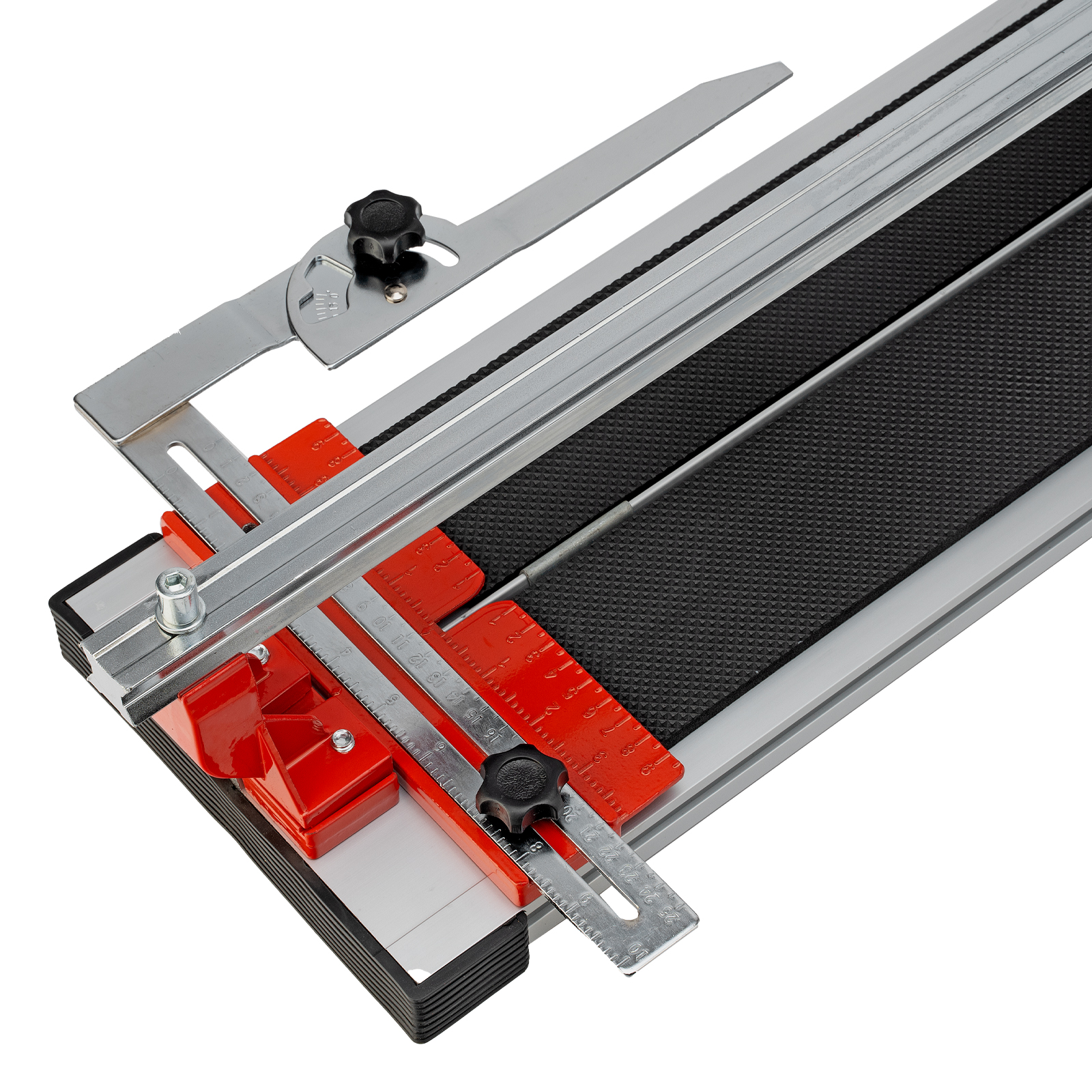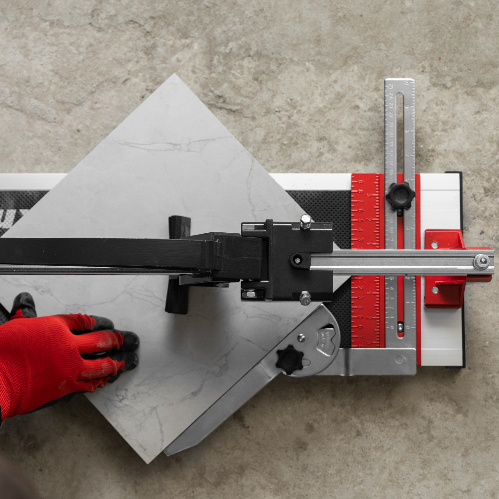 - Резка под углом до 45° — производителем предусмотрен поворотный угольник-угломер, обеспечивающий также дополнительную фиксацию плитки.