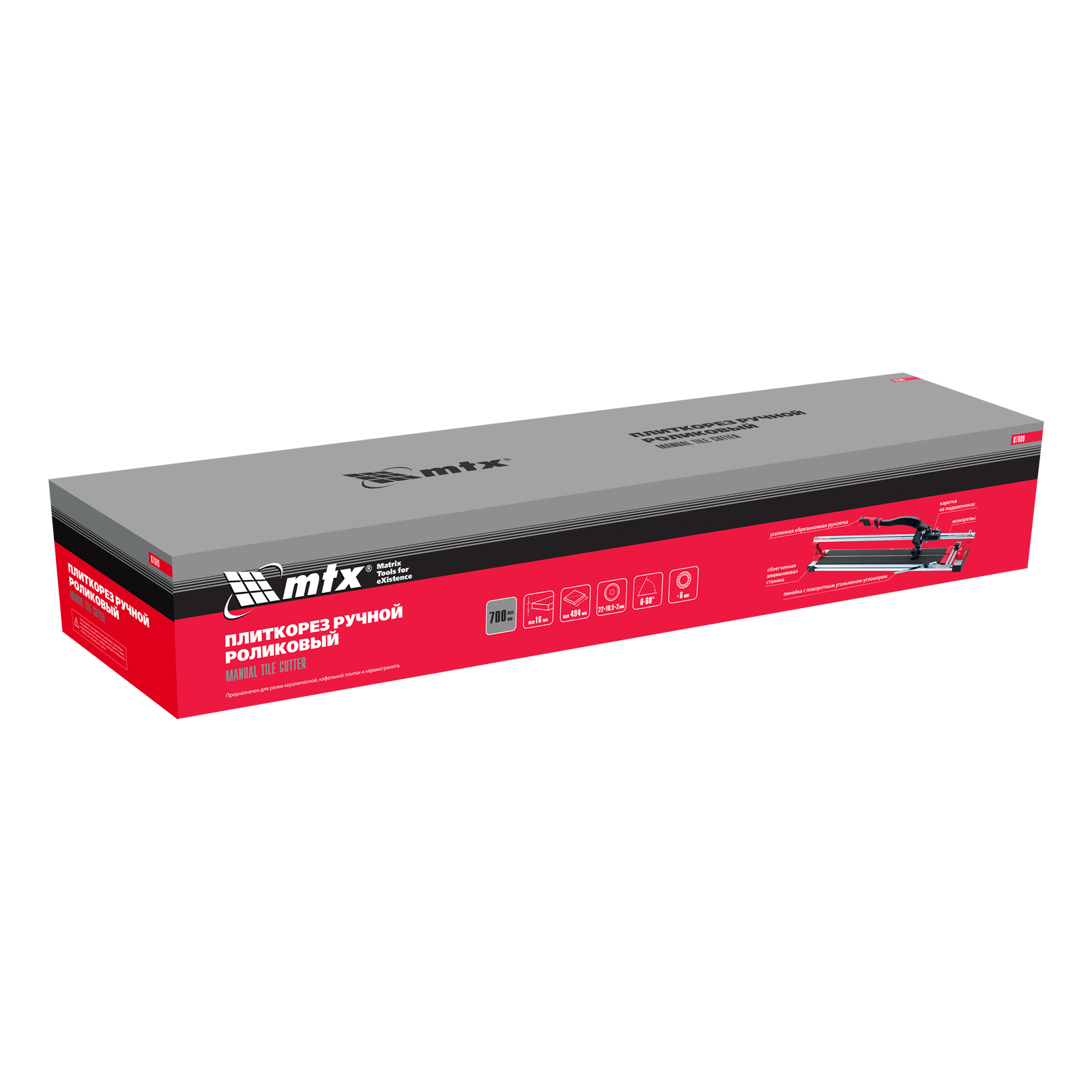 Рельсовый плиткорез MTX 87689 способен резать плитку длиной до 700 мм и толщиной до 16 мм для придания ей необходимых размеров. Мощный разделитель справляется с резкой не только керамической, но и керамогранитной плитки. Продуманная конструкция позволяет производить разлом в любой точке поверхности плитки. Инструмент используется во время проведения облицовочных работ.