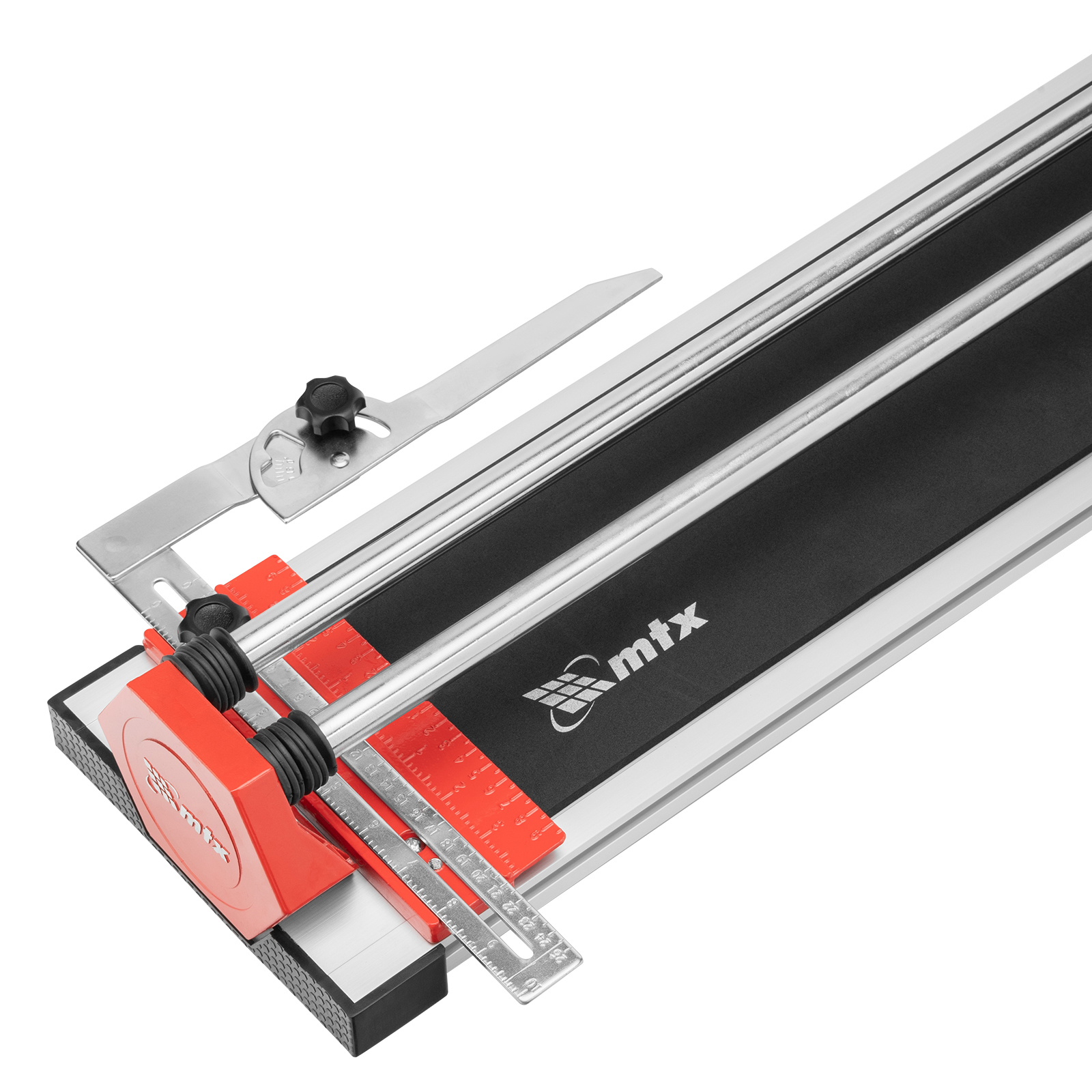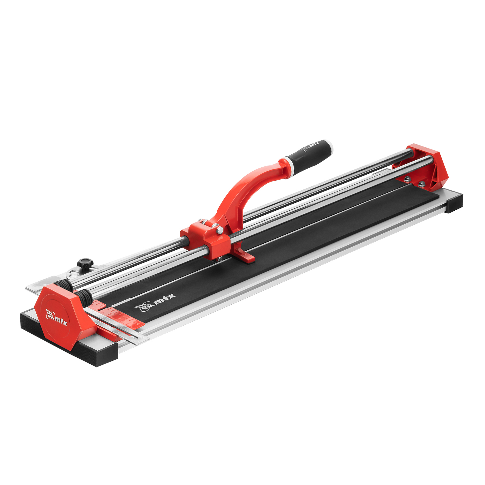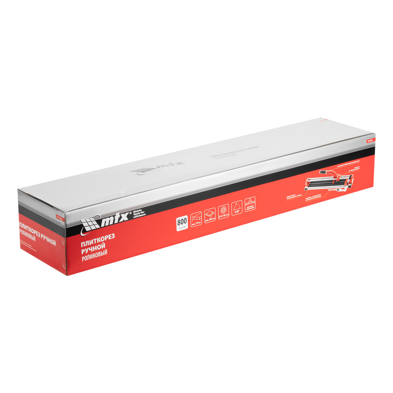 Ручной плиткорез MTX 87583 с кареткой на подшипниках, усиленной рукояткой и облегченной алюминиевой станиной, предназначен для резки плитки из кафеля и керамогранита длиной до 800 мм и толщиной до 14 мм. Благодаря регулируемому боковому упору удобен для серийной резки. Ролик из твердого сплава ВК8 на подшипниках обеспечивает максимальное качество реза. Инструмент подходит для бытового и профессионального использования, оптимален для выполнения больших объемов облицовочных работ.