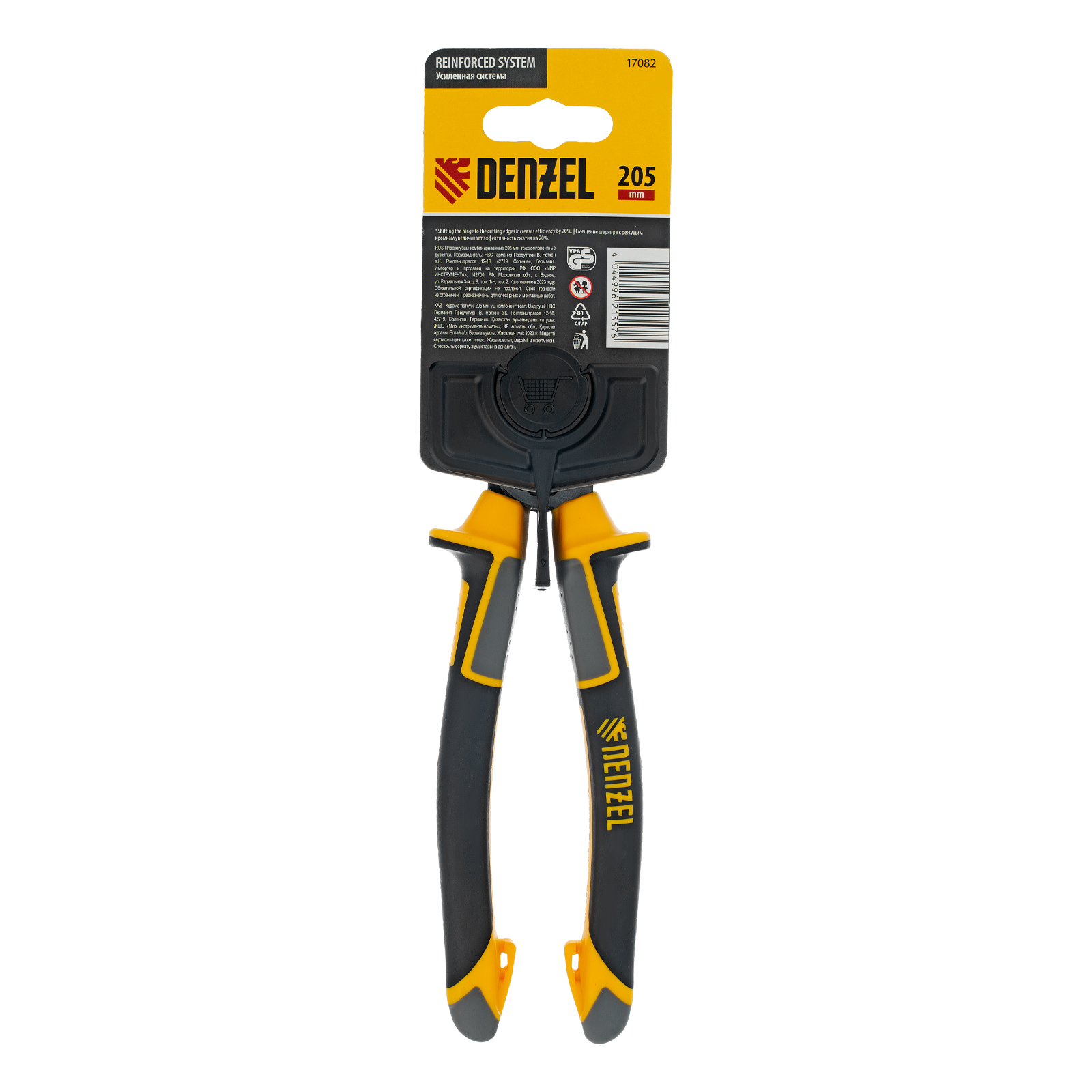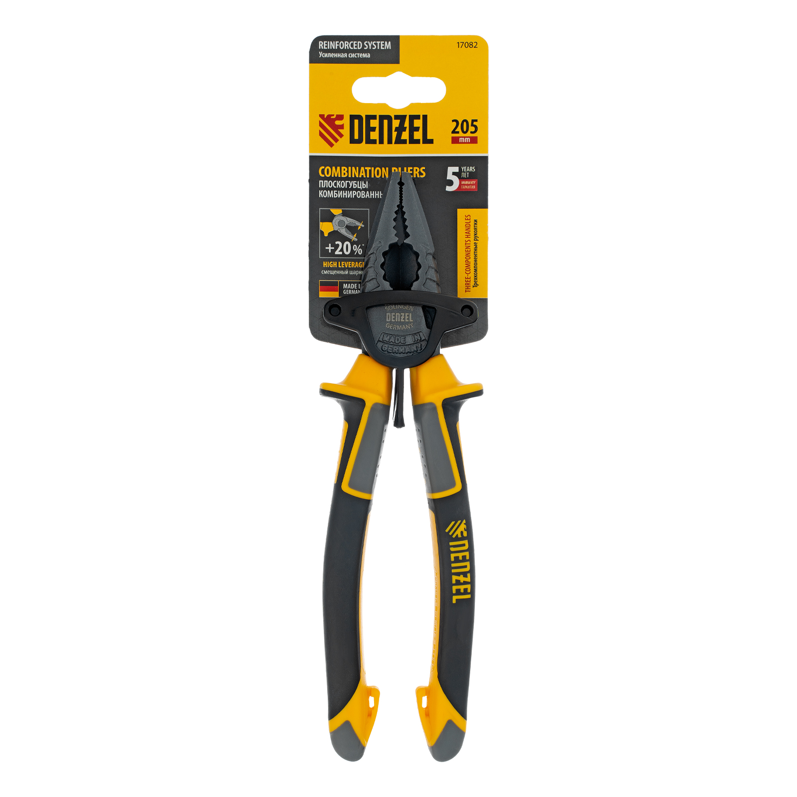 Комбинированные плоскогубцы Denzel 17082 длиной 205 мм, с трехкомпонентными рукоятками, используются для зажима и удержания деталей, сгибания металлических листов. Позволяют также перекусывать мягкую проволоку (алюминиевую, медную, с пределом прочности 220 Н/мм2) диаметром до 5,9 мм, проволоку средней жесткости и гвозди (750 Н/мм2) диаметром до 3,8 мм, а также жесткую (1800 Н/мм2) толщиной до 2,5 мм. Имеют внутренние грани специальной формы, предназначенные для использования инструмента в качестве гаечного ключа. Губки с насечками надежно удерживают заготовки. Плоскогубцы пригодятся профессионалу и частному мастеру при проведении слесарных, ремонтных и сборочных работ.