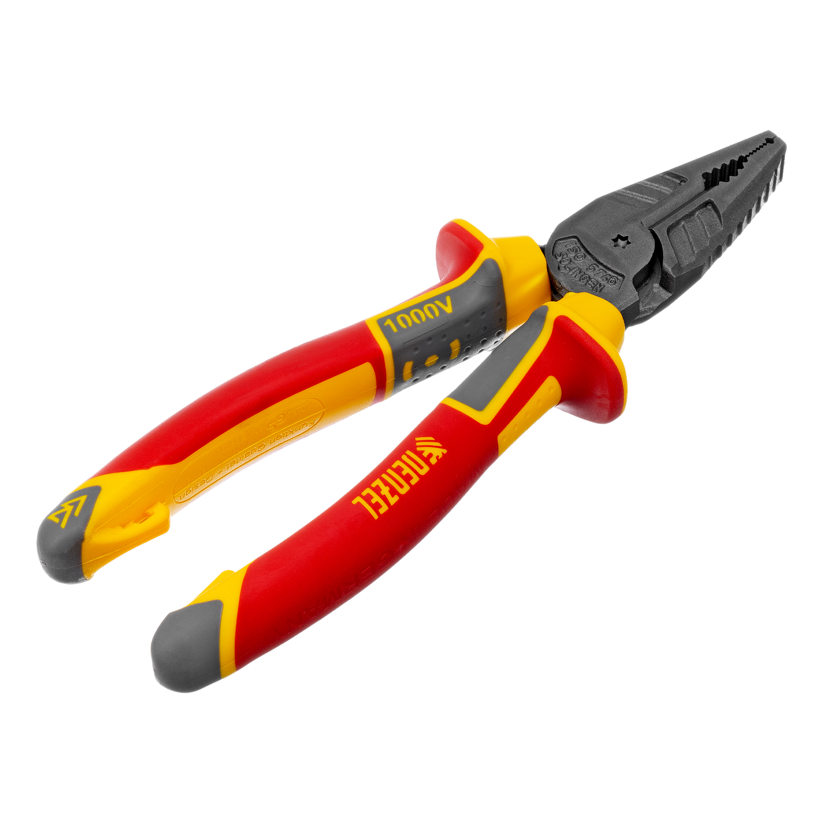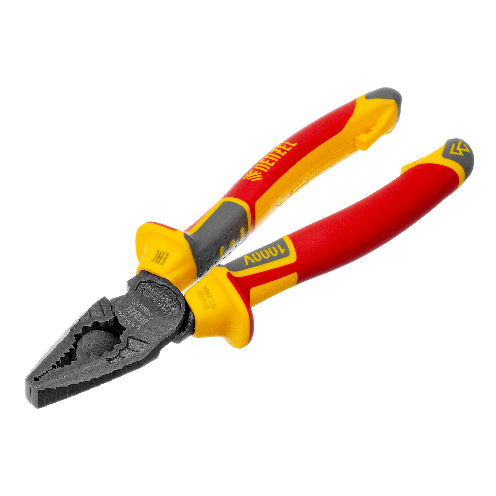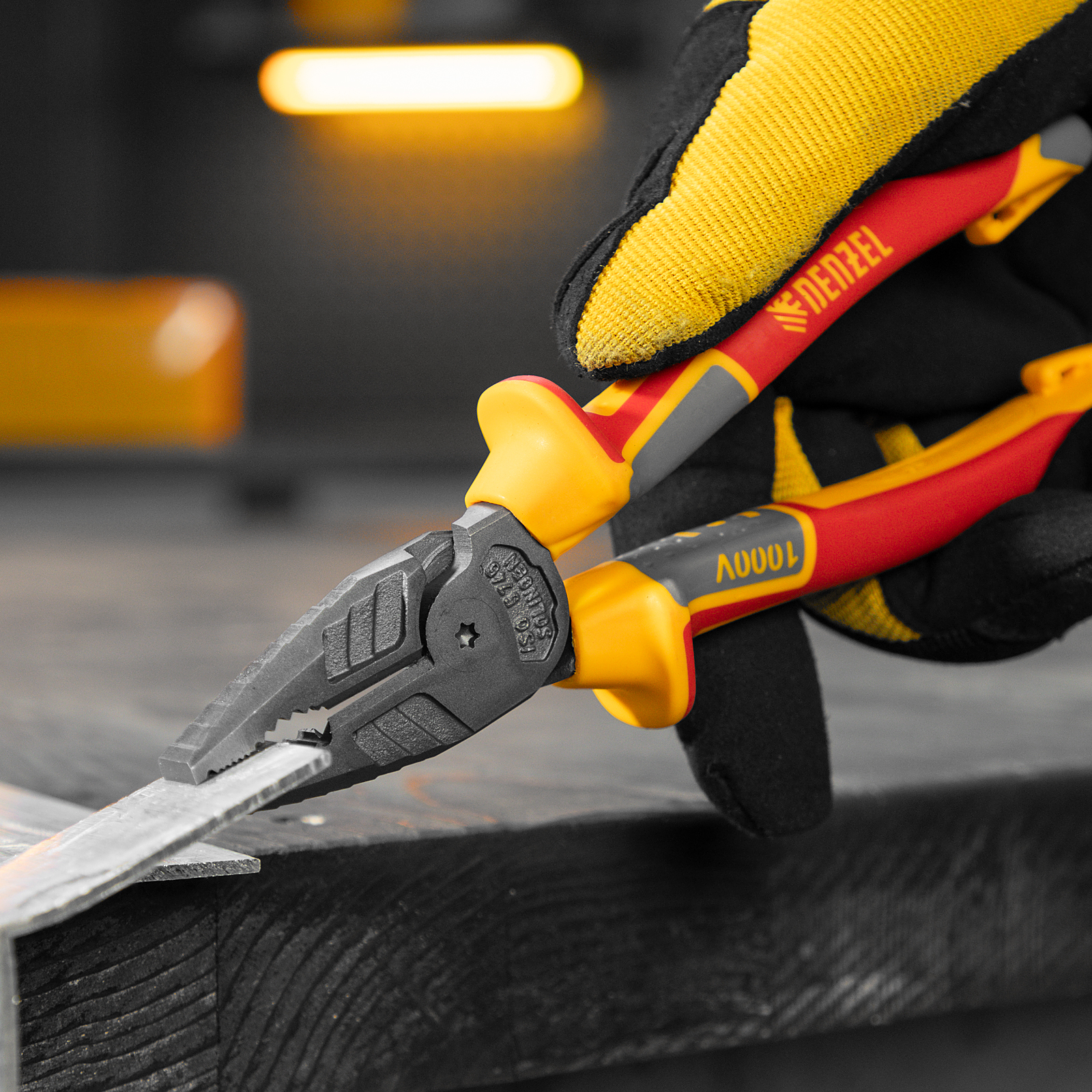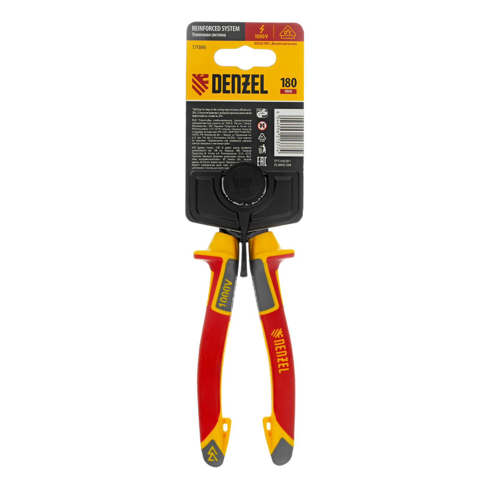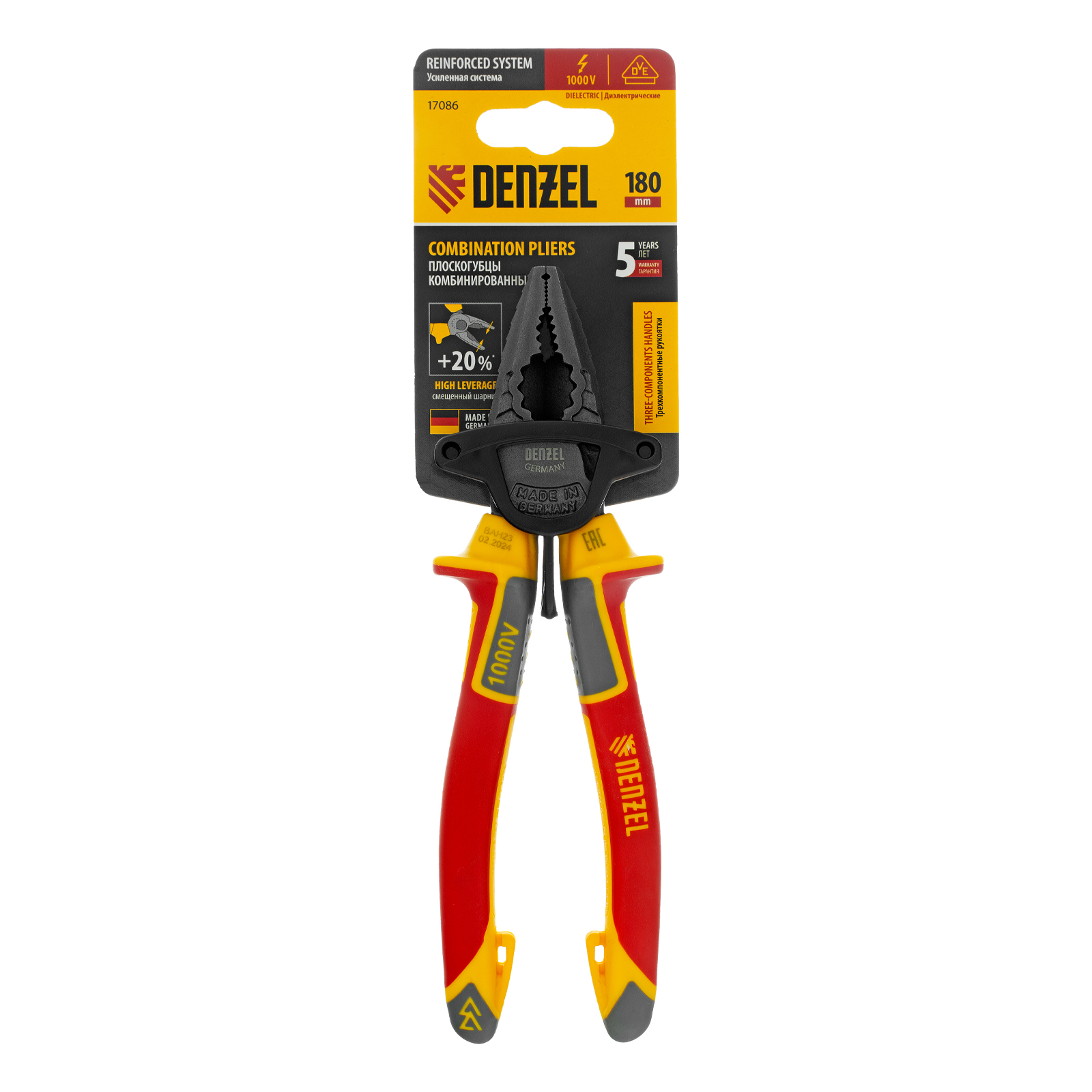 Комбинированные плоскогубцы Denzel 17086 длиной 180 мм, с диэлектрическими трехкомпонентными рукоятками, выдерживающими до 1000 В, предназначены для выполнения работ с токопроводящими элементами. С их помощью можно захватить или согнуть мелкие и крупные детали, перекусить проволоку или перерезать провод. Инструмент подходит для работы с мягкой проволокой (алюминиевой, медной, с пределом прочности 220 Н/мм2) диаметром до 5,2 мм, проволокой средней жесткости и гвоздями (750 Н/мм2) диаметром до 3,4 мм, и жесткой (предел прочности 1800 Н/мм2) толщиной до 2,2 мм. Также плоскогубцы можно использовать в качестве гаечного ключа. Инструмент незаменим для проведения слесарных и монтажных работ с различными компонентами и материалами. Внимание: перед началом работ следует отключить напряжение!