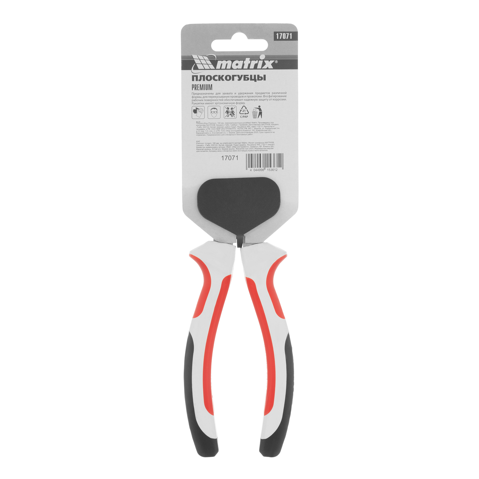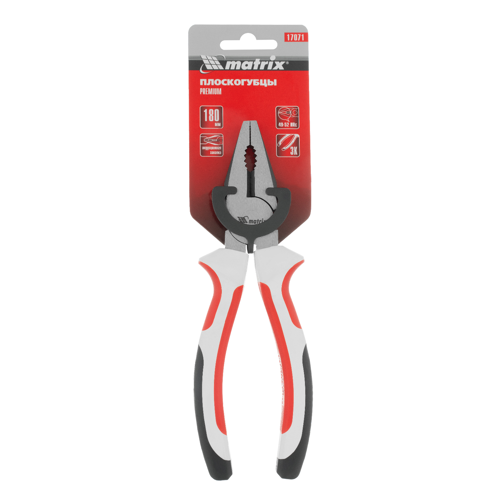 <p>Плоскогубцы Matrix Premium 17071 длиной 180 мм, с трехкомпонентными рукоятками, удобны для фиксации и удерживания небольших деталей, а также для перекусывания проволоки и проводов. Губки с острыми насечками не соскальзывают с поверхности, а специальные выемки позволяют захватывать круглые предметы. Инструмент будет полезен на строительной площадке, в слесарной и столярной мастерской, автосервисе, а также пригодится в домашнем хозяйстве.</p><h2>Преимущества</h2><ul><li>Высокий показатель прочности — плоскогубцы изготовлены из углеродистой стали 45.</li><li>Устойчивость к деформациям — рабочие части прошли индукционную закалку, имеют твердость около 46 HRC и выдерживают сильное сжатие.</li><li>Защита от коррозии — стальные части обработаны методом чернения.</li><li>Комфорт во время работы — трехкомпонентные рукоятки с широкими упорами не выскальзывают из рук.</li></ul>