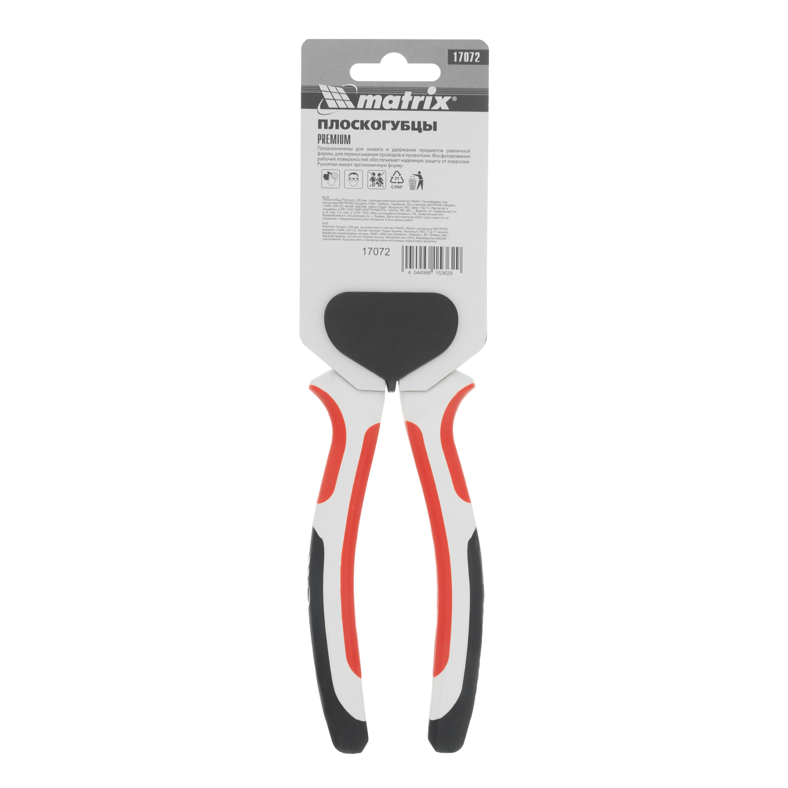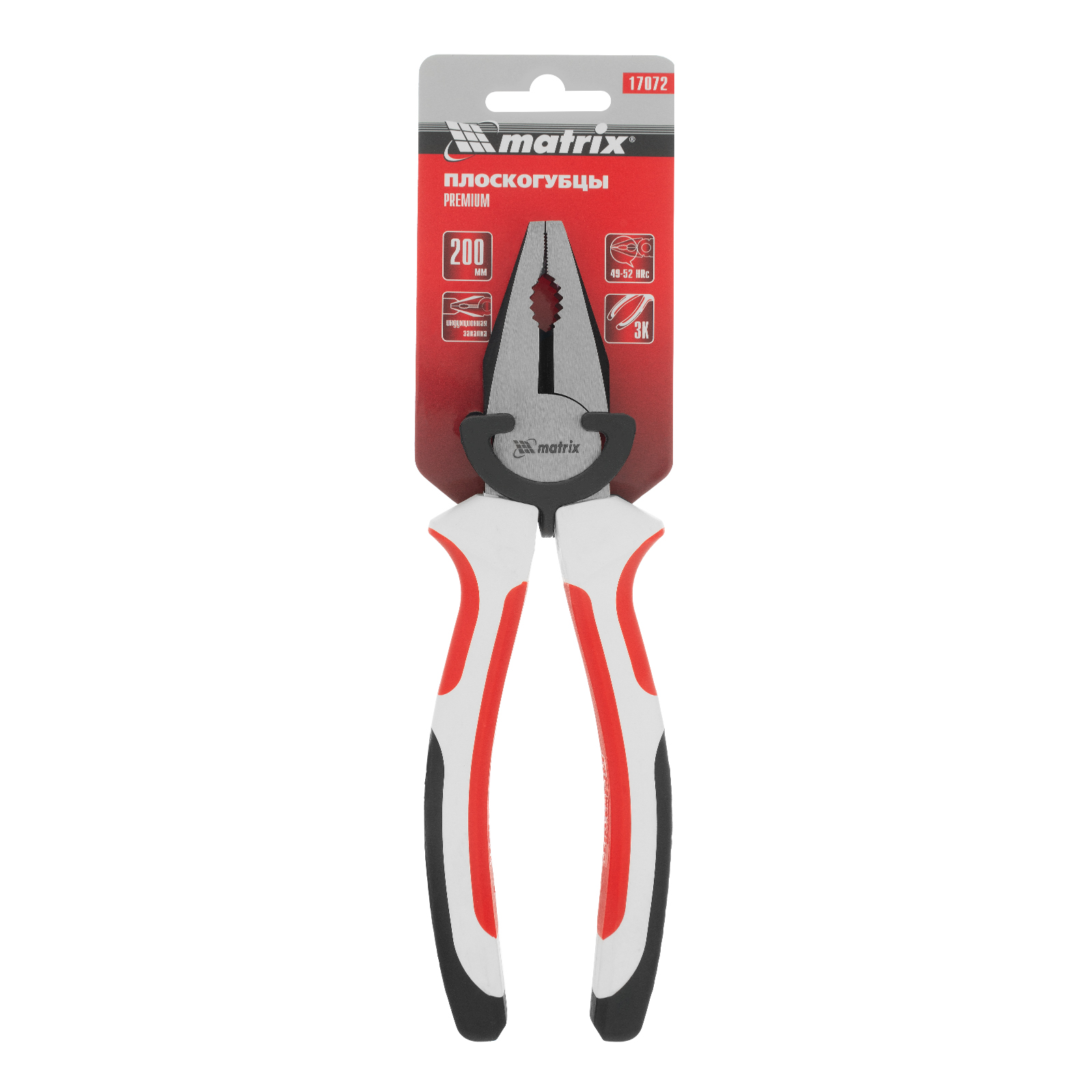 <p>Плоскогубцы Matrix Premium 17072 длиной 200 мм, с трехкомпонентными рукоятками, удобны для фиксации и удерживания небольших деталей, а также для перекусывания проволоки и проводов. Губки с острыми насечками не соскальзывают с поверхности, а специальные выемки позволяют захватывать круглые предметы. Инструмент будет полезен на строительной площадке, в слесарной и столярной мастерской, автосервисе, а также пригодится в домашнем хозяйстве.</p><h2>Преимущества</h2><ul><li>Высокий показатель прочности — плоскогубцы изготовлены из углеродистой стали 45.</li><li>Устойчивость к деформациям — рабочие части прошли индукционную закалку, имеют твердость около 46 HRC и выдерживают сильное сжатие.</li><li>Защита от коррозии — стальные части обработаны методом чернения.</li><li>Комфорт во время работы — трехкомпонентные рукоятки с широкими упорами не выскальзывают из рук.</li></ul>