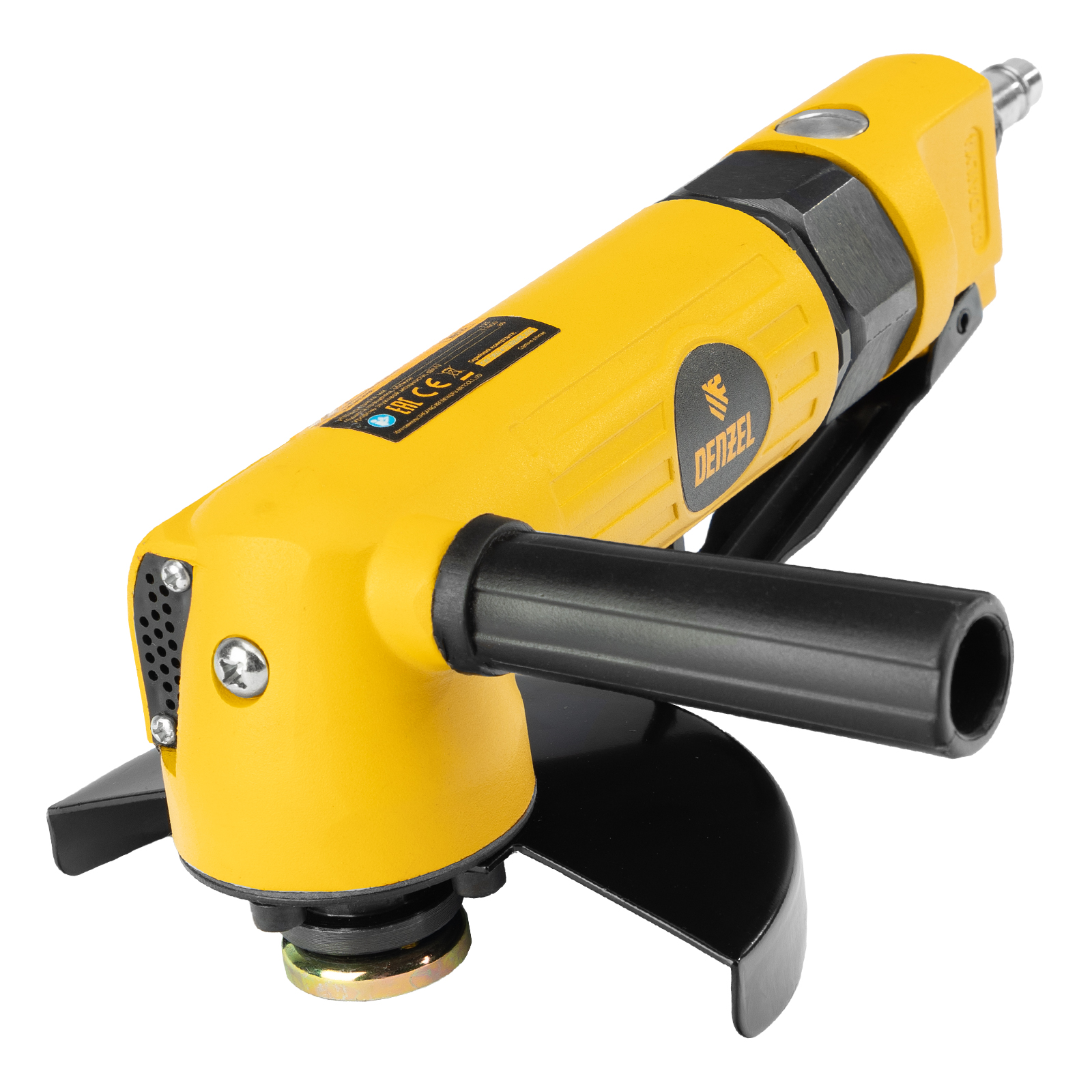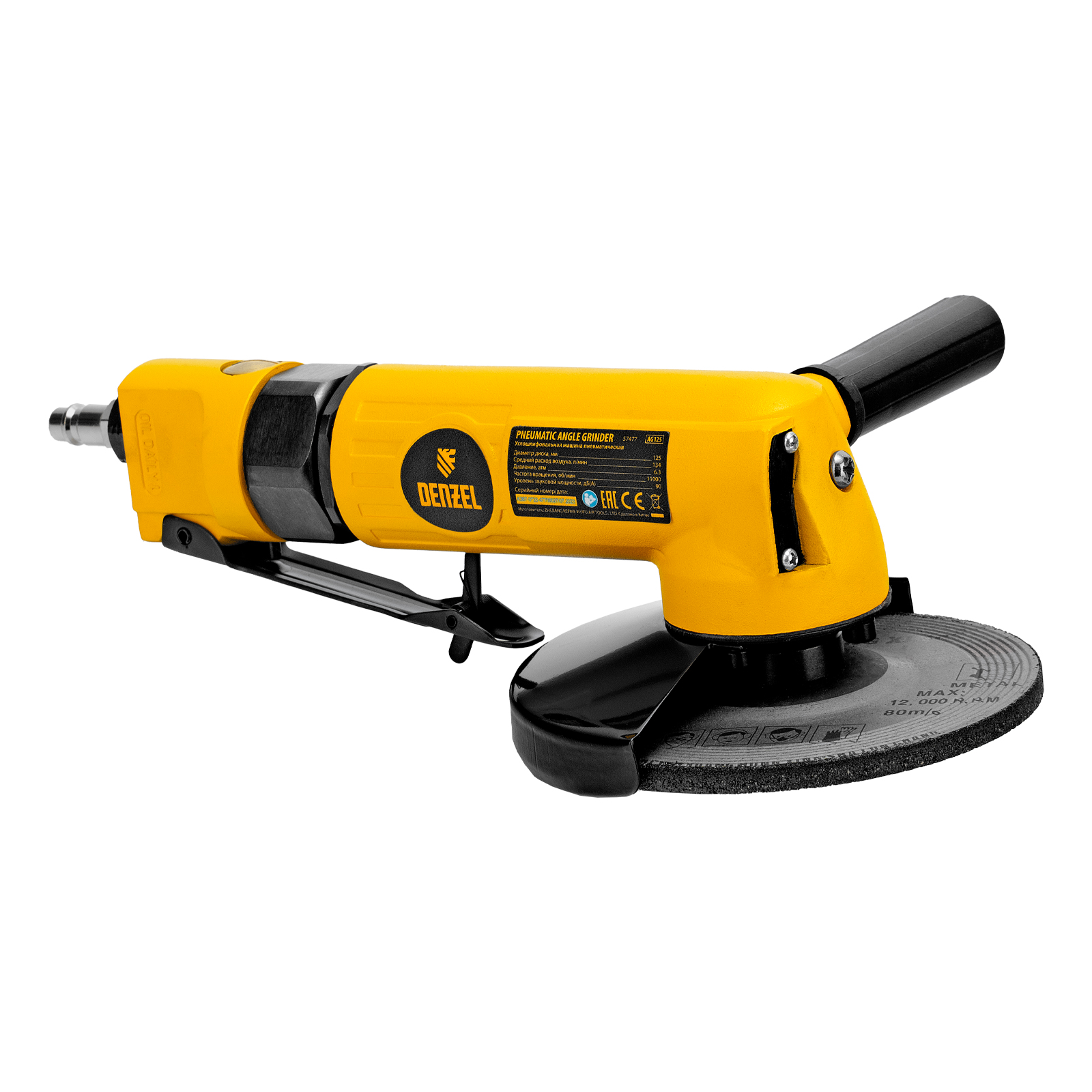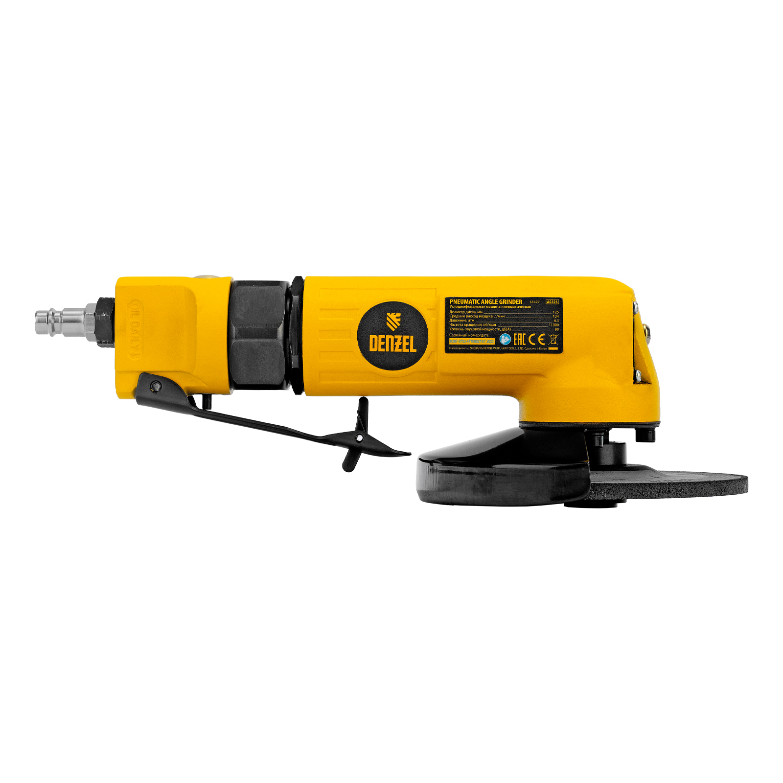 Пневматическая углошлифовальная машина Denzel AG125 57477 используется с дисками до 125 мм для шлифования, зачистки, резки деревянных, металлических, пластмассовых и других материалов. Это универсальный инструмент, востребованный в строительстве, ремонте, незаменимый для домашних мастерских и решения бытовых задач. Частота вращения диска 11000 об/мин при среднем расходе воздуха 186 л/мин обеспечивает высокую производительность и скорость работы. Оптимальная скорость редуктора позволяет быстро и качественно обрабатывать поверхности.,УШМ предназначена для работы при давлении 6,3 бар, расход воздуха в среднем не превышает 200 л/мин. Во время работы не забывайте использовать специальное масло ISO 46, которое можно добавлять как напрямую в инструмент, так и с помощью блока подготовки воздуха Denzel 57469, включающего в себя лубрикатор для автоматической подачи масла.