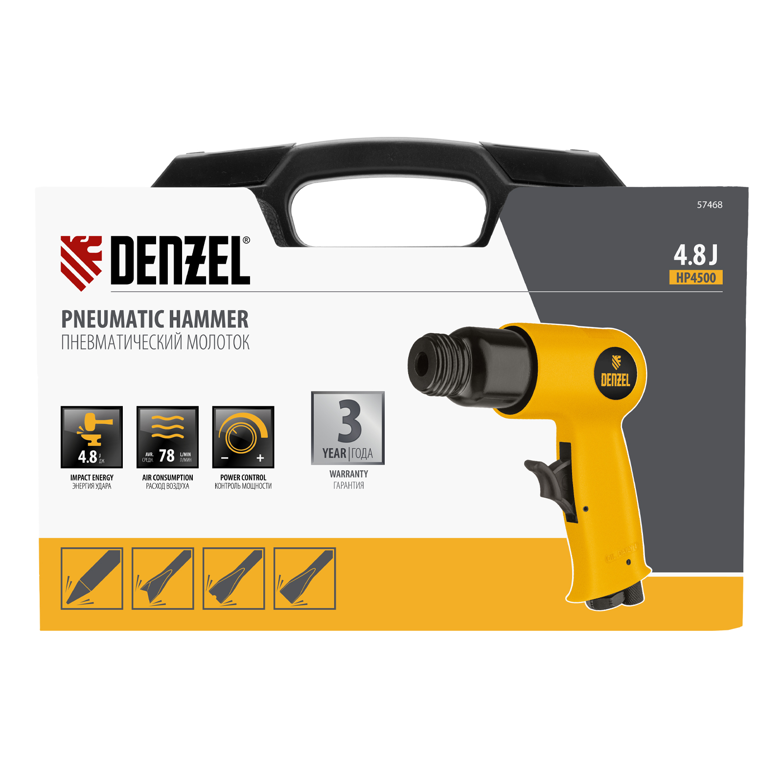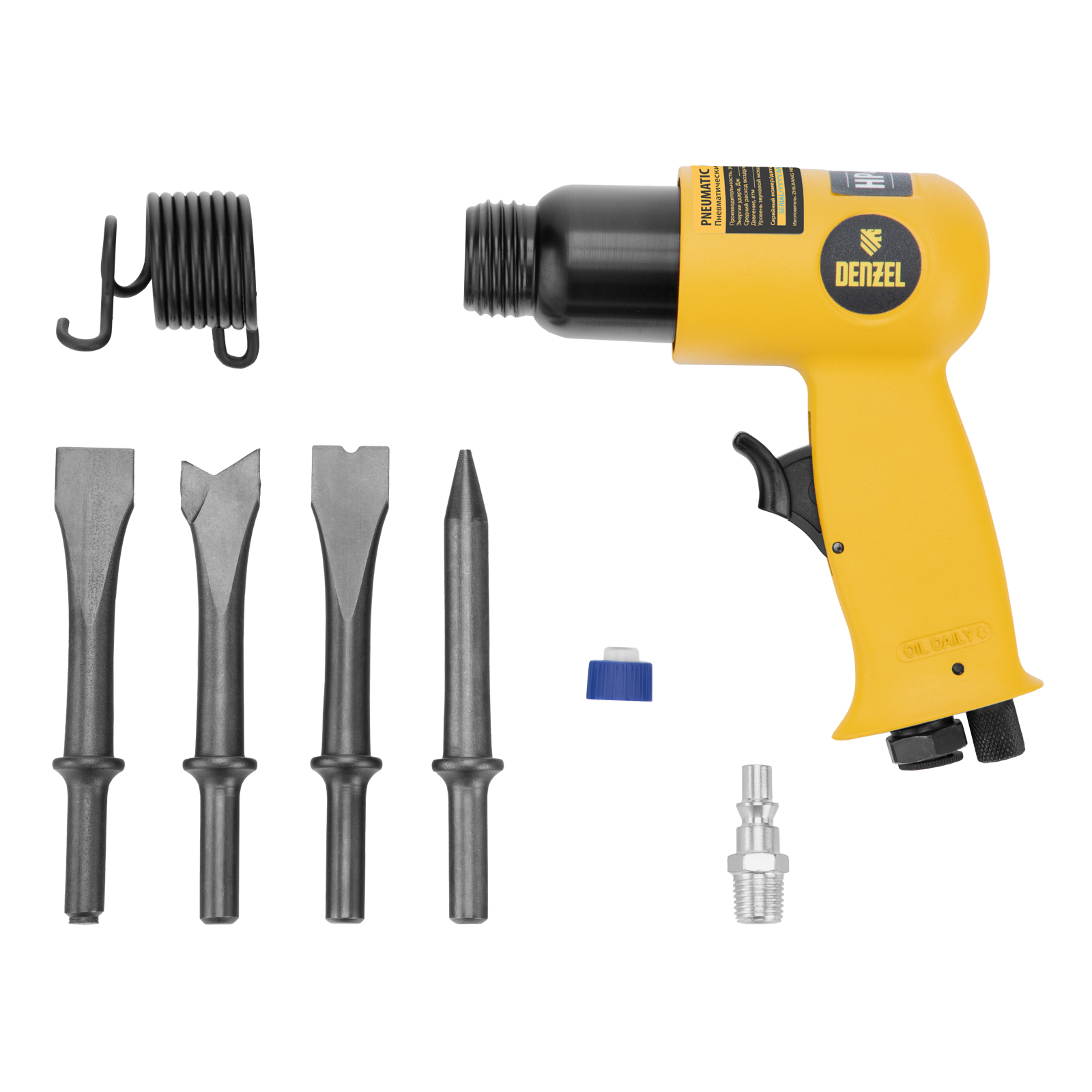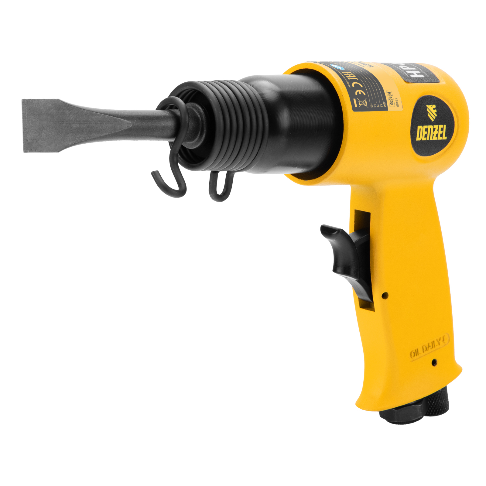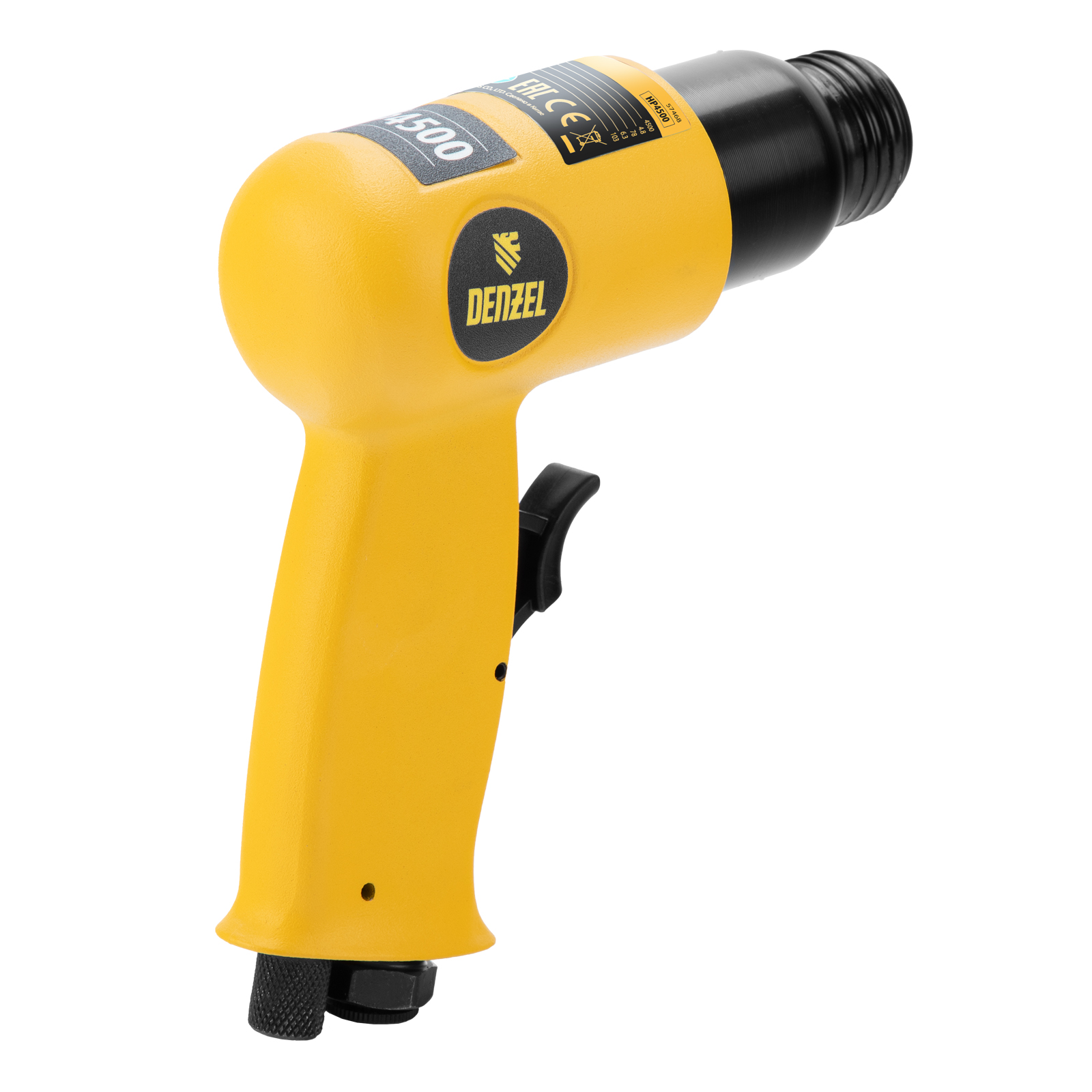 Пневматический молоток Denzel НР4500 57468 с набором насадок в комплекте, производительностью 4500 уд/мин, потребляет 113 л воздуха в минуту и используется для резки, дробления конструкций и материалов из древесины, кирпича, камня или бетона. Благодаря высокой скорости работы подходит для профессионального использования. Расход воздуха невелик, поэтому молоток можно использовать с небольшими компрессорами.