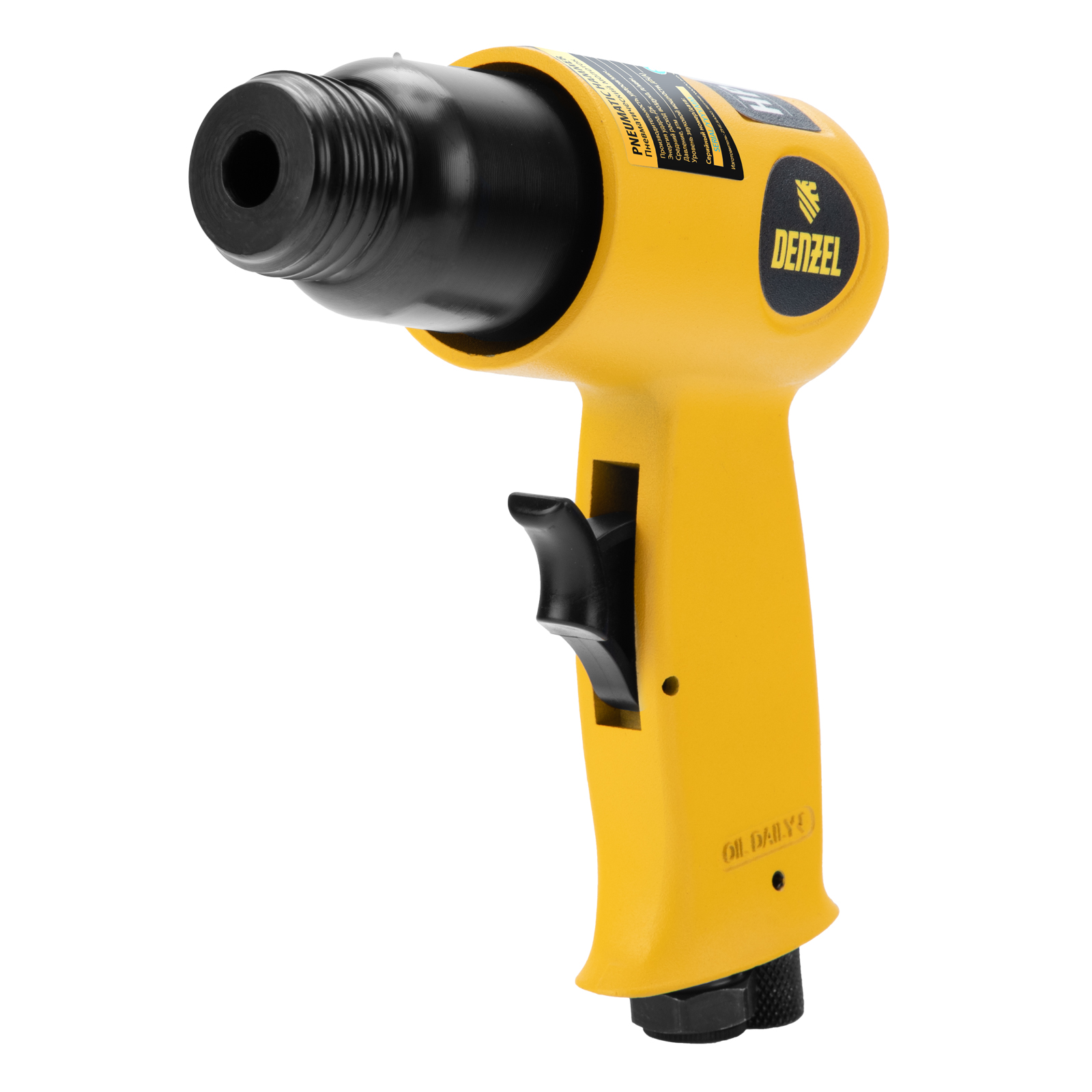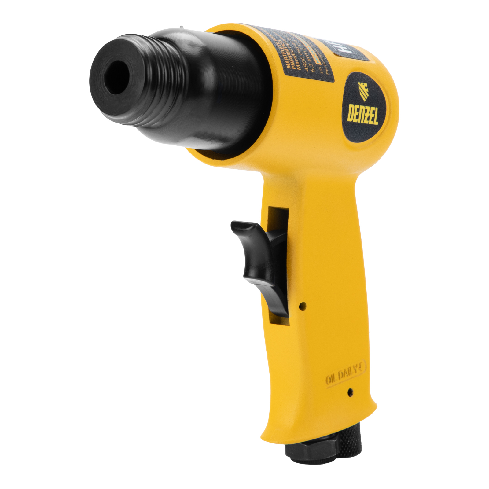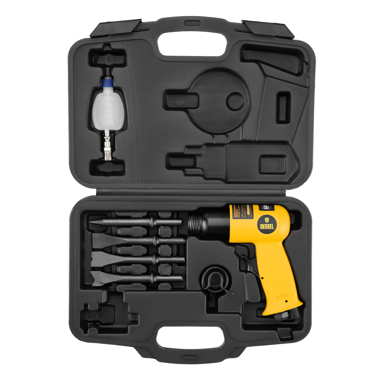 Пневматический молоток Denzel НР4500 57468 с набором насадок в комплекте, производительностью 4500 уд/мин, потребляет 113 л воздуха в минуту и используется для резки, дробления конструкций и материалов из древесины, кирпича, камня или бетона. Благодаря высокой скорости работы подходит для профессионального использования. Расход воздуха невелик, поэтому молоток можно использовать с небольшими компрессорами.