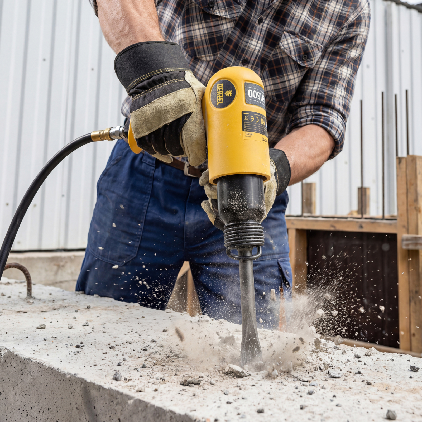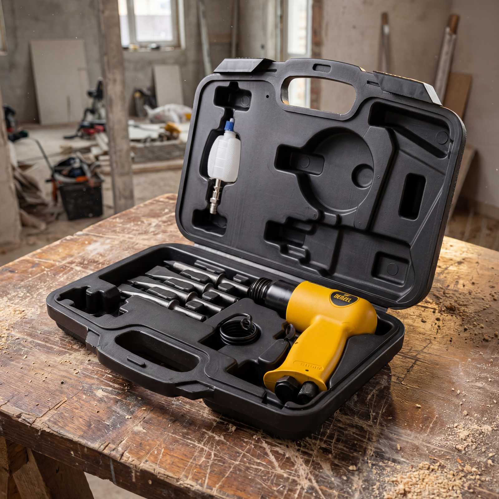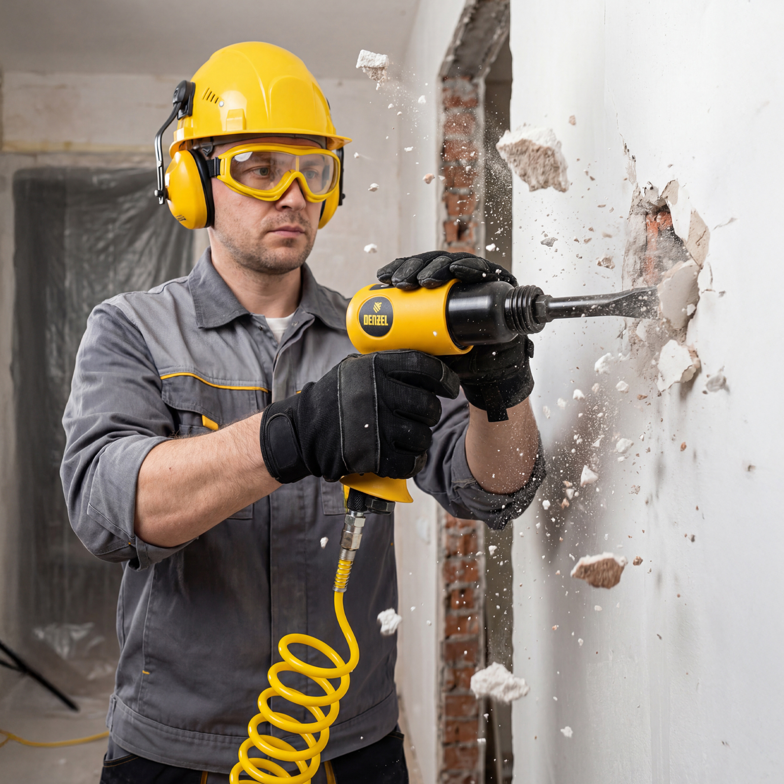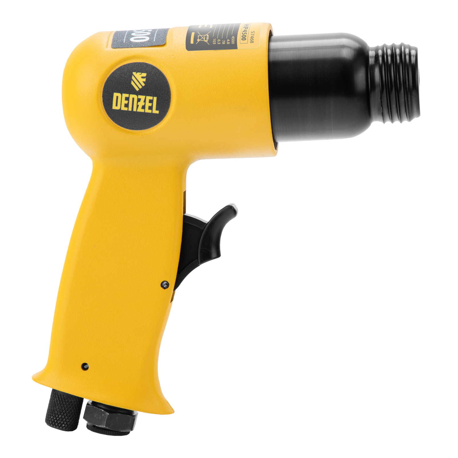 Пневматический молоток Denzel НР4500 57468 с набором насадок в комплекте, производительностью 4500 уд/мин, потребляет 113 л воздуха в минуту и используется для резки, дробления конструкций и материалов из древесины, кирпича, камня или бетона. Благодаря высокой скорости работы подходит для профессионального использования. Расход воздуха невелик, поэтому молоток можно использовать с небольшими компрессорами.