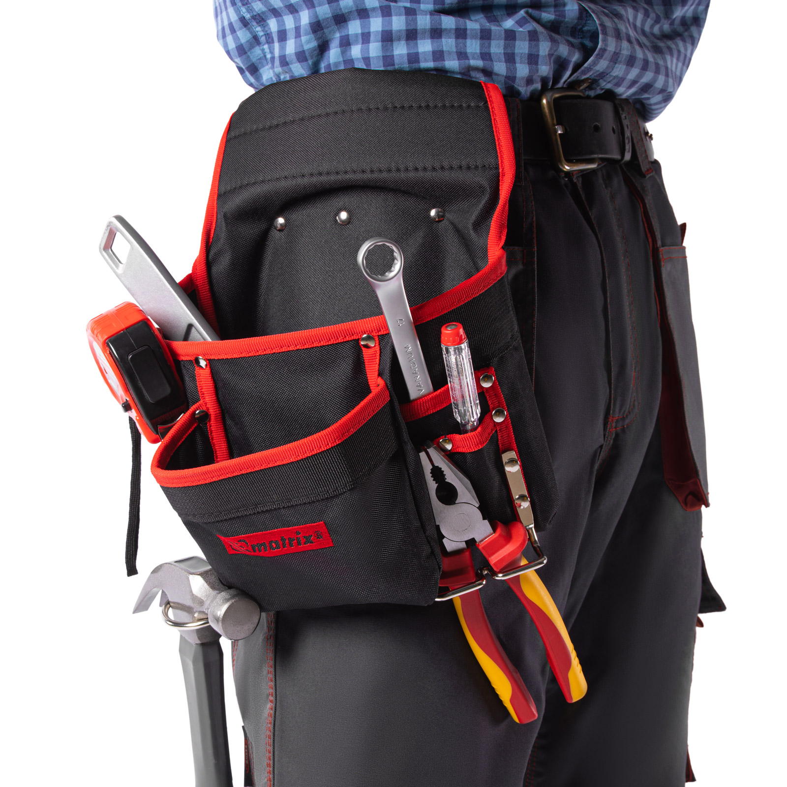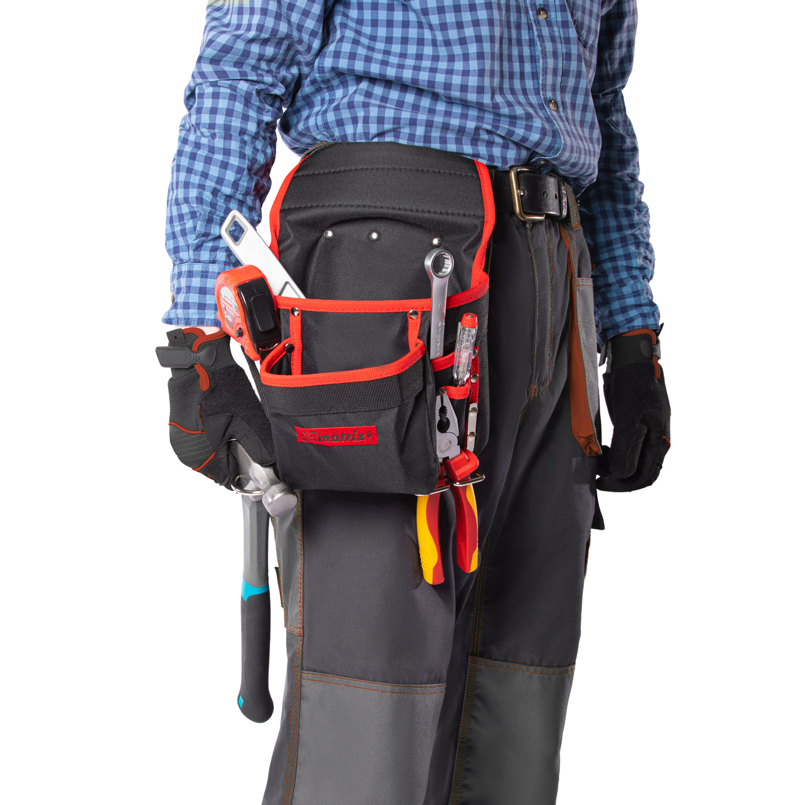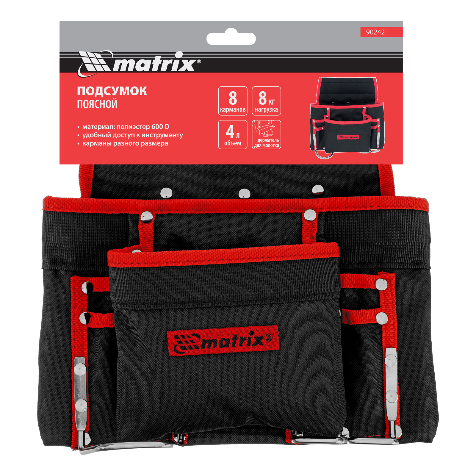 Поясной подсумок Matrix 90242 с 8 карманами и держателями для молотка и клещей используется для переноски инструментов. Крепится на ремень и позволяет иметь под рукой все необходимое, что особенно важно во время работы на высоте. Будет полезен для проведения монтажных, ремонтных и отделочных работ.