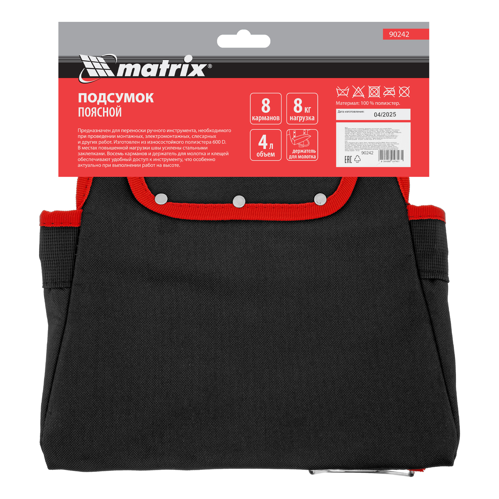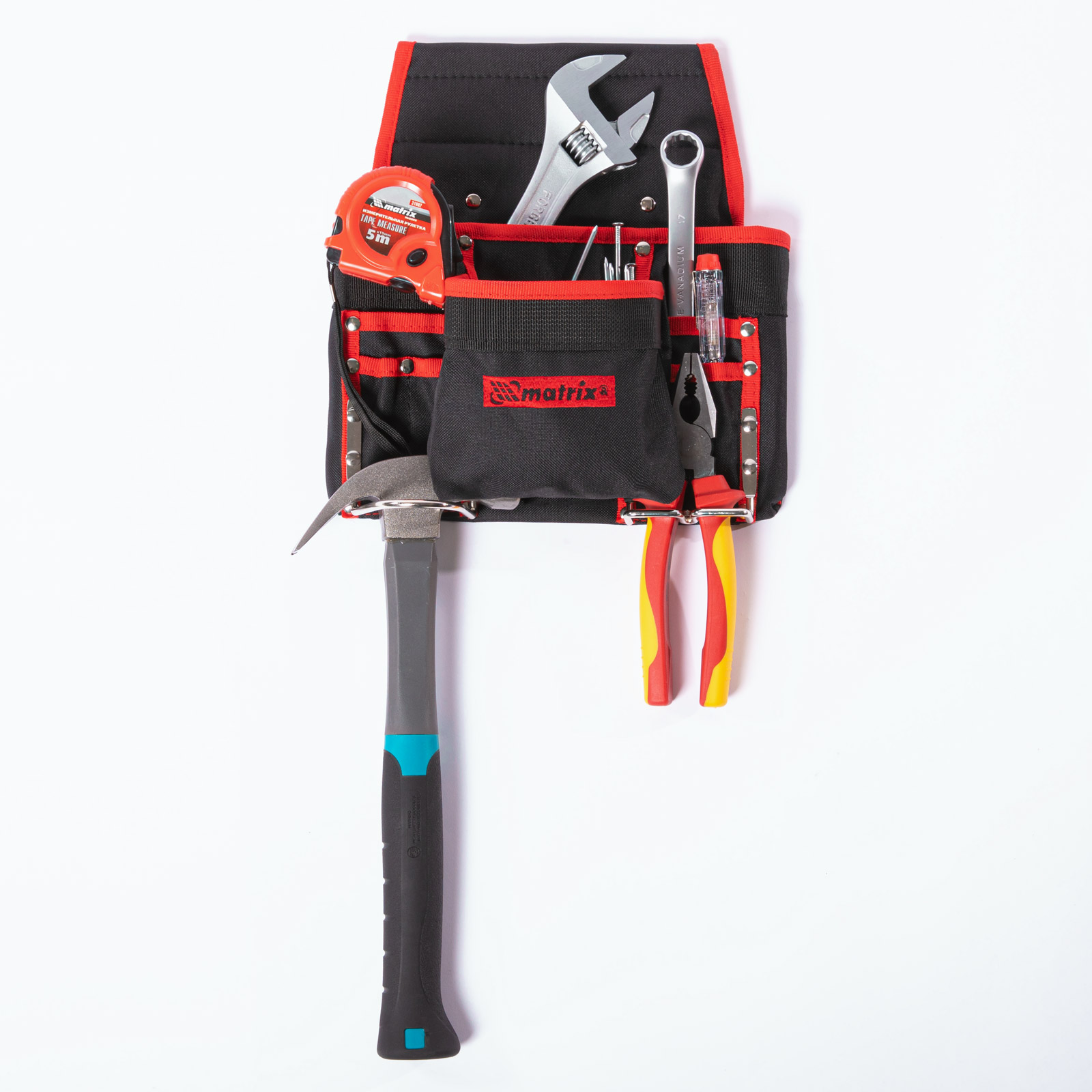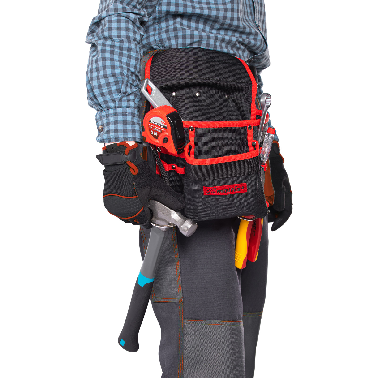 Поясной подсумок Matrix 90242 с 8 карманами и держателями для молотка и клещей используется для переноски инструментов. Крепится на ремень и позволяет иметь под рукой все необходимое, что особенно важно во время работы на высоте. Будет полезен для проведения монтажных, ремонтных и отделочных работ.