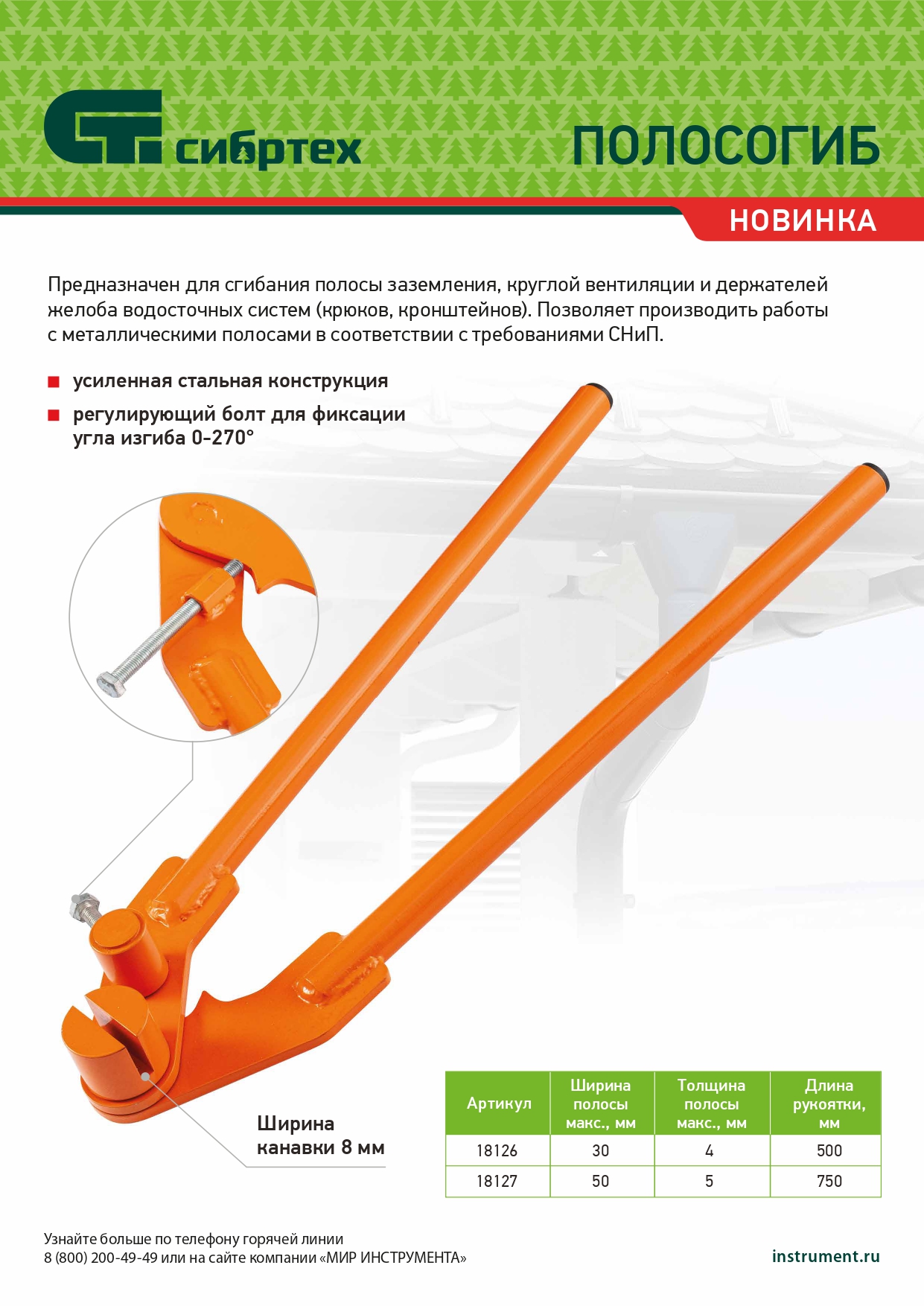 Полосогиб Сибртех 18127 с ручками длиной 750 мм используется для сгибания стальных и медных полос шириной до 50 мм и толщиной до 5 мм. Применяется для формирования контуров заземления, создания держателей водосточных желобов, крюков и кронштейнов. Пригодится для выполнения монтажных работ на строительной площадке.