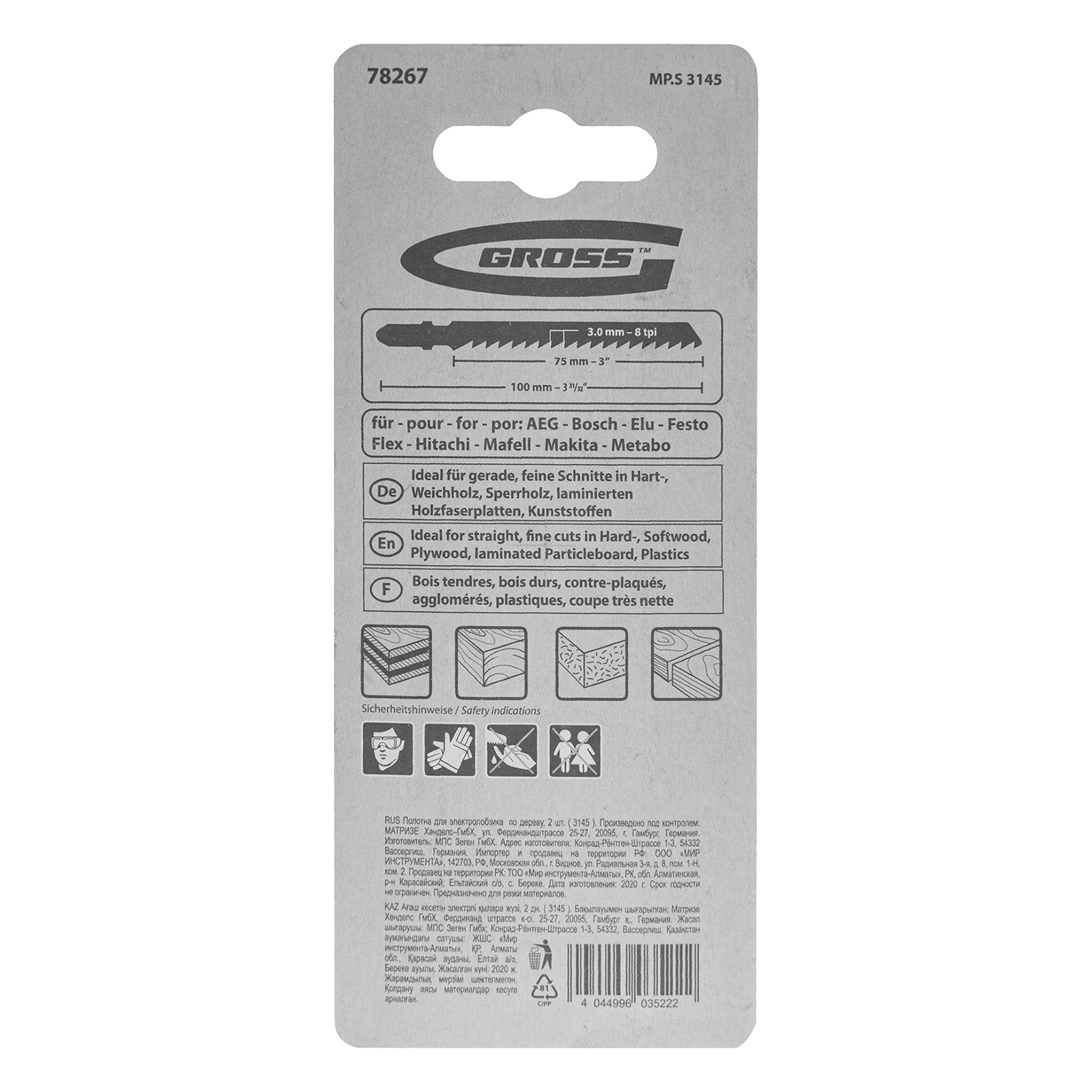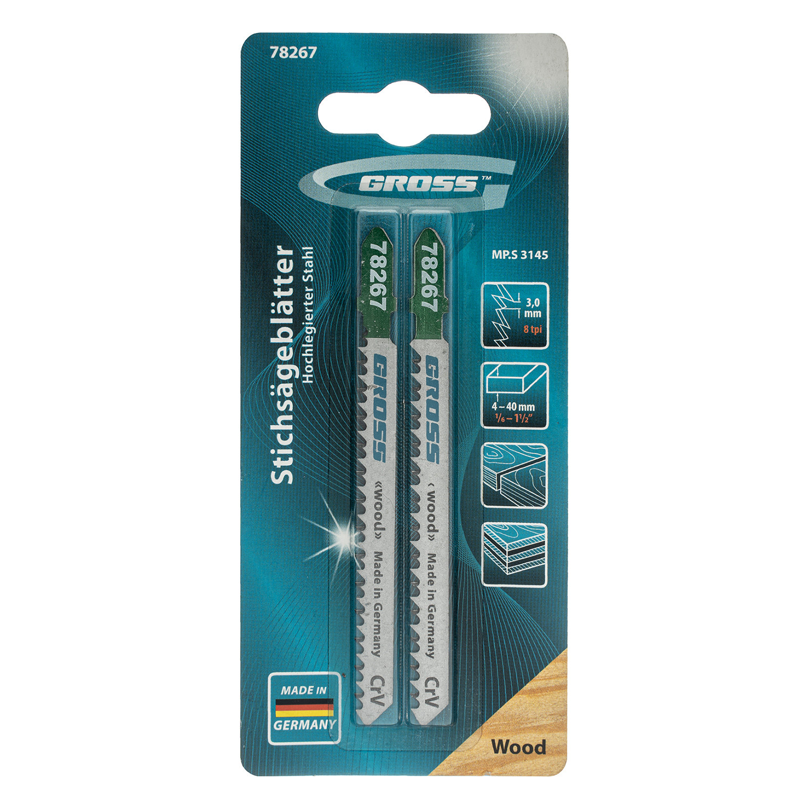 Полотна по дереву Gross 78267, 2 шт. (3145), являются сменными режущими элементами для большинства современных моделей электролобзиков. Осуществляют прямой рез деревянных заготовок и изделий толщиной 4-40 мм. Высококачественные полотна пригодятся профессиональным мастерам в ходе проведения ремонтных и строительных работ.