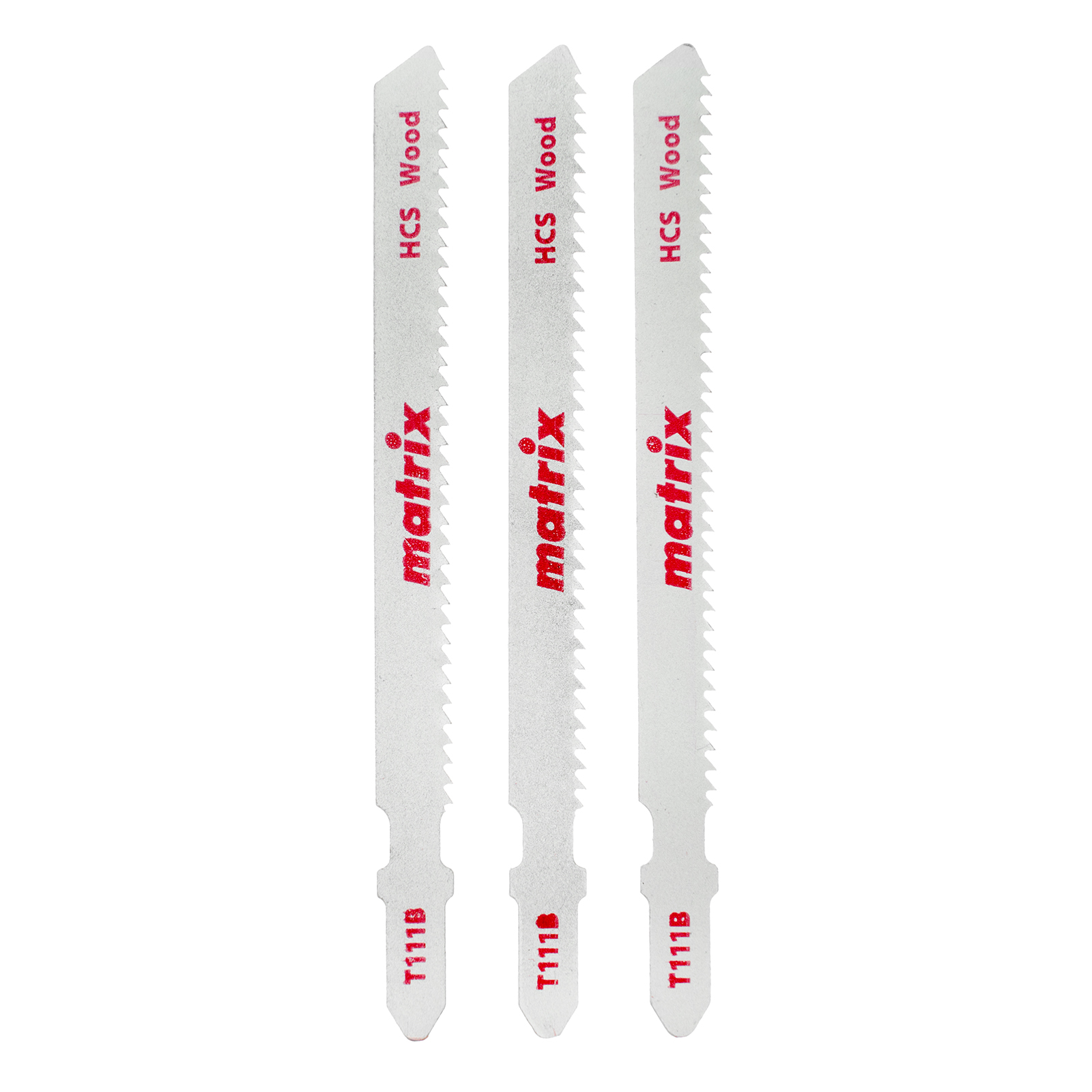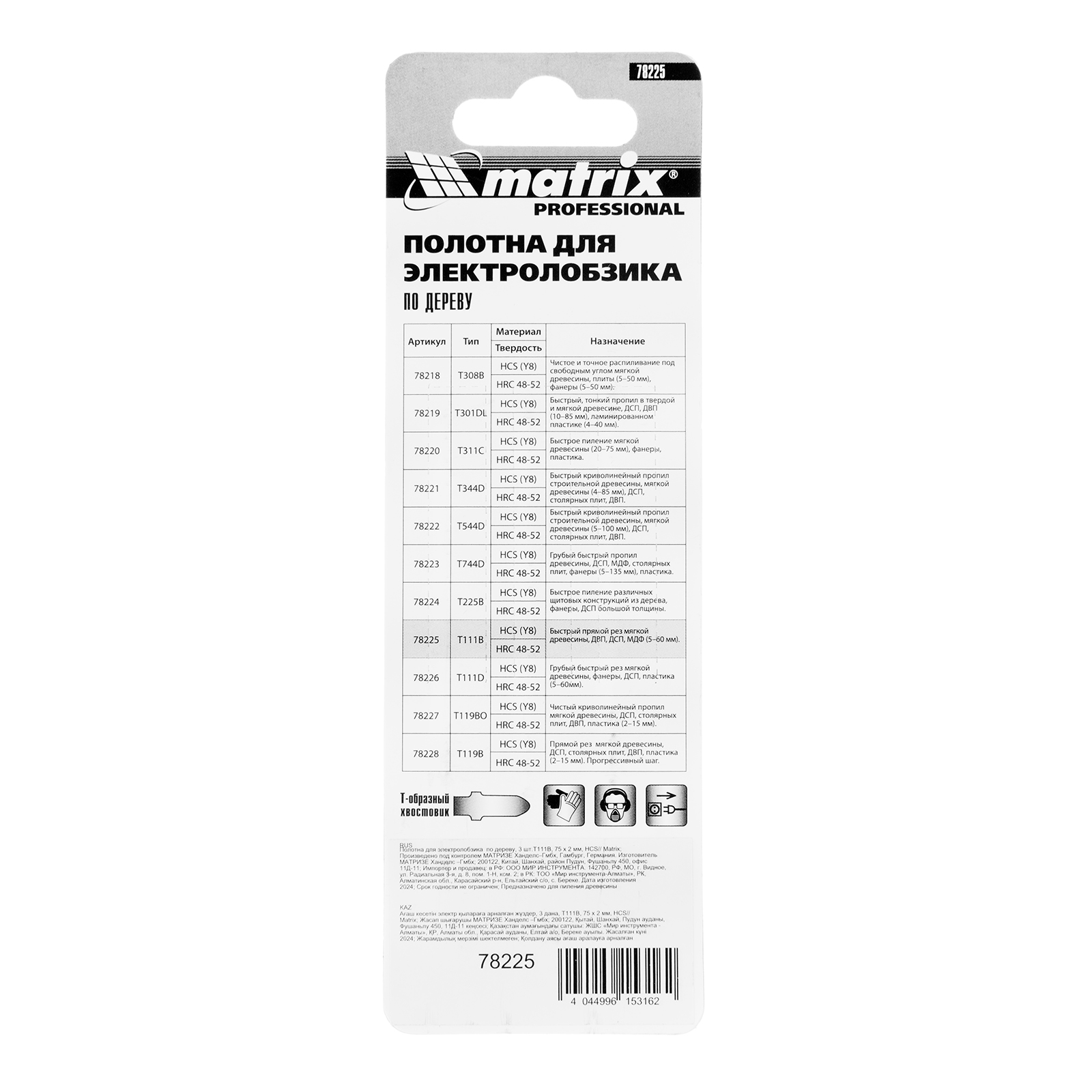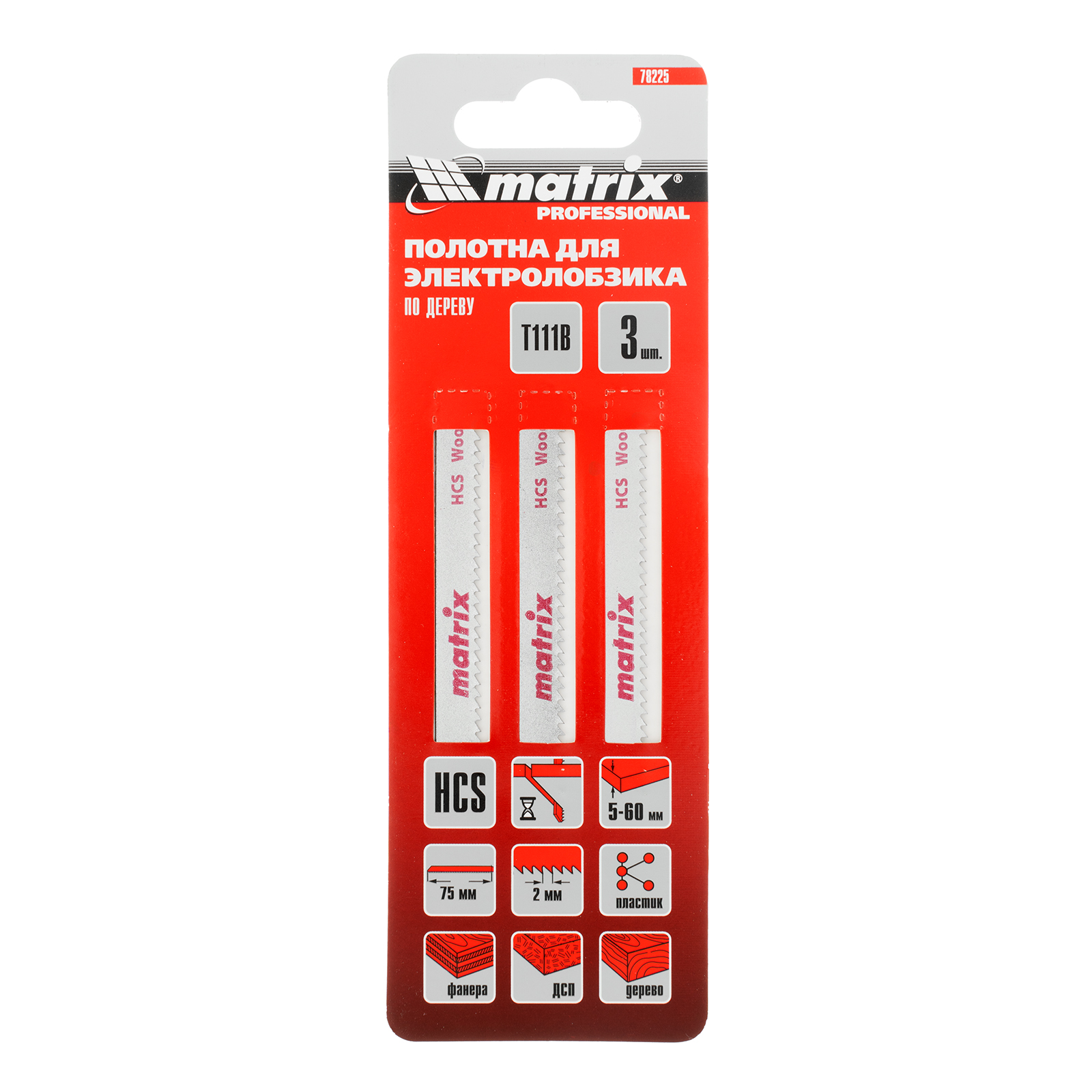 Полотна для электролобзика по дереву T111B Matrix 78225 с шагом зубьев 2 мм, из стали HCS, 3 шт. в упаковке, имеют рабочую длину 75 мм и предназначены для прямого реза древесины, фанеры, ДСП и пластика толщиной от 5 до 60 мм. Т-образный хвостовик позволяет устанавливать пилки на большинство современных электролобзиков. Набор подходит для профессионального и бытового применения.