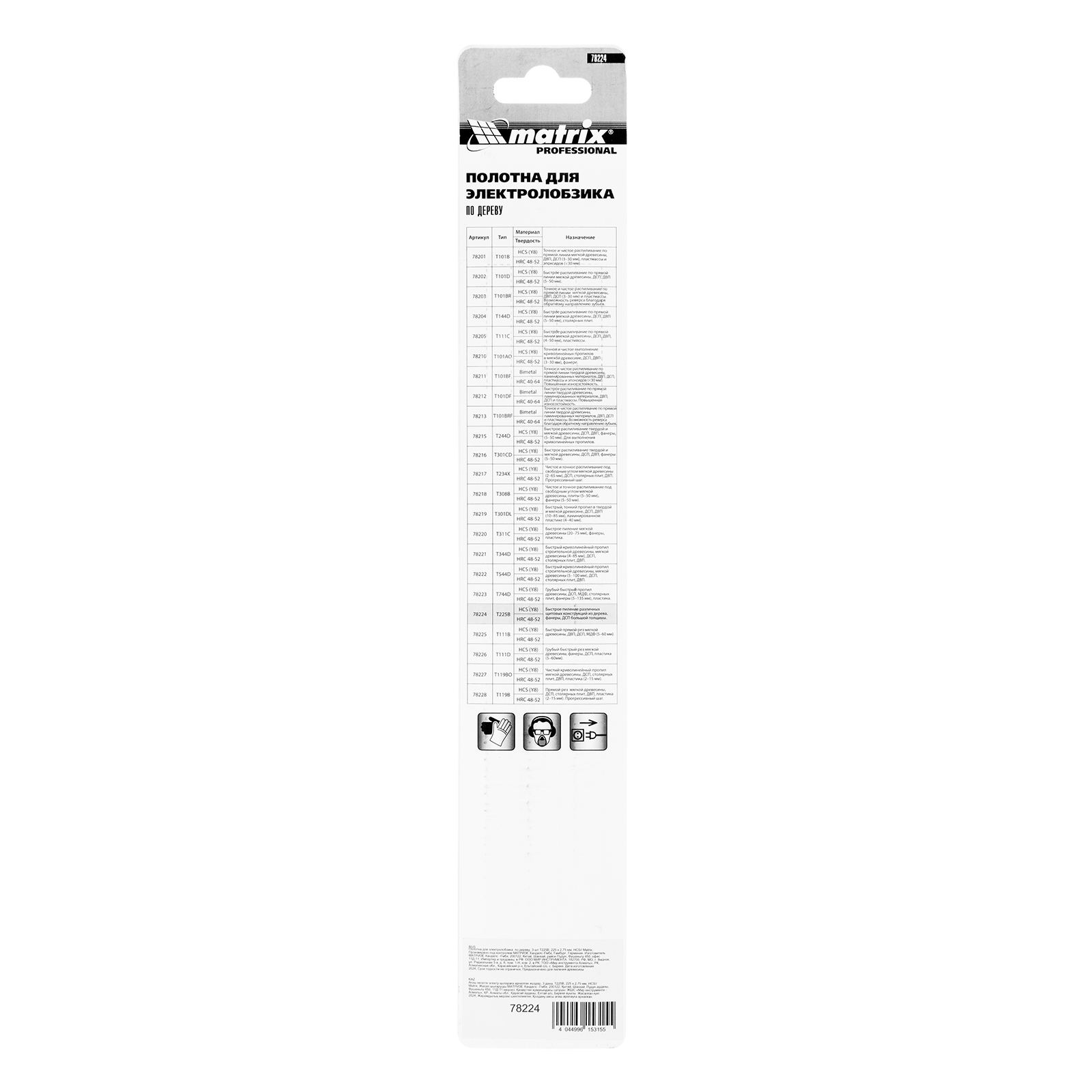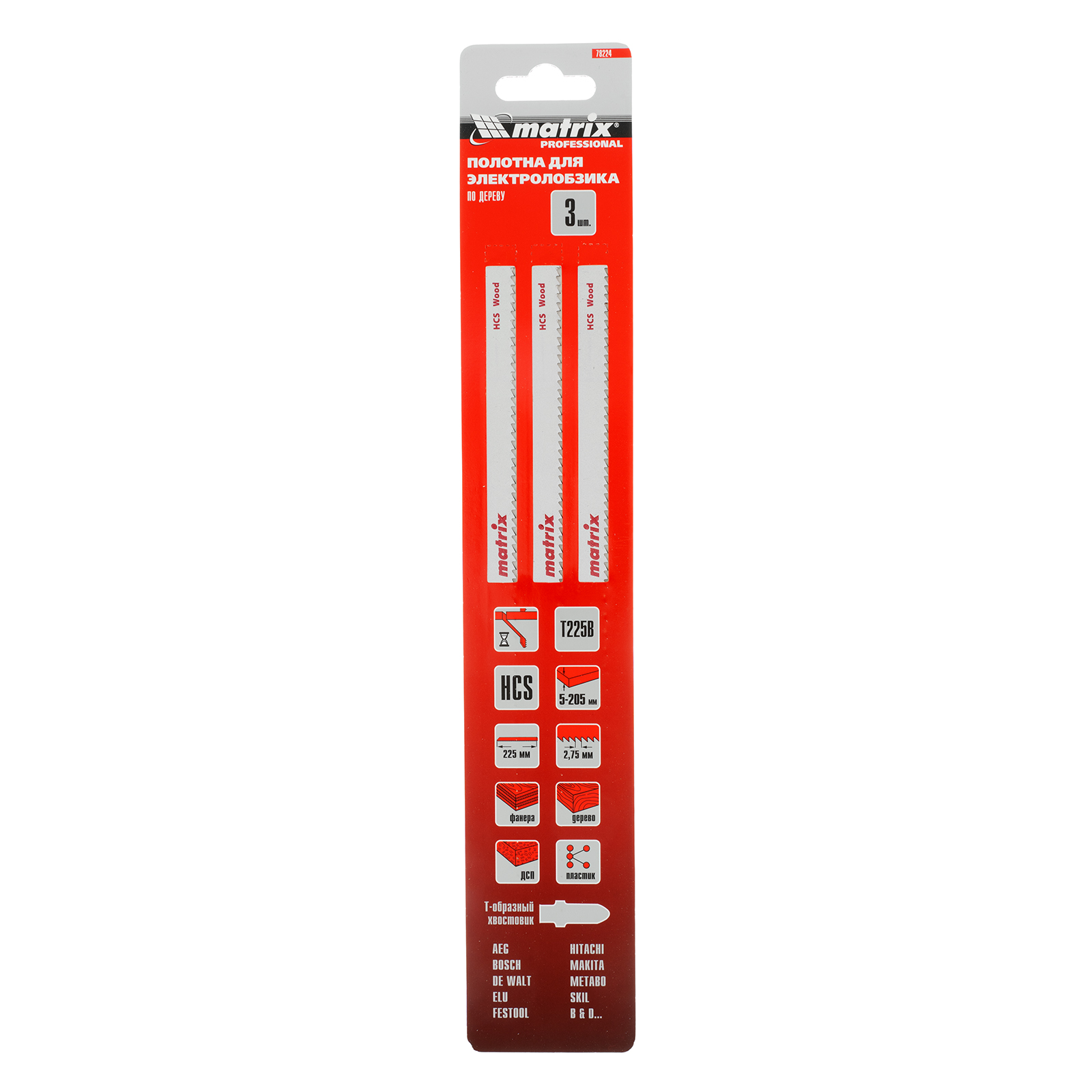 <p>Полотна для электролобзика T225B Matrix 78224 с рабочей длиной 225 мм и шагом зубьев 2,75 мм, из стали HCS, — комплект оснастки из 3 пилок, предназначенных для выполнения работ по дереву. Распиливают заготовки значительной толщины из древесины, фанеры и ДСП. Совместимы с электролобзиками, оснащенными зажимами под Т-образный хвостовик. Подойдут для выполнения строительных, ремонтных и столярных работ.</p><h2>Преимущества</h2><ul><li>Прочность и износостойкость — пилки изготовлены из высокоуглеродистой стали У8.</li><li>Высокая производительность — зубья с шагом 2,75 мм повышают скорость распиловки.</li><li>Гарантированное качество — пилки изготовлены на специализированном оборудовании с применением современных технологий.</li><li>Удобная комплектация — упаковка из 3 полотен рассчитана на выполнение большого объема работ.</li></ul>