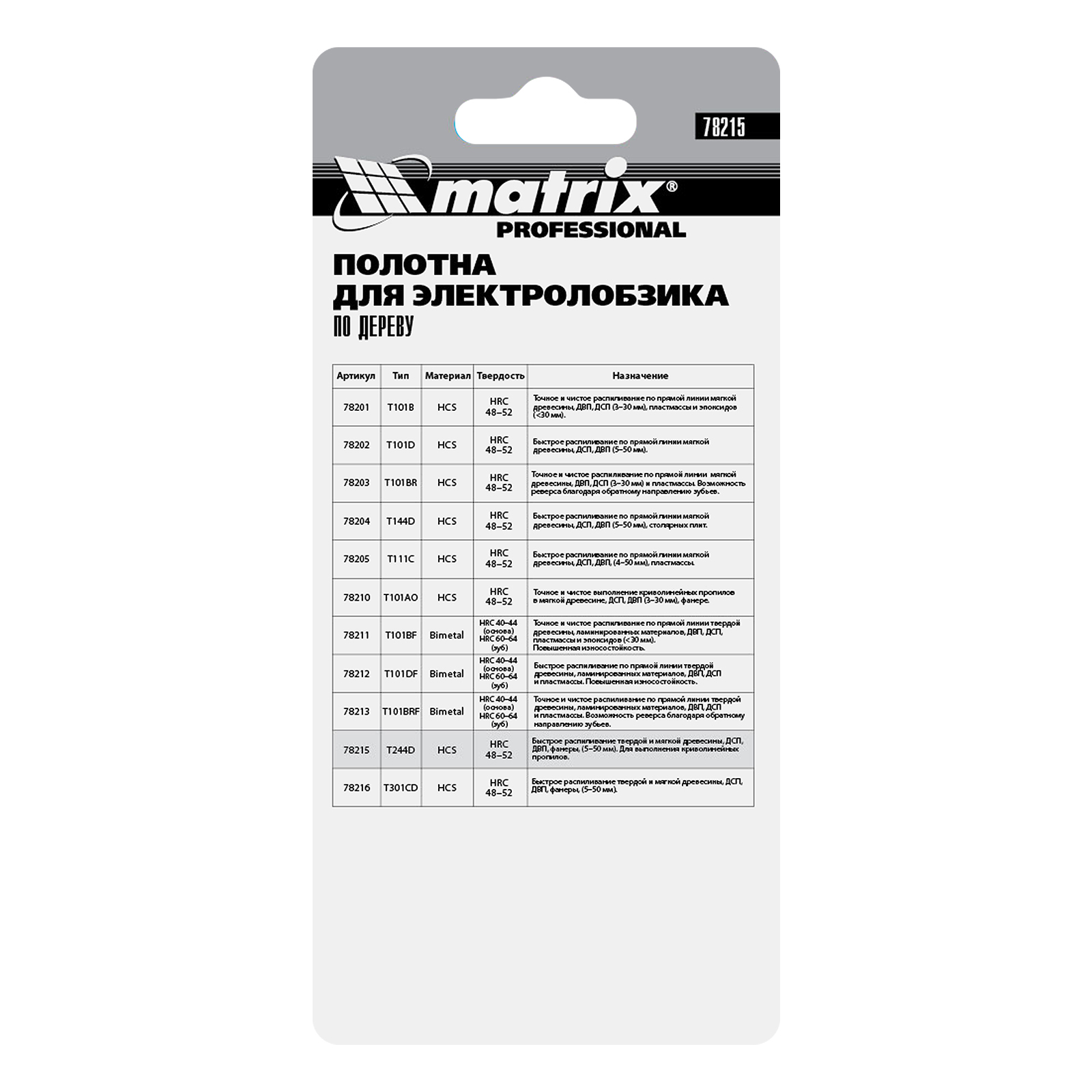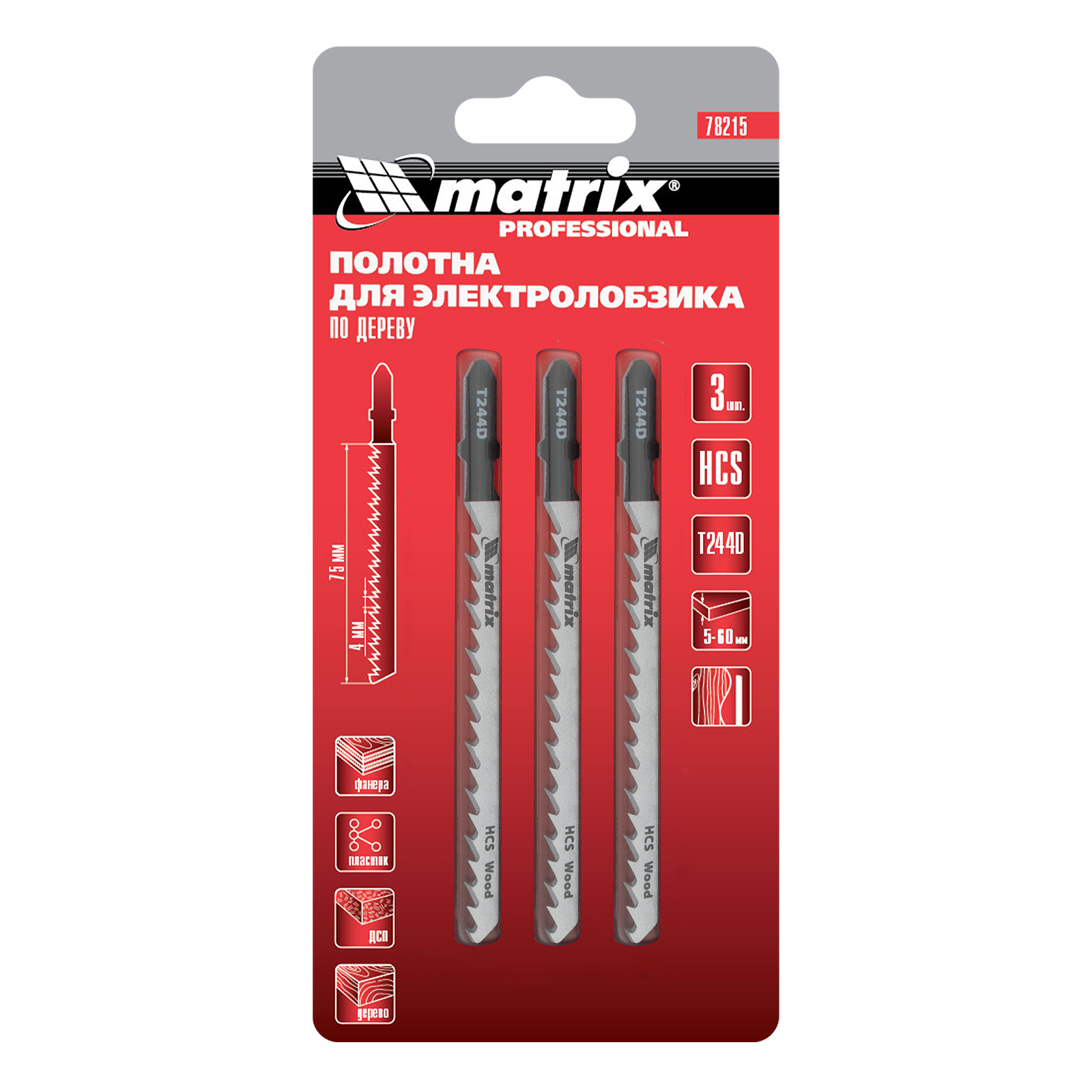 Полотна для электролобзика Matrix 78215, T244D, 75 х 4 мм, из стали HCS, 3 шт. в упаковке, — набор оснасток для работ по дереву толщиной 5-60 мм. Также эффективны при распиловке фанеры, ДСП, ДВП и пластика. Позволяют выполнять криволинейные пропилы и подходят для всех электролобзиков с зажимами под Т-образный хвостовик. Будут полезны во время ремонта, при производстве и сборке мебели, а также в быту.
