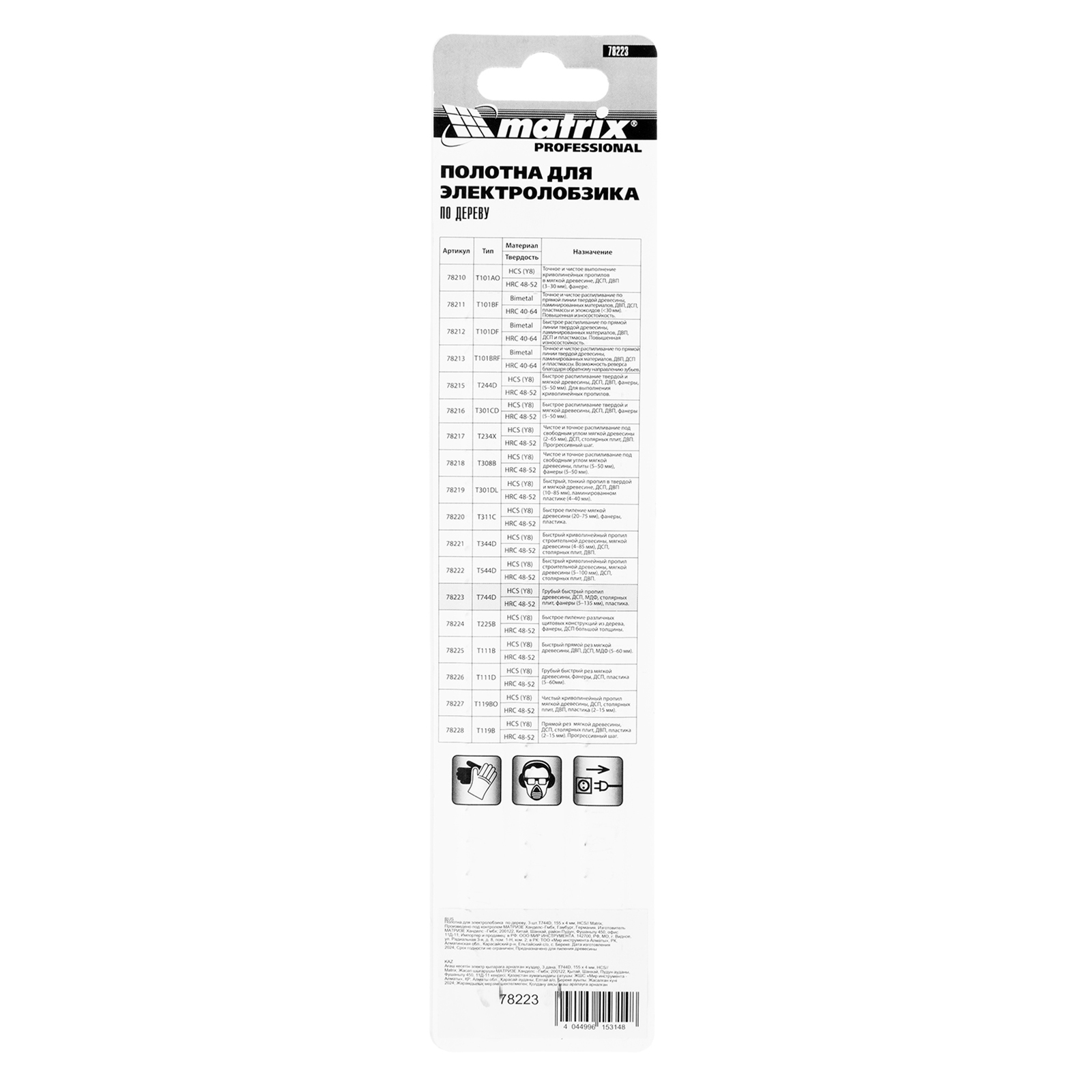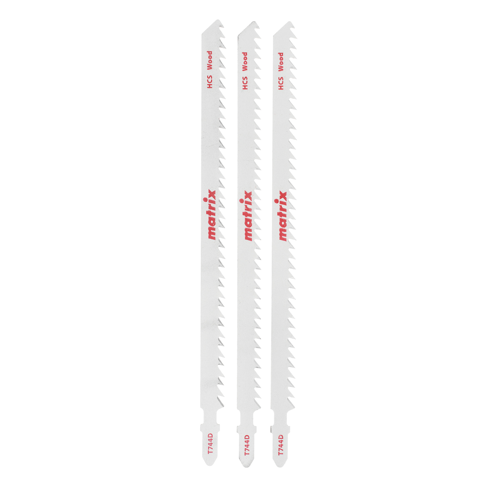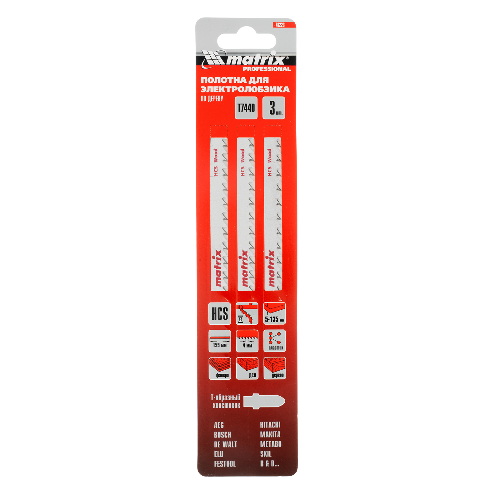 <p>Полотна для электролобзика по дереву T744D Matrix 78223 с шагом зубьев 4 мм, из стали HCS, 3 шт. в упаковке, имеют рабочую длину 155 мм и предназначены для грубой быстрой распиловки древесины, пиломатериалов, ДСП толщиной от 5 до 135 мм, а также пластика и фанеры. Благодаря Т-образному хвостовику полотна совместимы с большинством электролобзиков ведущих производителей. Подходят для профессионального использования, будут полезны и в быту.</p><h2>Преимущества</h2><ul><li>Прочность и долговечность — пилки изготовлены из высокоуглеродистой стали.</li><li>Высокая скорость распиловки — разведенные зубья с шагом 4 мм обеспечивают быстрое удаление стружки.</li><li>Надежность — пилки изготовлены из высококачественных материалов с применением современных технологий.</li><li>Удобная комплектация — упаковка из 3 полотен рассчитана на выполнение большого объема работ.</li></ul>