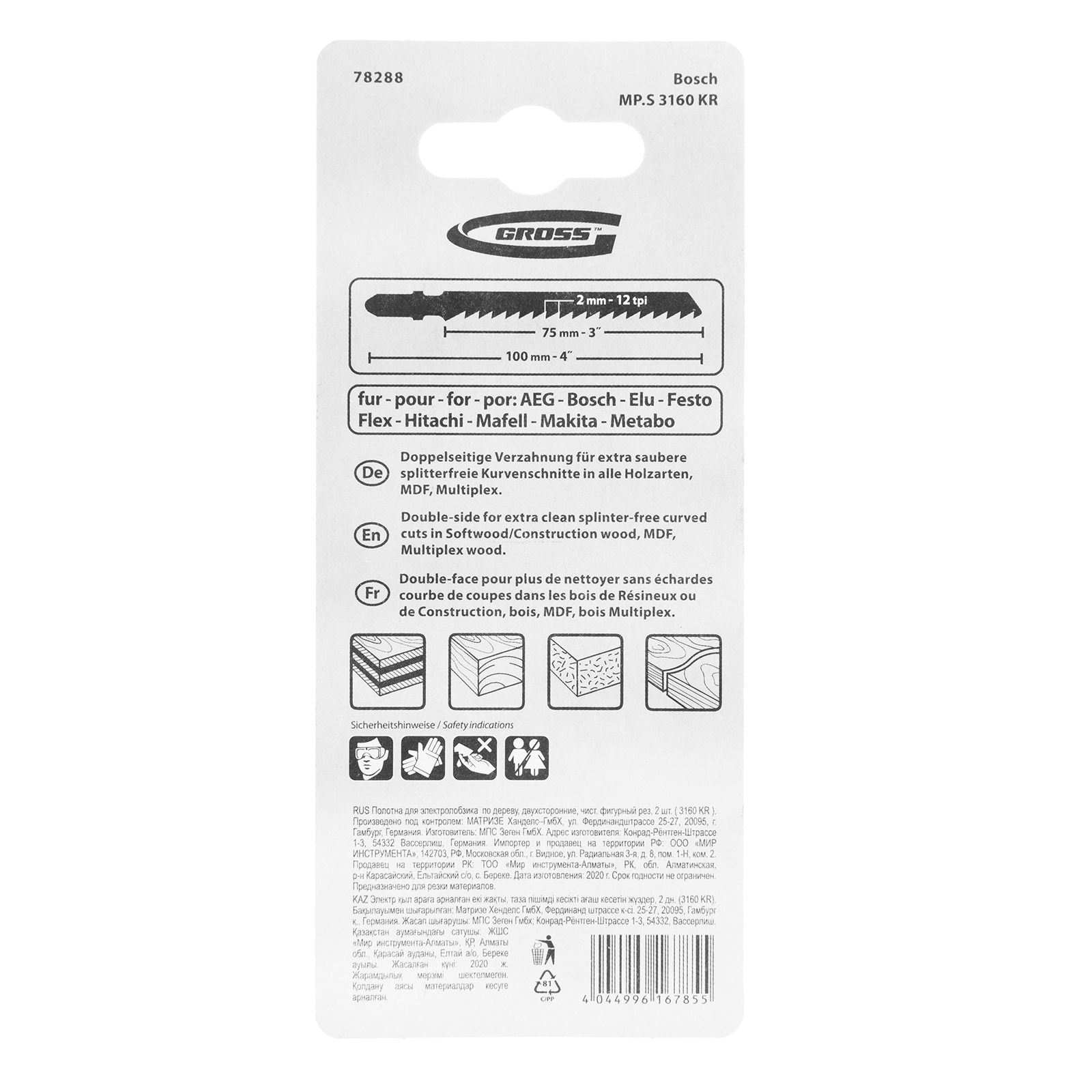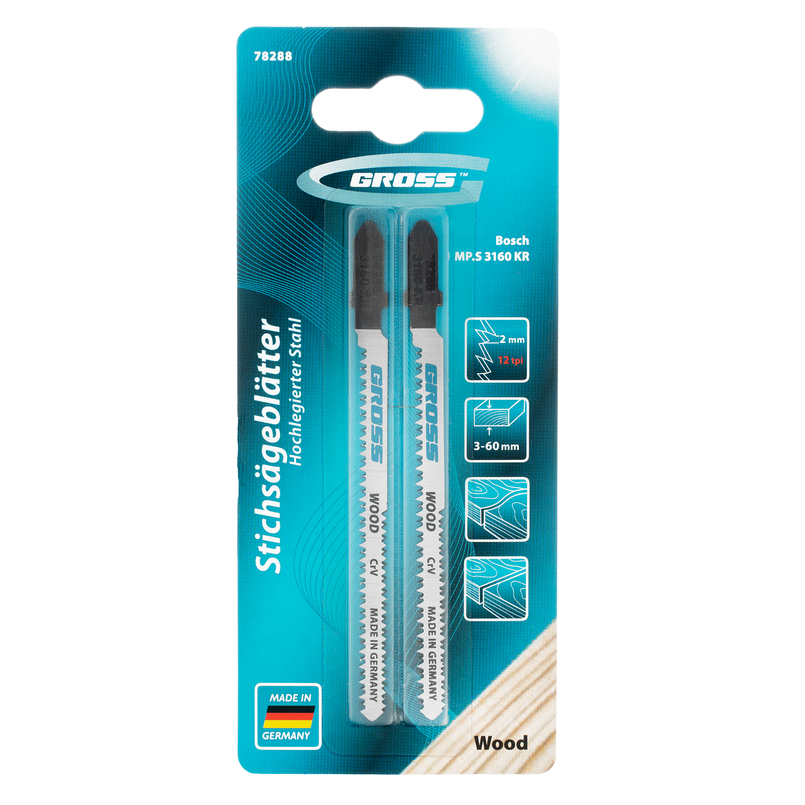 <p>Двухсторонние полотна для электролобзика по дереву Gross 78288, 2 шт. (3160 KR), подходят для прямого и чистого фигурного реза материалов. Могут применяться для обработки древесины, фанеры, ДСП, ДВП, а также пластика толщиной 3-60 мм. Двухсторонний профиль обеспечивает качественный гладкий распил, полотна рассчитаны на профессиональное применение.</p><h2>Преимущества</h2><ul><li>Износостойкость и прочность — полотна выполнены из инструментальной хромованадиевой стали с высоким содержанием углерода.</li><li>Закалка в вакуумных печах — полотна обладают высокой твердостью, способны выдерживать длительную эксплуатацию без риска перегрева и поломки зубьев.</li><li>Точность работы — шаг зубьев полотен составляет 2 мм, кромка получается аккуратной и чистой.</li></ul>