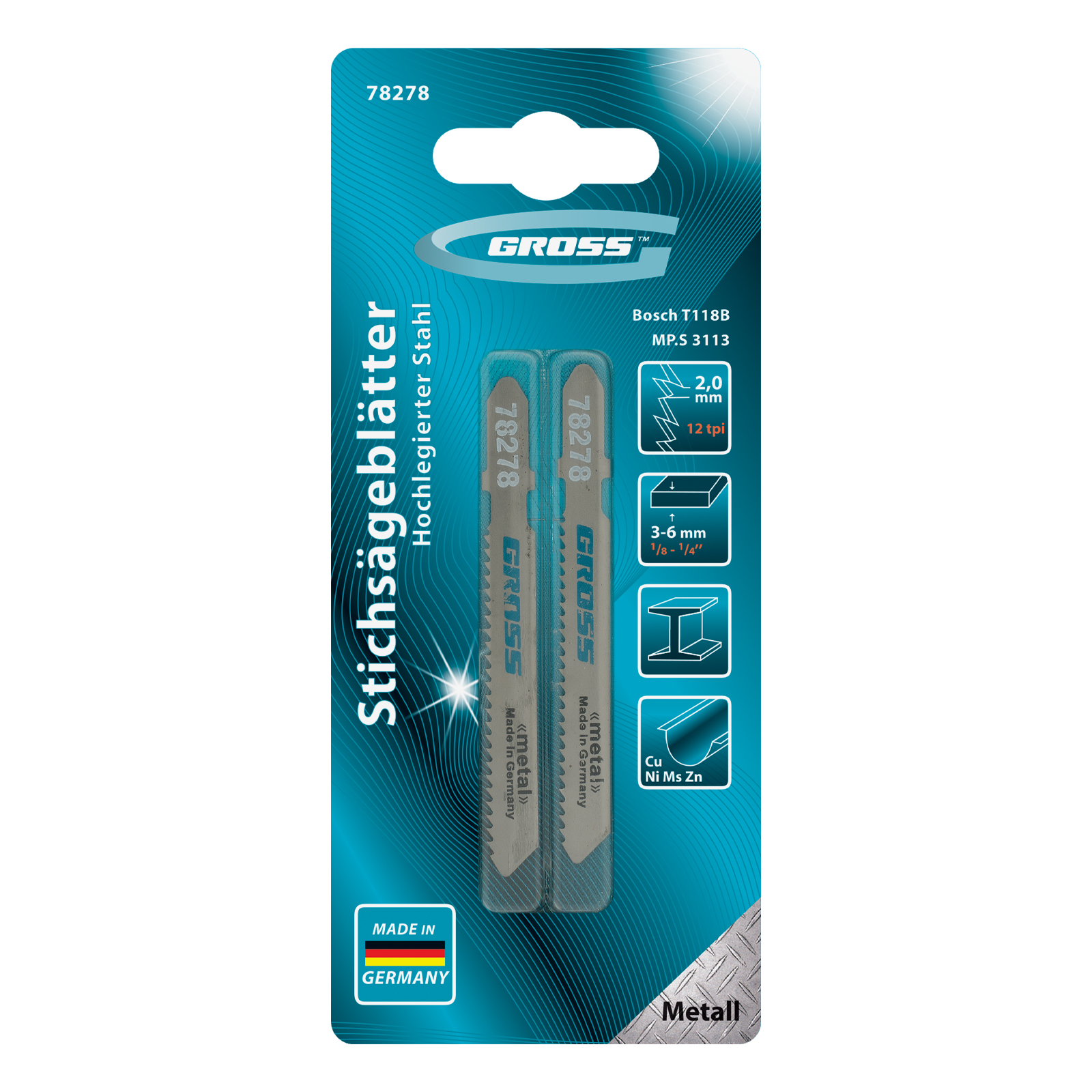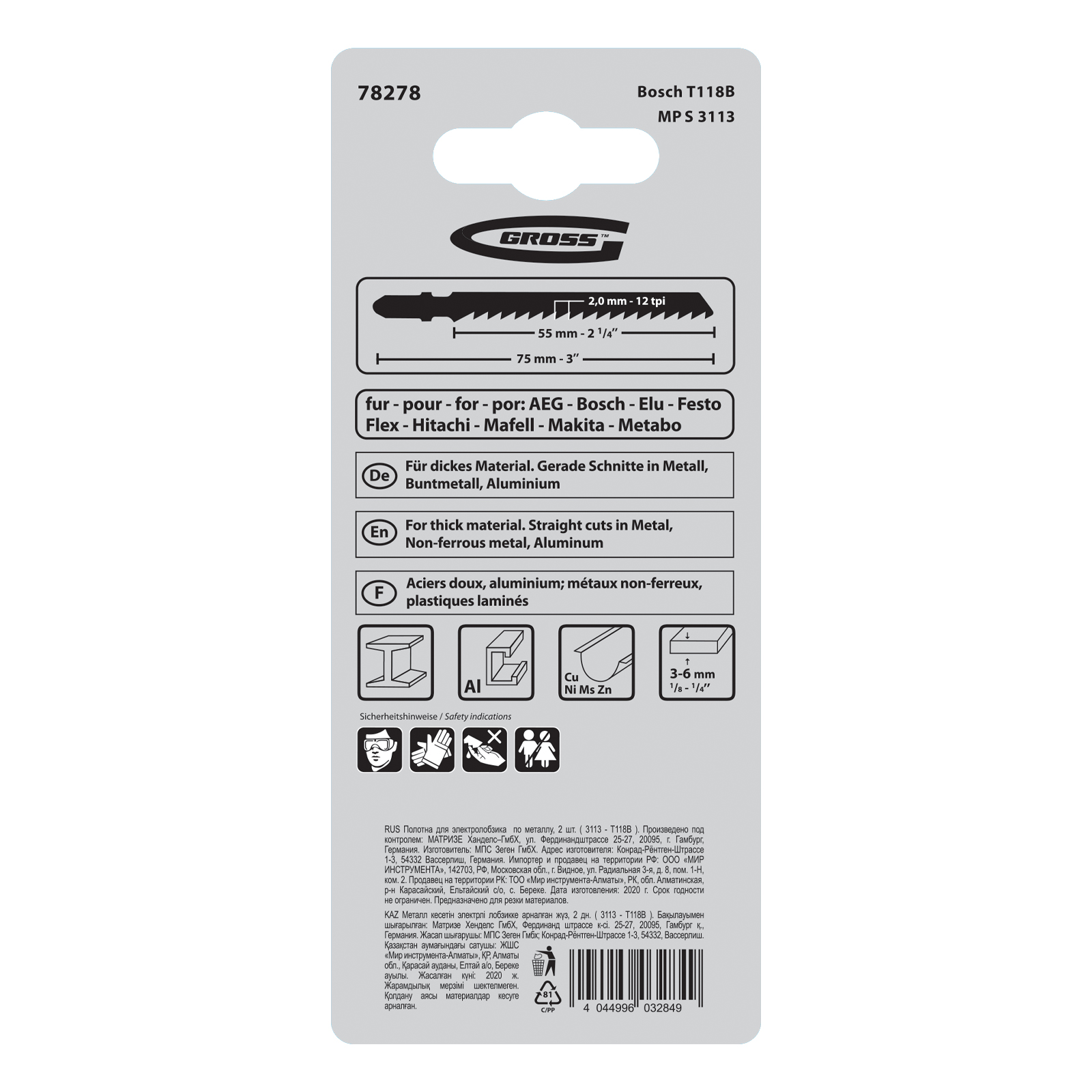 <p>Полотна по металлу 3113-T118B Gross 78278, 2 шт. в упаковке, — сменные режущие элементы, подходящие для большинства современных электролобзиков. Производят прямой рез металлических, стальных заготовок, листового железа, изделий из стеклопластика, текстолита и прочих композитных материалов толщиной 3-6 мм. Предназначены для профессионального применения во время ремонтных и строительных работ.</p><h2>Преимущества</h2><ul><li>Надежность — полотна, произведенные в Германии из высококачественной хромованадиевой стали, отличаются твердостью и износостойкостью.</li><li>Высокое качество работ — лазерная раскройка профиля полотен, автоматизированная заточка и шлифовка, а также зубья с шагом 2 мм обеспечивают точность и аккуратность распиловки.</li><li>Удобная транспортировка и безопасное хранение — полотна поставляются в жестком блистере.</li></ul>