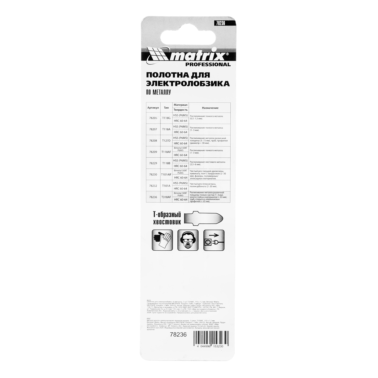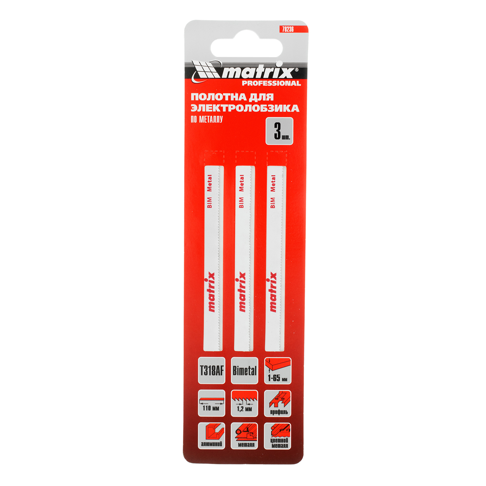 Полотна для электролобзика T318AF Matrix 78236 с рабочей длиной 110 мм и шагом зубьев 1,2 мм, биметаллические (Bimetal), 3 шт. в упаковке, предназначены для распиловки металла толщиной до 65 мм, а также труб и алюминиевых профилей. Подходят для резки цветных металлов. Пилки являются оснасткой для электролобзиков с зажимами под Т-образный хвостовик. Будут полезны при выполнении ремонтных и слесарно-монтажных работ.