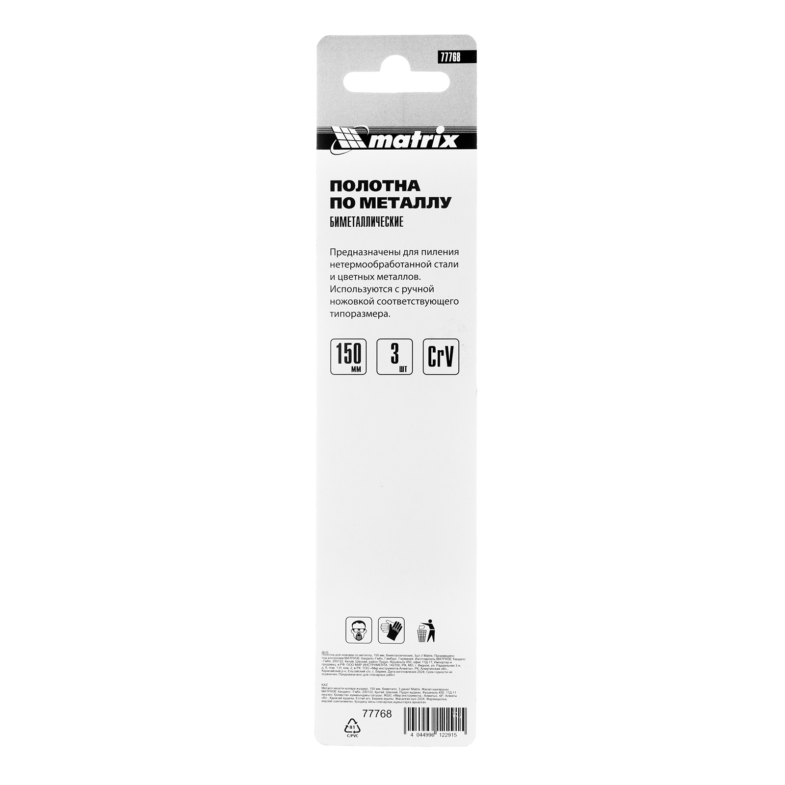 Биметаллические полотна для ножовки по металлу Matrix 77768 длиной 150 мм, 3шт., пригодятся в процессе строительства и ремонта. Благодаря им можно осуществить любой вид пиления по металлопрофилю.