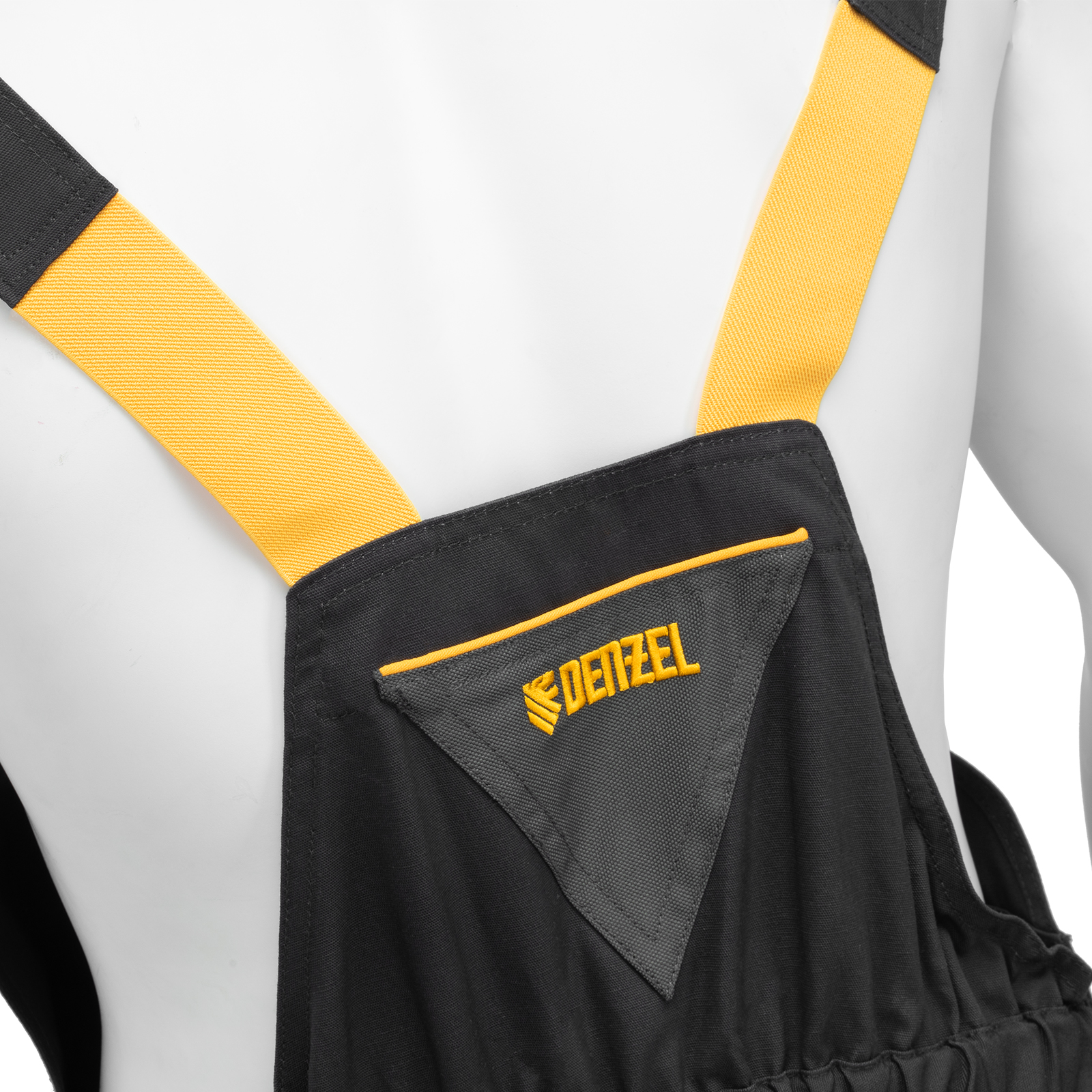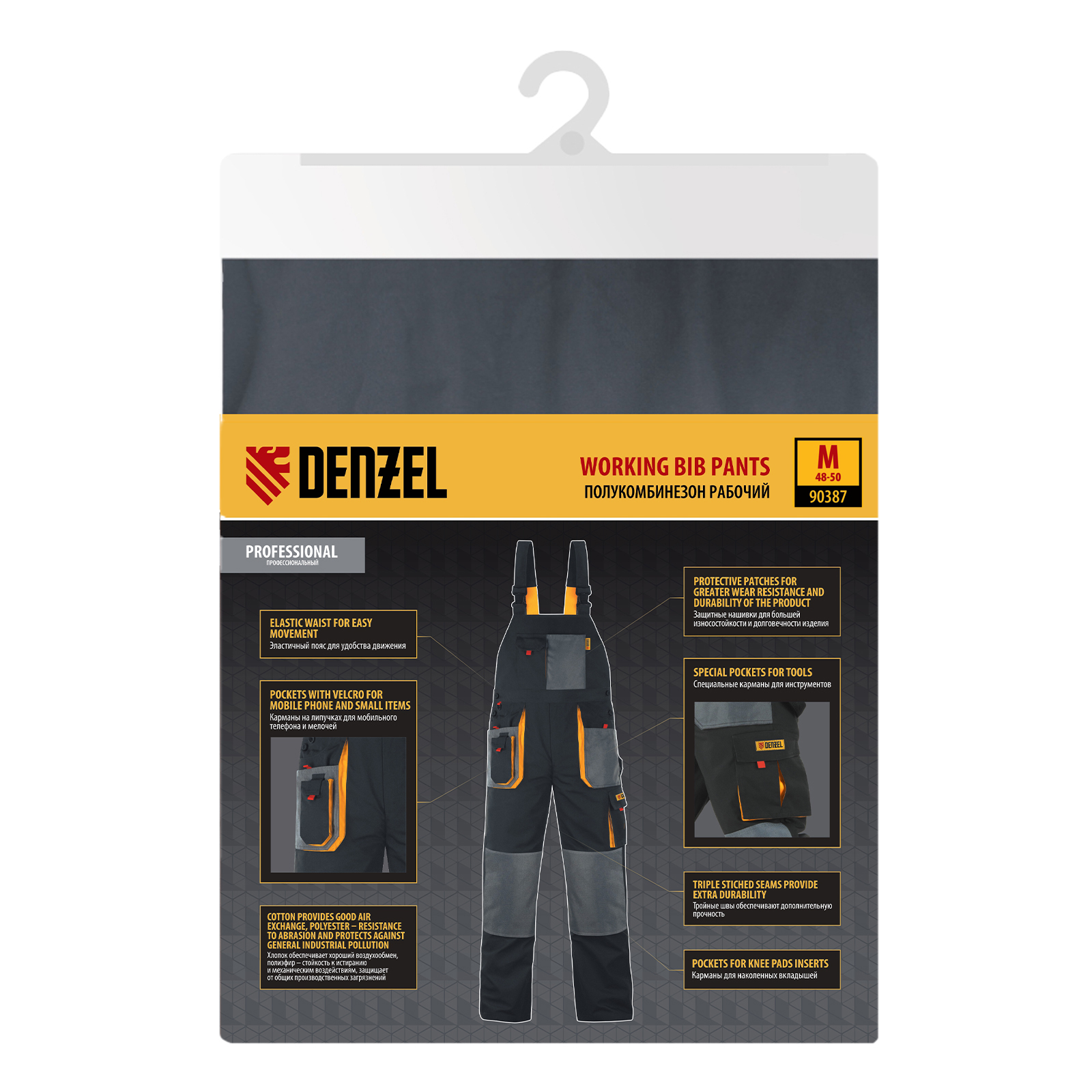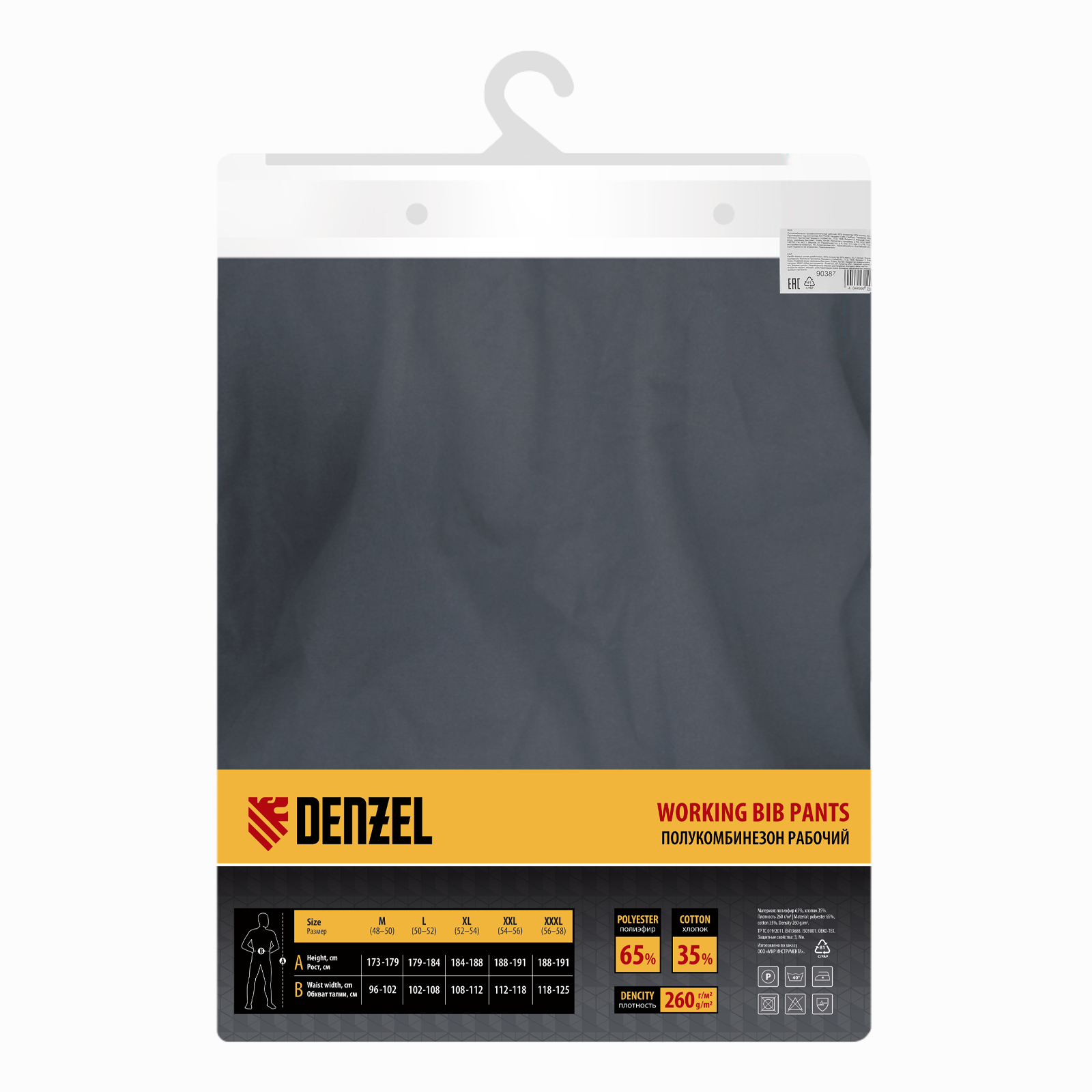 Рабочий полукомбинезон Denzel 90387 размера M рассчитан на рост 173-179 см и используется для выполнения профессиональных строительных, ремонтных и производственных работ в теплое время года или в отапливаемом помещении. Защищает пользователя от общих производственных загрязнений, нетоксичной пыли, ветра и незначительных механических воздействий. Изготовлен из ткани плотностью 260 г/м² (65% полиэфир, 35% хлопок). За счет наличия хлопковых волокон в составе ткань хорошо пропускает воздух и приятна на теле, полиэфир обеспечивает устойчивость к истиранию. Полукомбинезон выполнен в практичном темно-сером цвете.