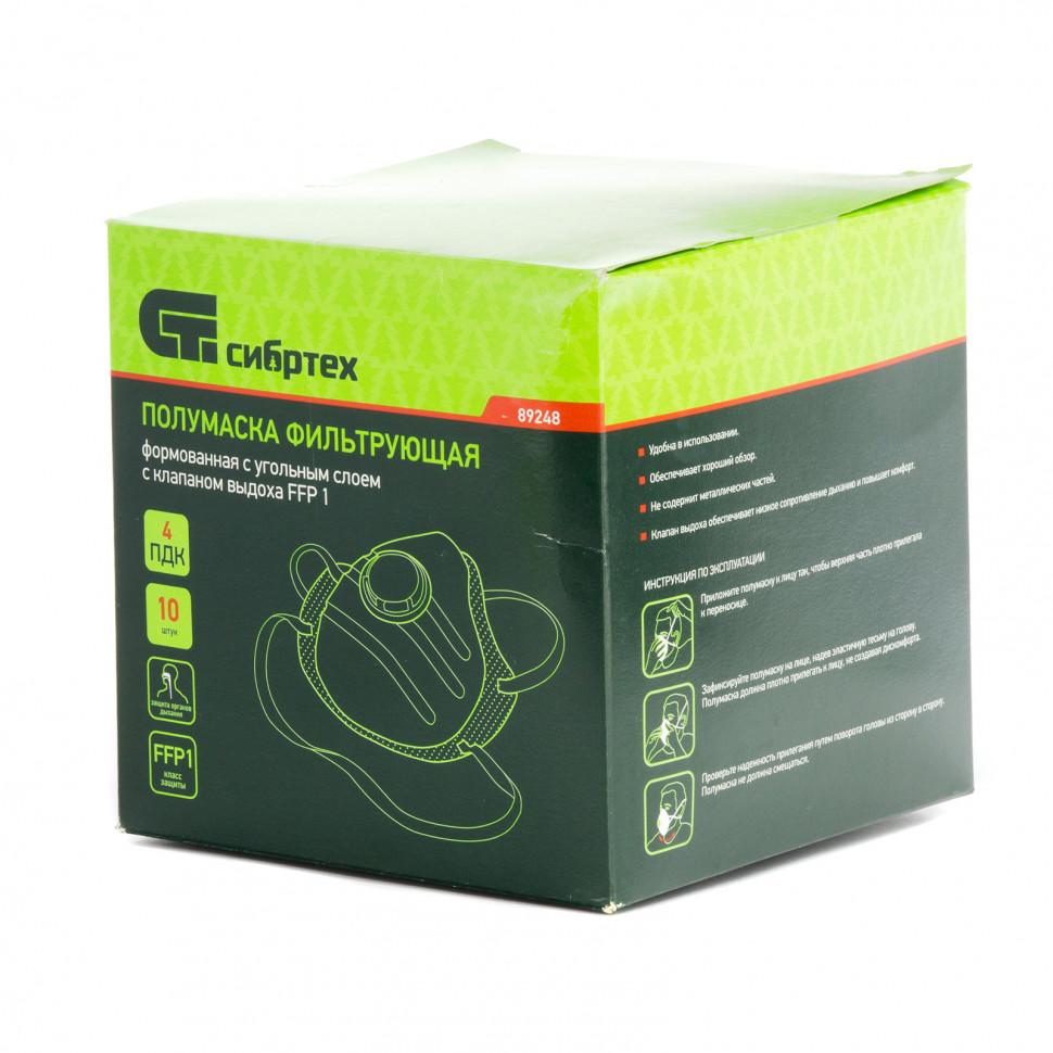 Фильтрующая полумаска (респиратор) Сибртех 89248, FFP1, c угольным слоем и клапаном выдоха, относится к категории средств индивидуальной защиты (СИЗ). Служит для защиты органов дыхания человека от различных видов аэрозолей (пыли, туманов и дымов) животного, металлургического и минерального происхождения, дустов и порошкообразных удобрений, не выделяющих токсичные газы и пары. Она предотвращает попадание вредных веществ из воздуха в органы дыхания. Изделие пригодится мастерам, работающим на пищевых, деревообрабатывающих и иных предприятиях, где могут содержаться частицы пыли, угля, мела и т.д. Подходит только для одноразового использования.