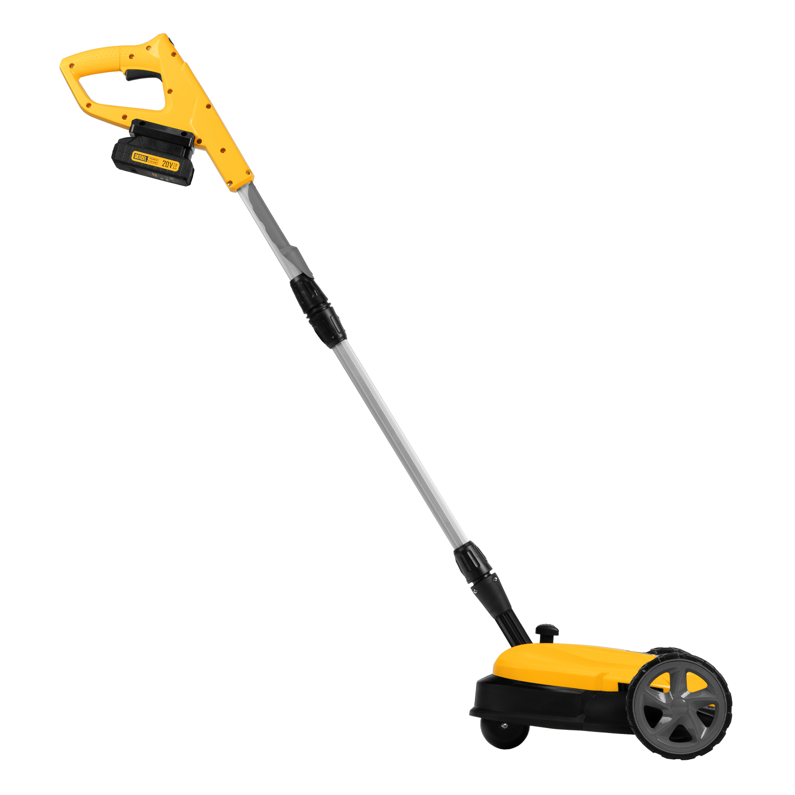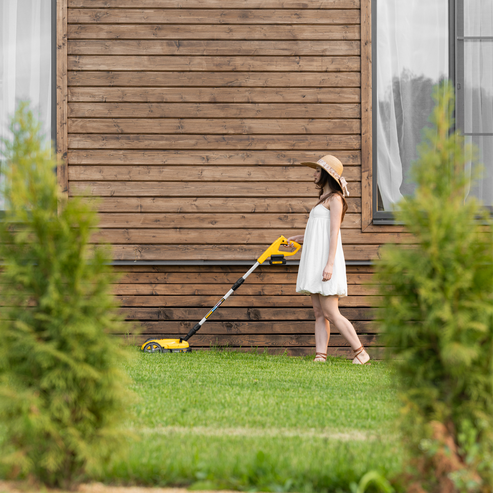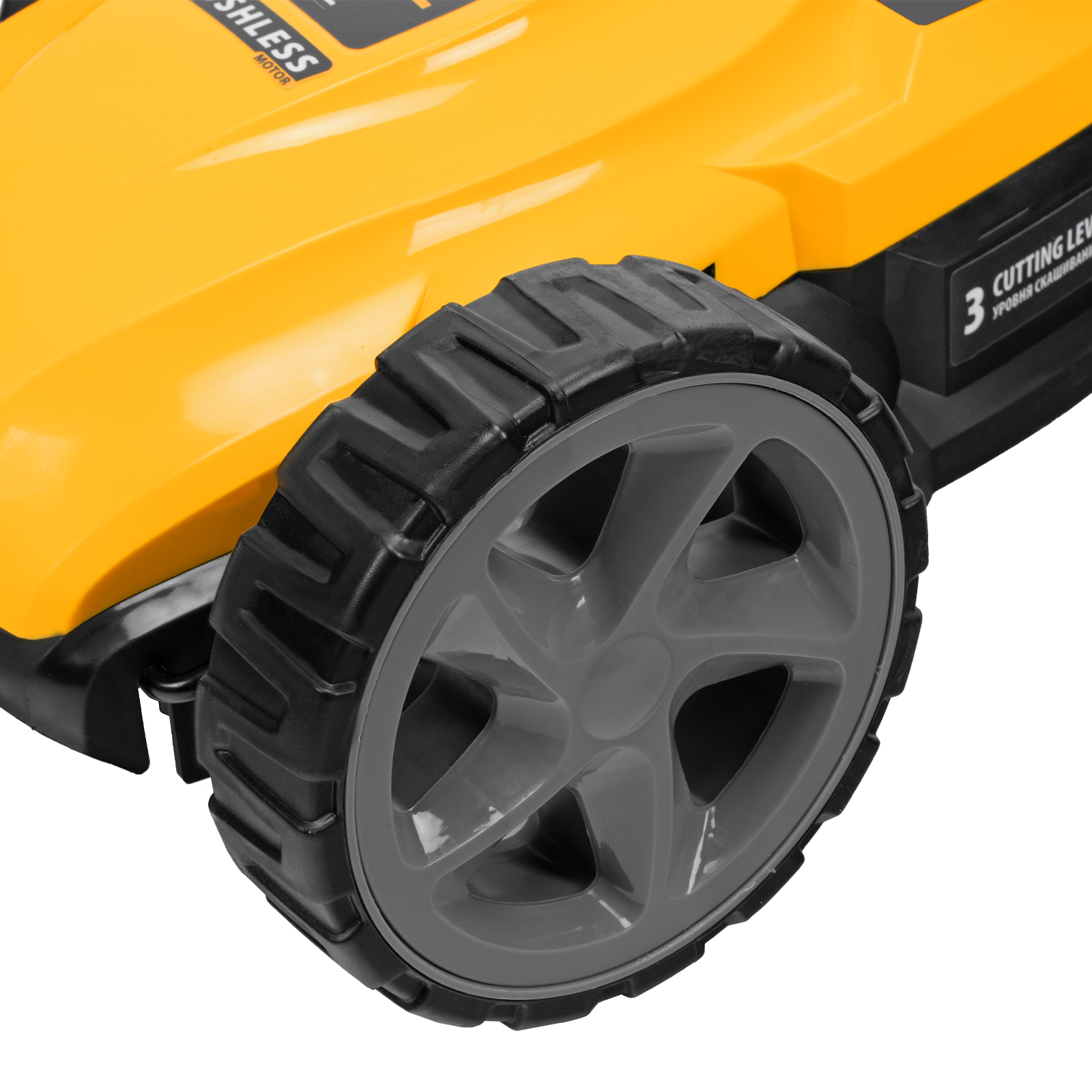 - Мобильность — благодаря небольшому весу 3,7 кг (без АКБ), двум большим и одному малому сферическому колесу технику легко перемещать, косить траву удобно даже в узких и труднодоступных местах.