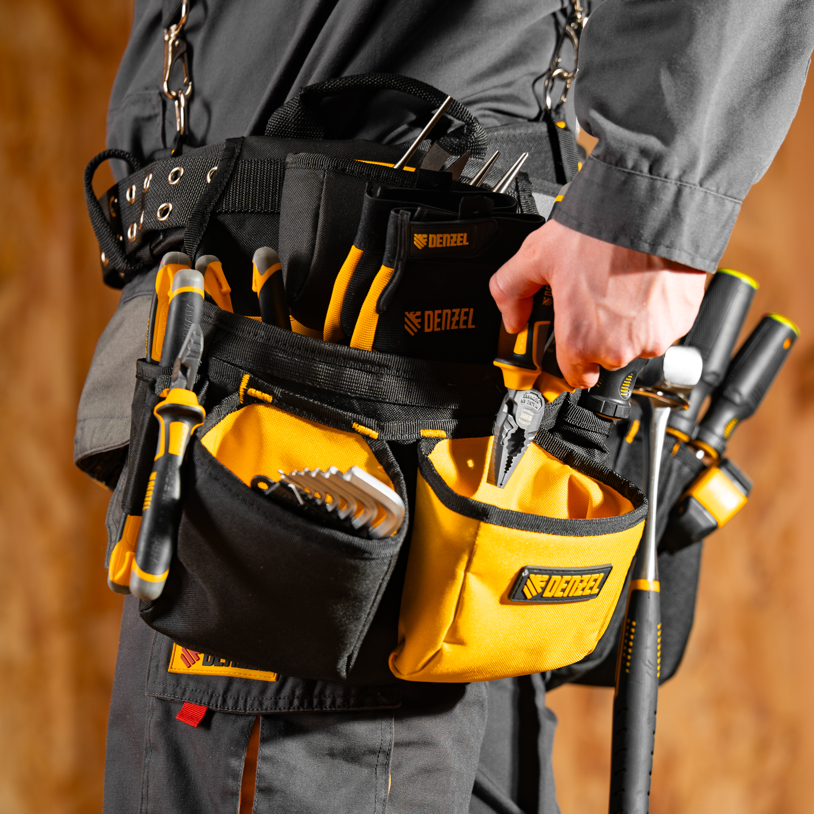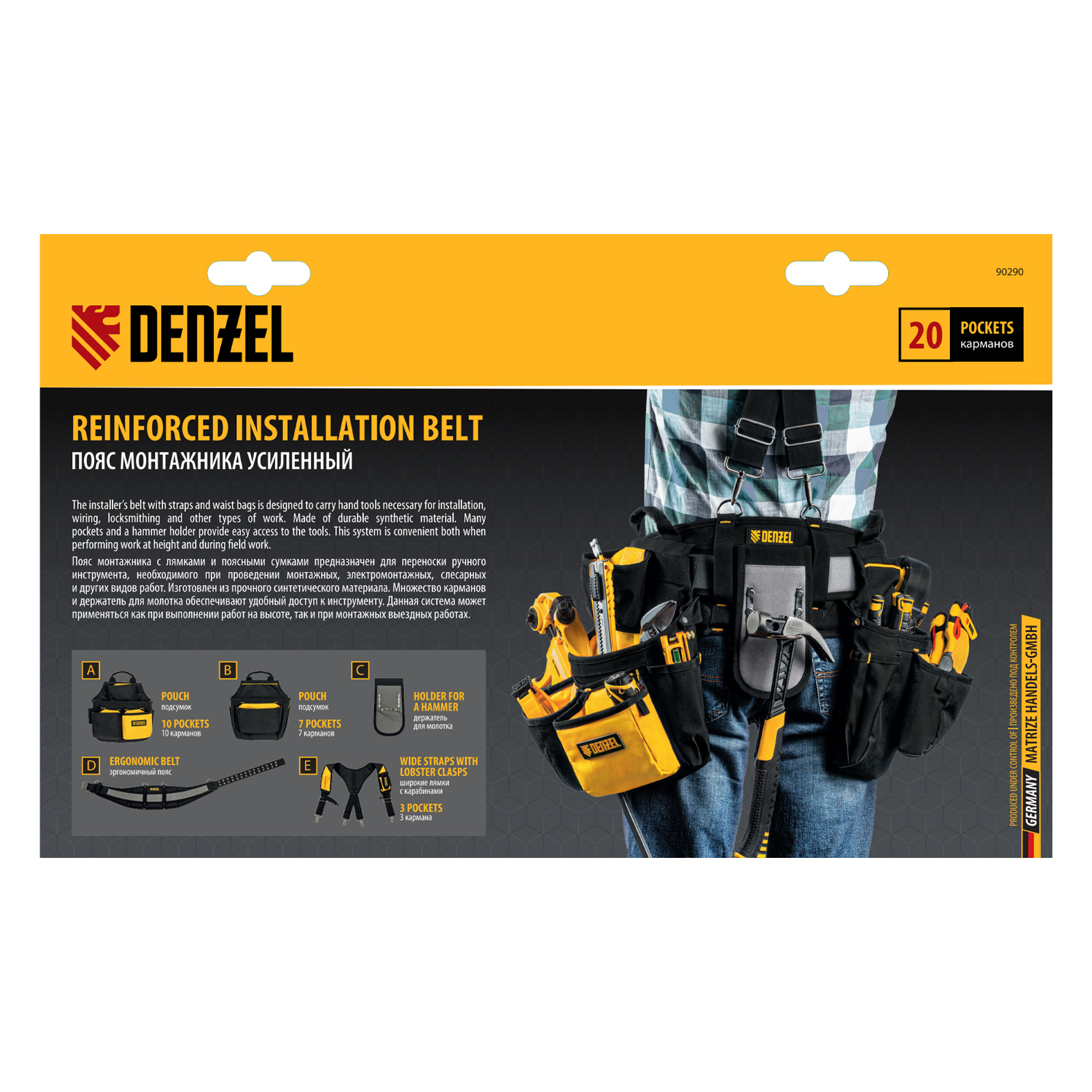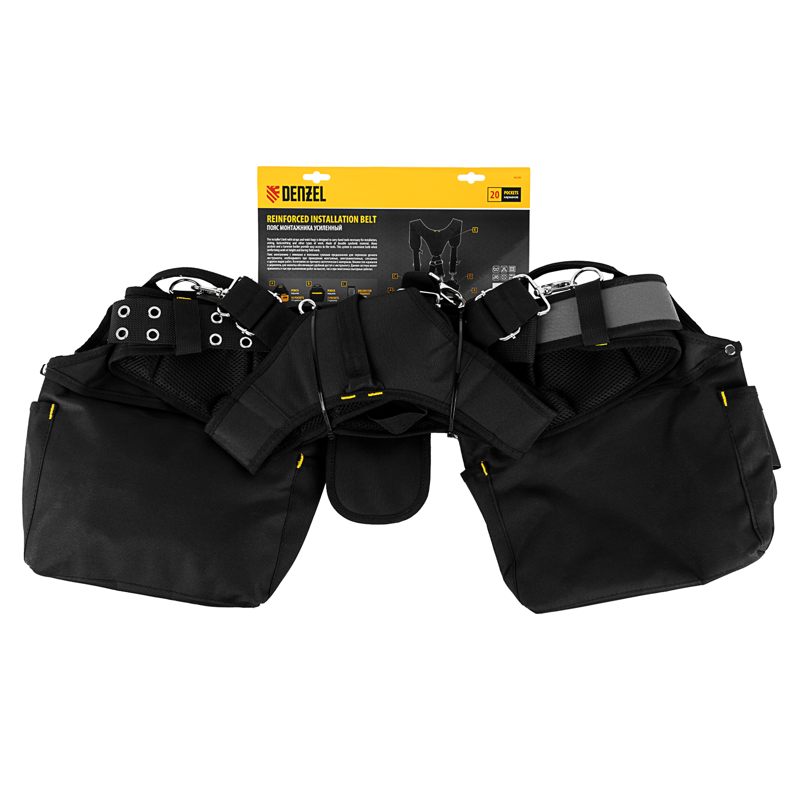 Усиленный пояс монтажника Denzel 90290 с лямками, поясными сумками и держателем для молотка оптимален для работы на высоте или на выезде. Обеспечивает быстрый доступ к нужным инструментам, оставляя руки свободными. Незаменим для выполнения монтажных, слесарных, электромонтажных и других работ.
