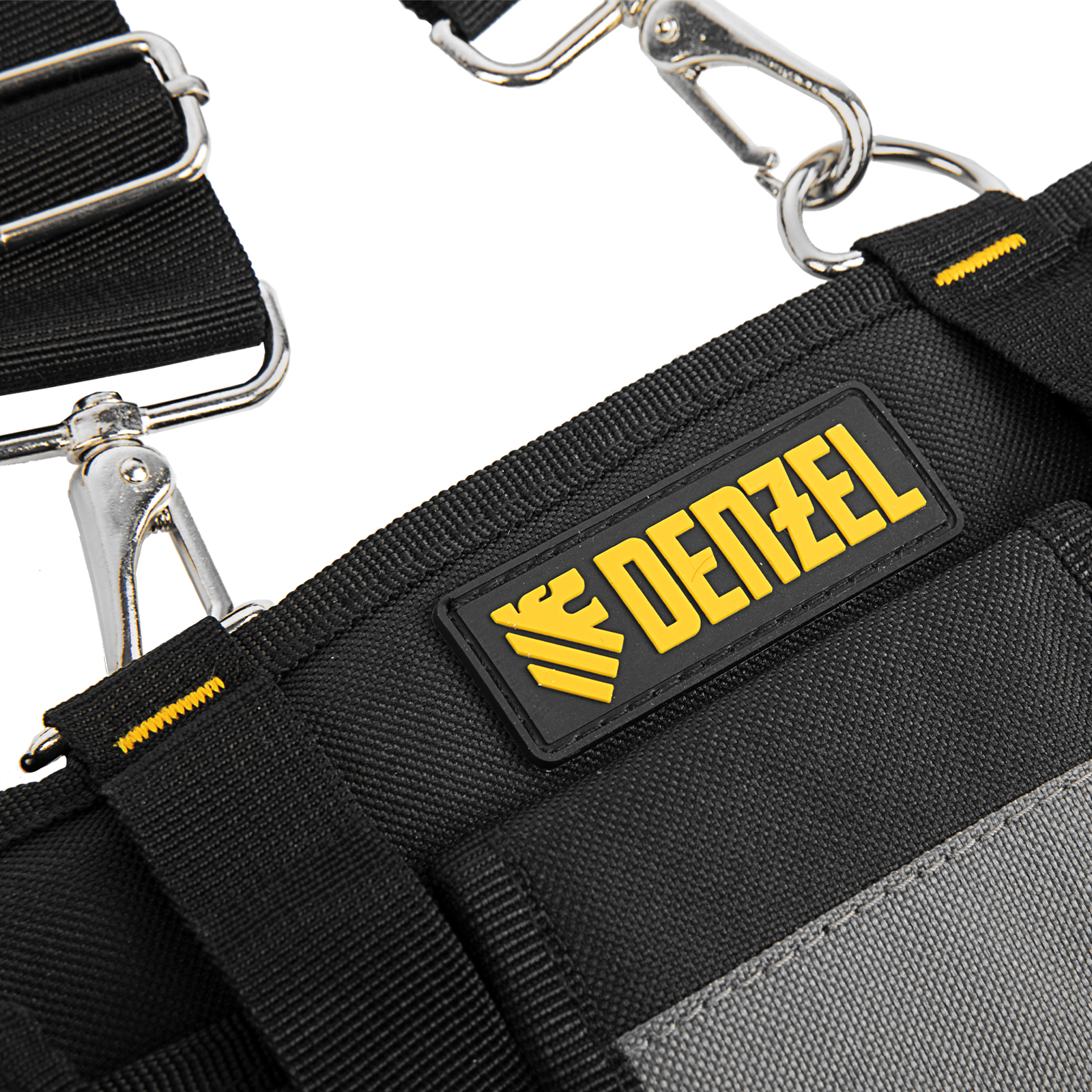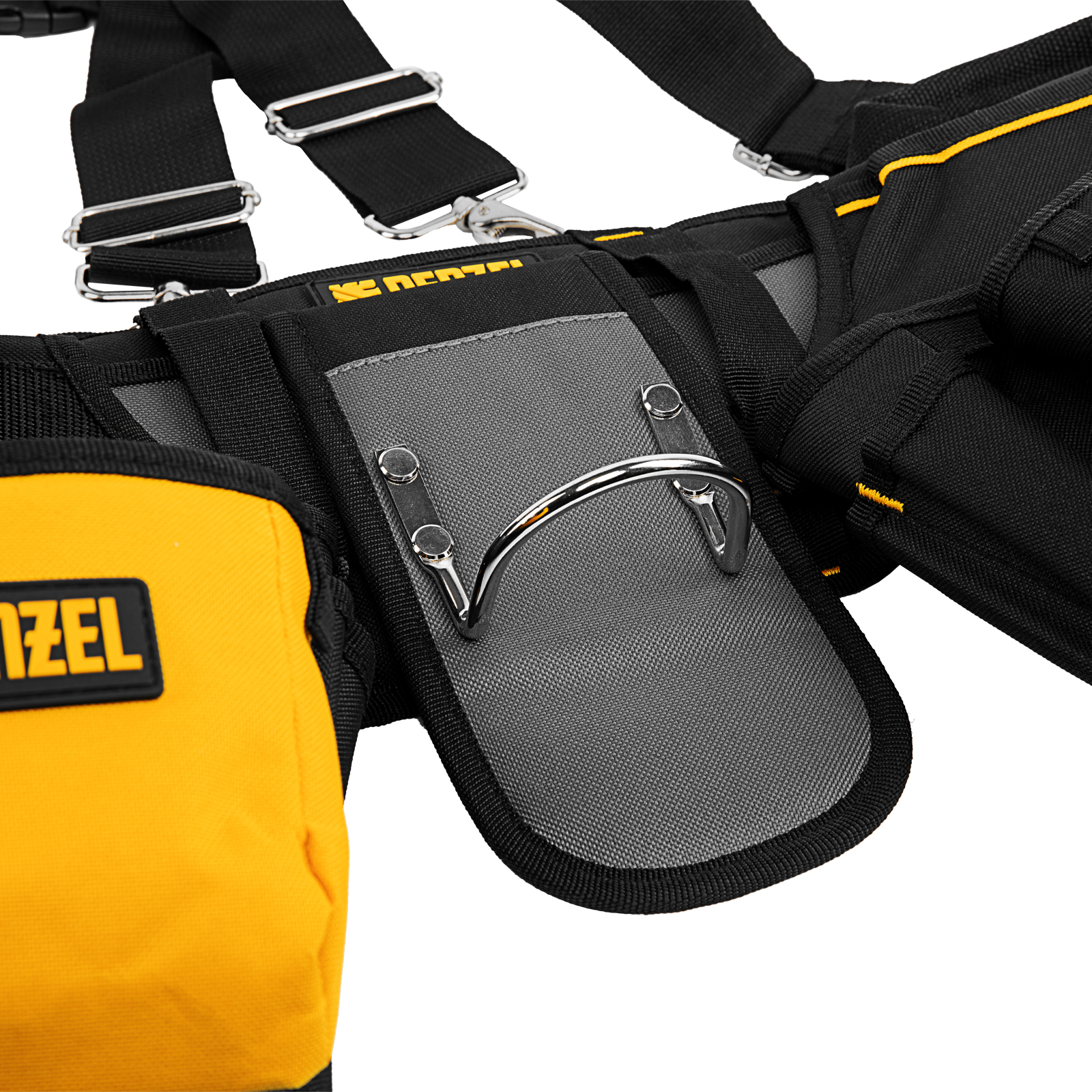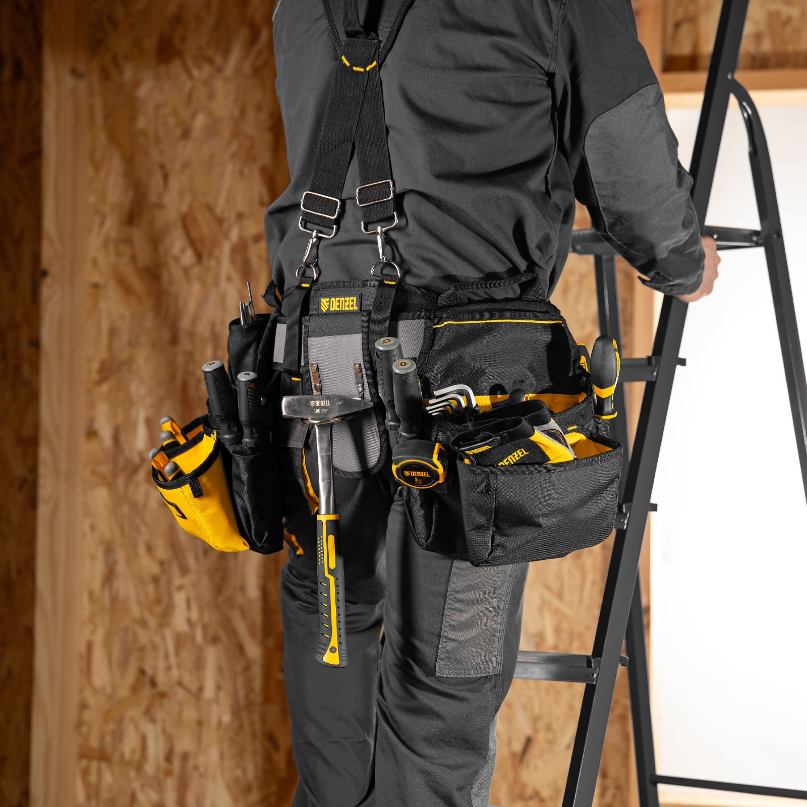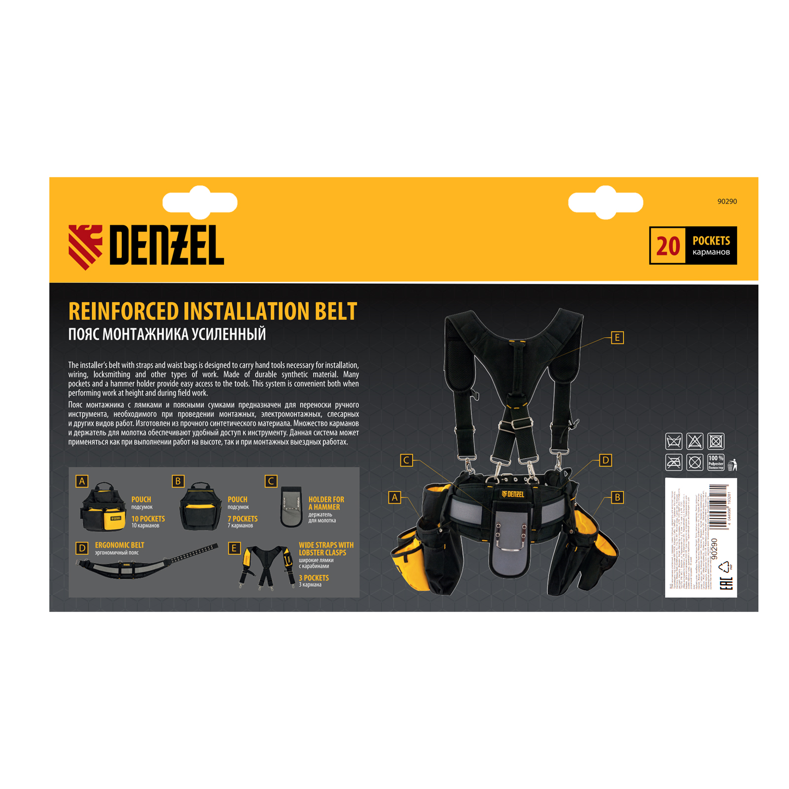 Усиленный пояс монтажника Denzel 90290 с лямками, поясными сумками и держателем для молотка оптимален для работы на высоте или на выезде. Обеспечивает быстрый доступ к нужным инструментам, оставляя руки свободными. Незаменим для выполнения монтажных, слесарных, электромонтажных и других работ.