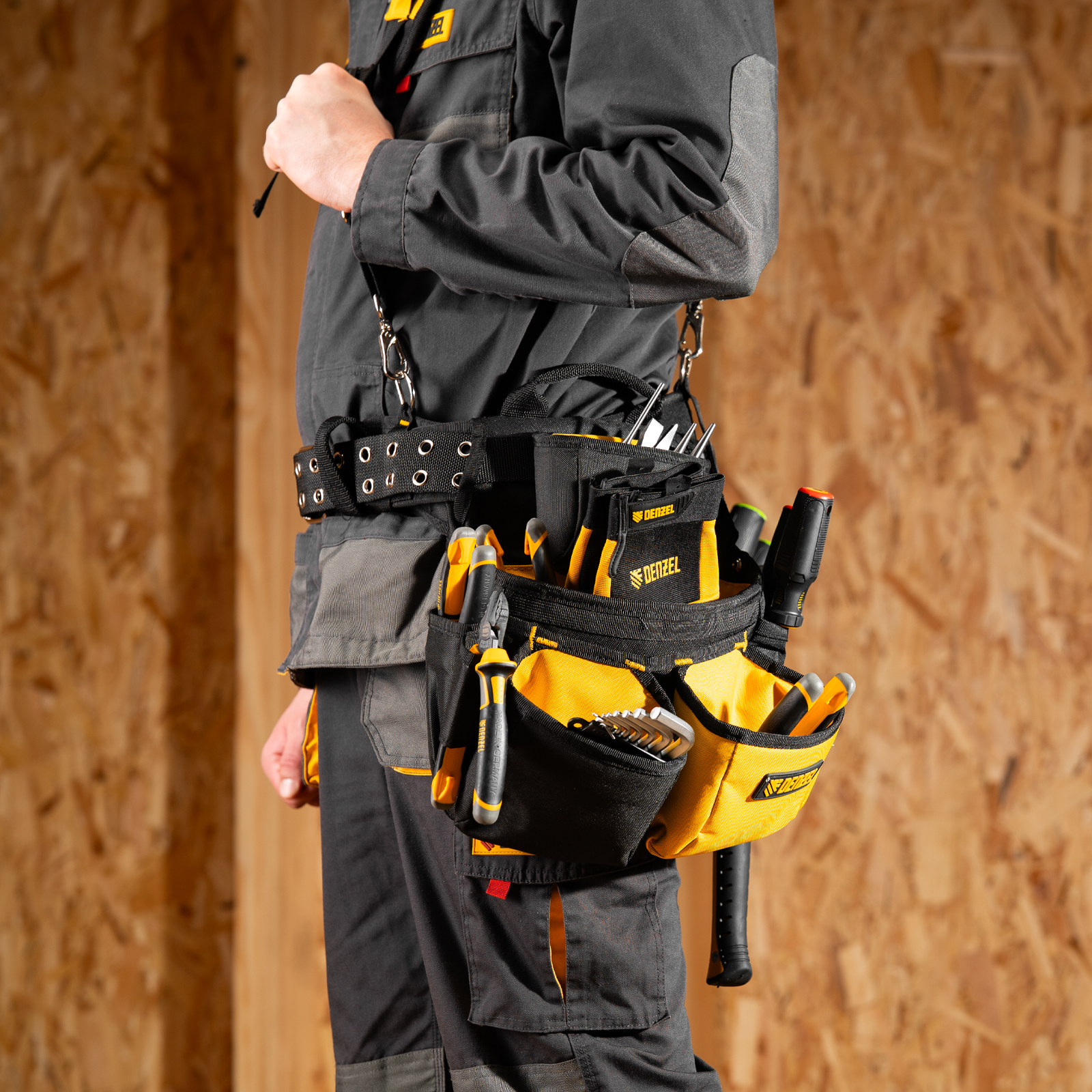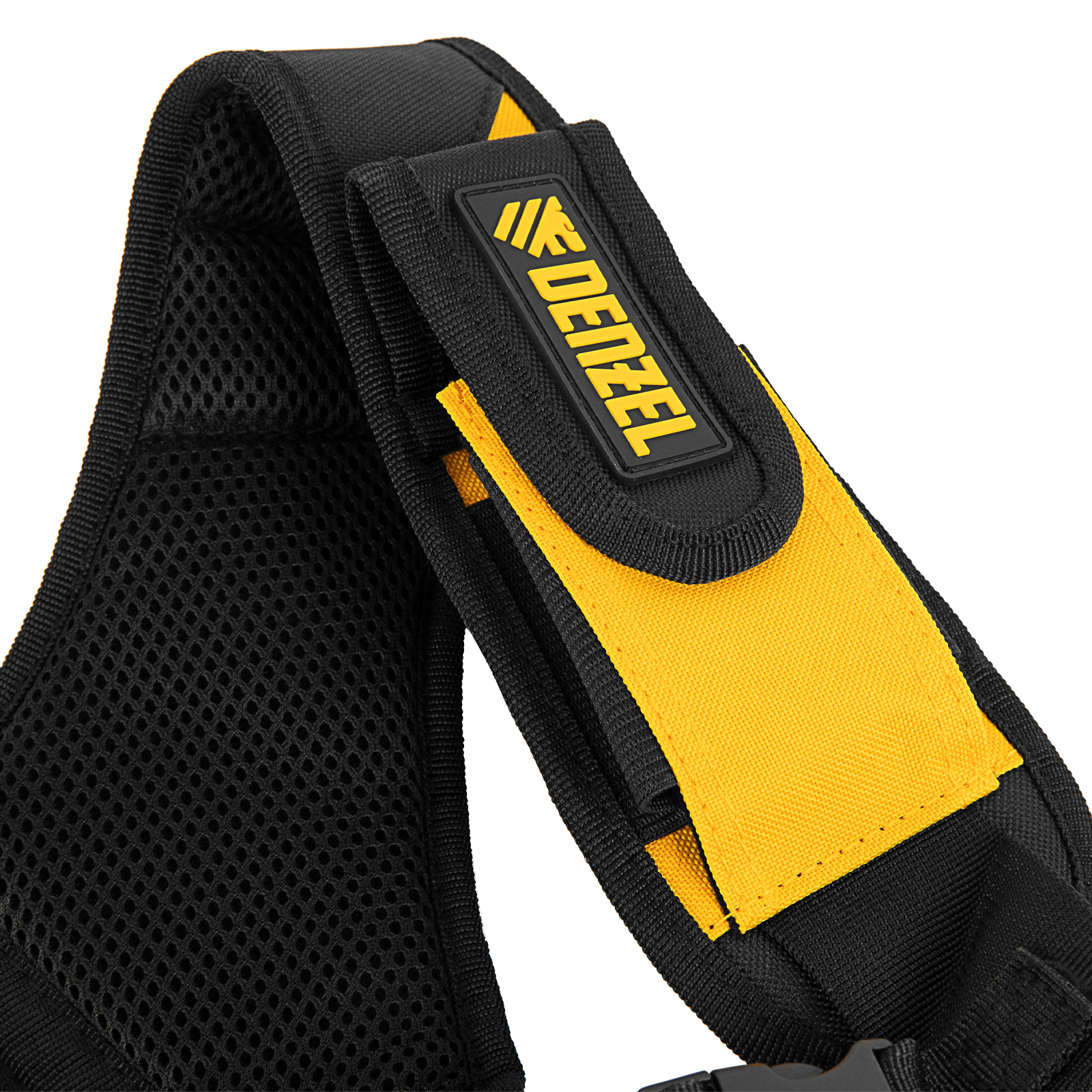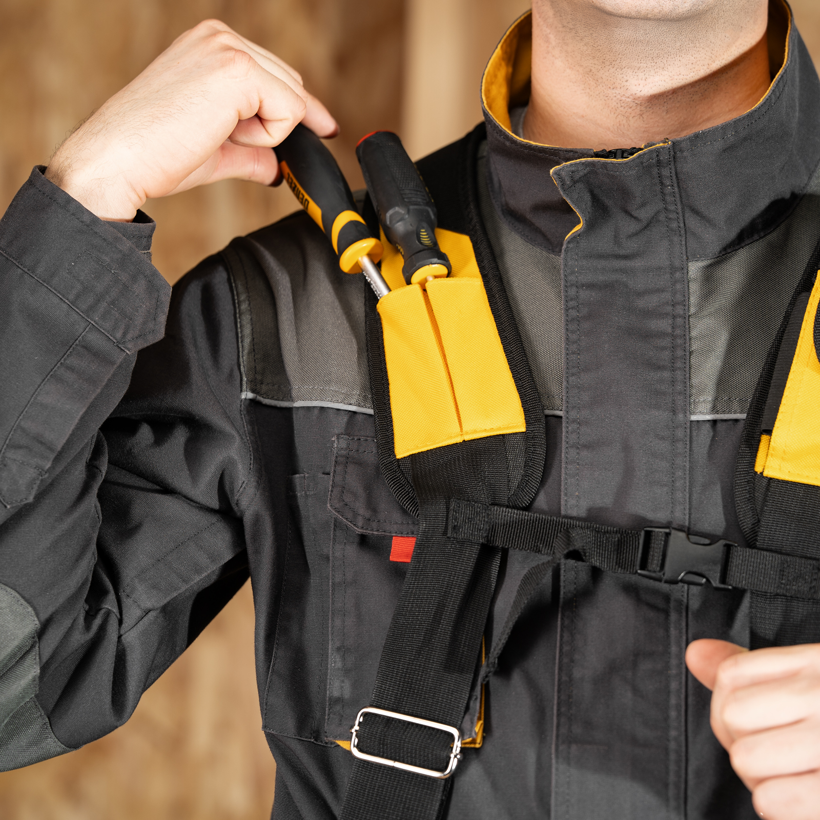 - Эргономичность — регулируемые широкие лямки равномерно распределяют вес инструментов, уменьшая нагрузку на спину.