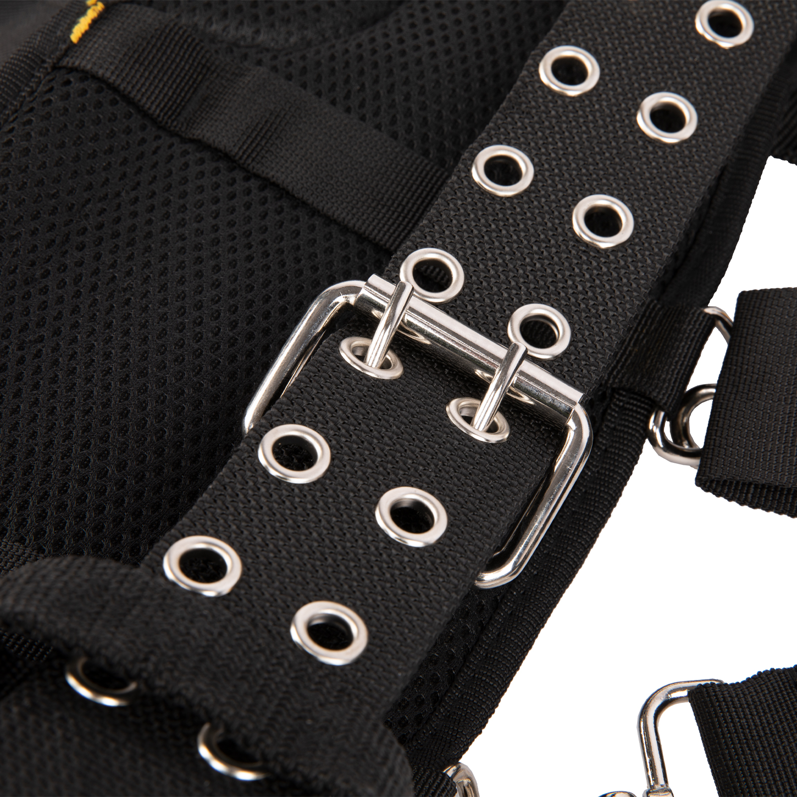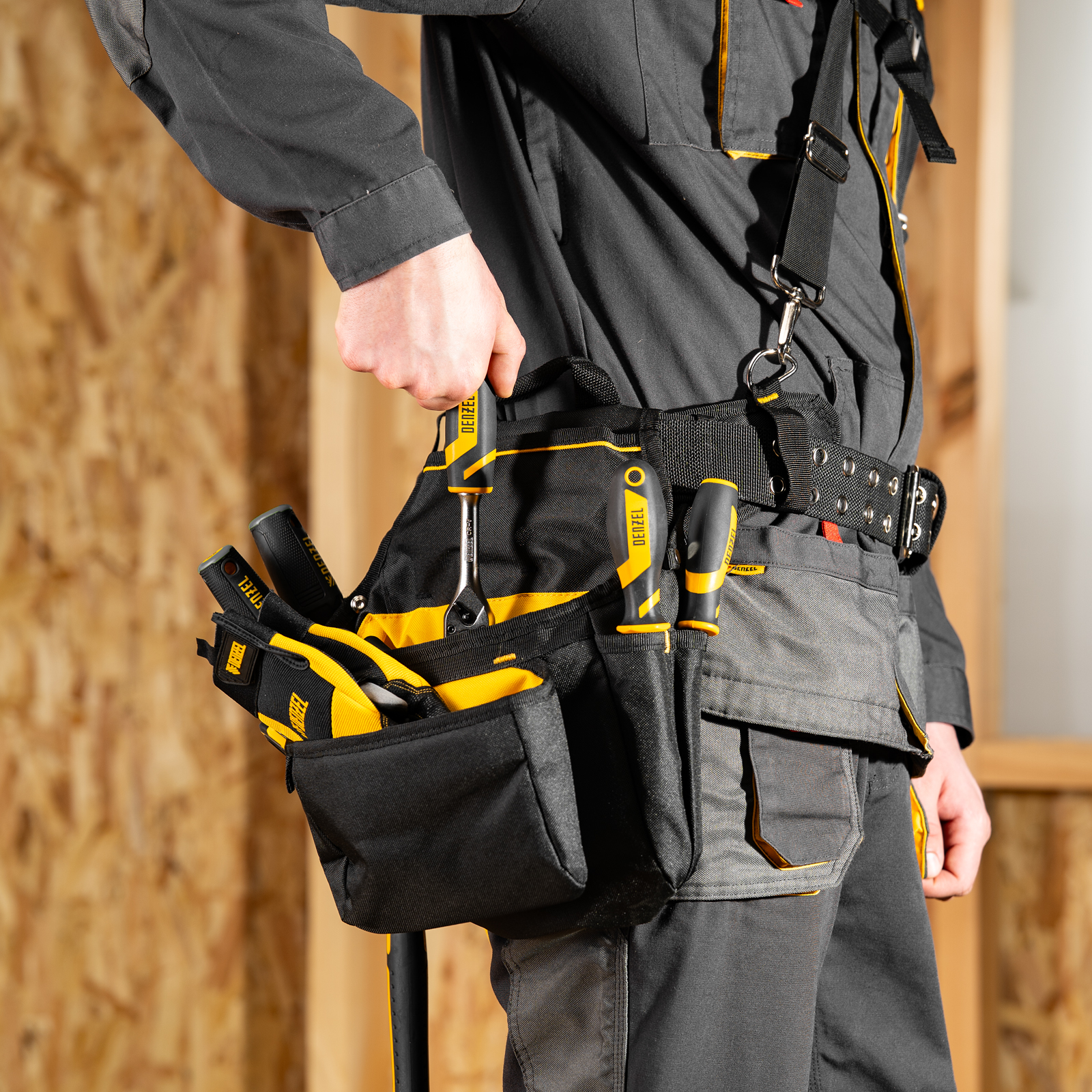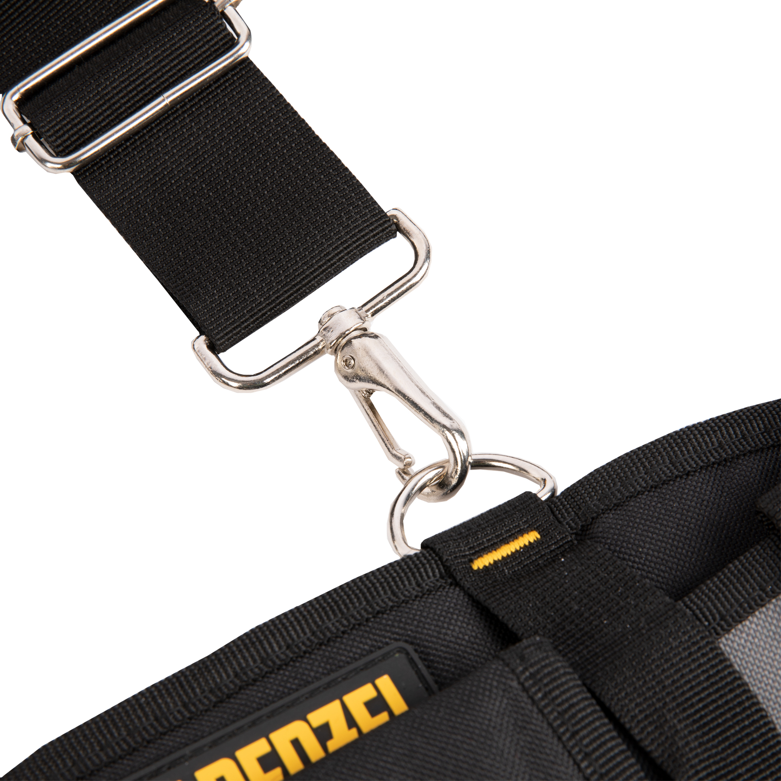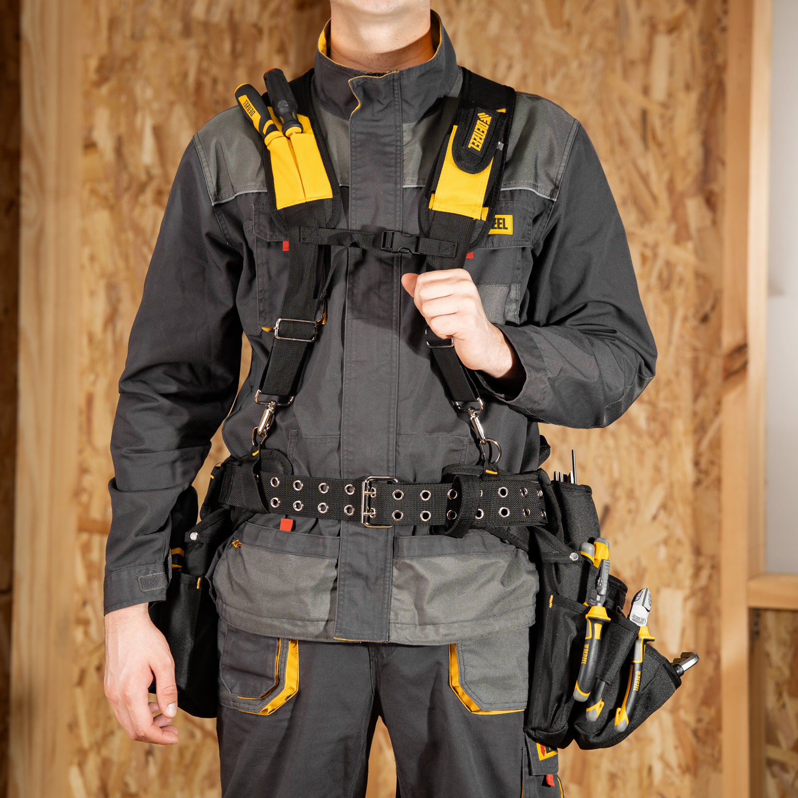- Эргономичность — регулируемые широкие лямки равномерно распределяют вес инструментов, уменьшая нагрузку на спину.
