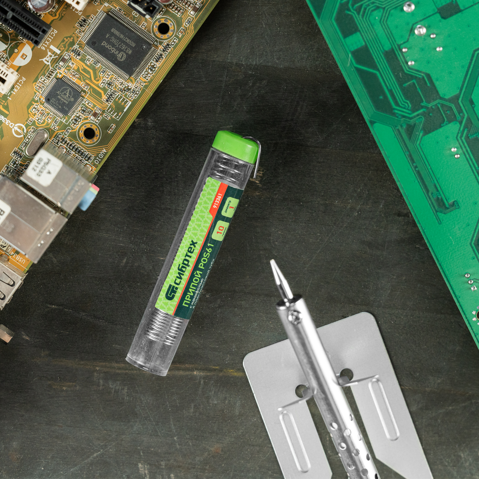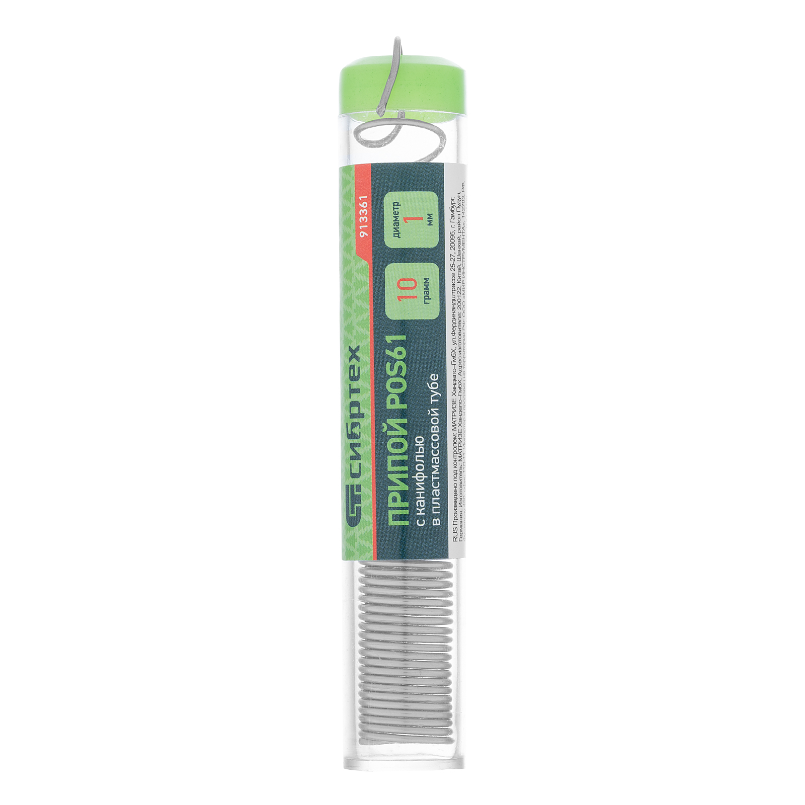 Припой с канифолью POS61 Сибртех 913361 диаметром 1 мм и весом 10 г, в пластмассовой тубе, — материал для пайки, в расплавленном состоянии соединяющий металлические детали. Содержит 39% свинца, 61% олова (Sn61% + Pb39%) и канифоль, не требует очистки припаиваемых поверхностей. Будет полезен для бытового ремонта радиоэлектронной аппаратуры.
