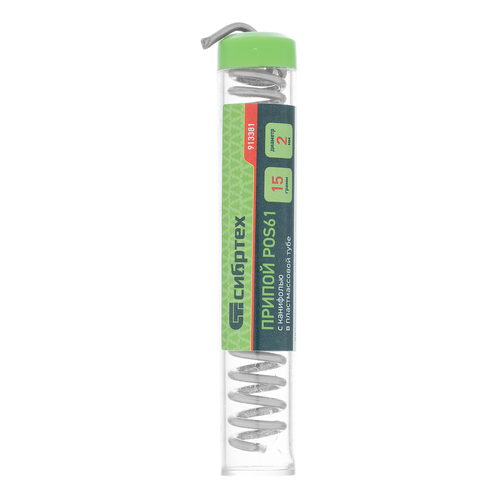 Припой с канифолью POS61 Сибртех 913381 диаметром 2 мм и весом 15 г, в пластмассовой тубе, — материал для пайки, в расплавленном состоянии соединяющий металлические детали. Содержит 39% свинца, 61% олова (Sn61% + Pb39%) и канифоль, не требует очистки припаиваемых поверхностей. Будет полезен для бытового ремонта радиоэлектронной аппаратуры.