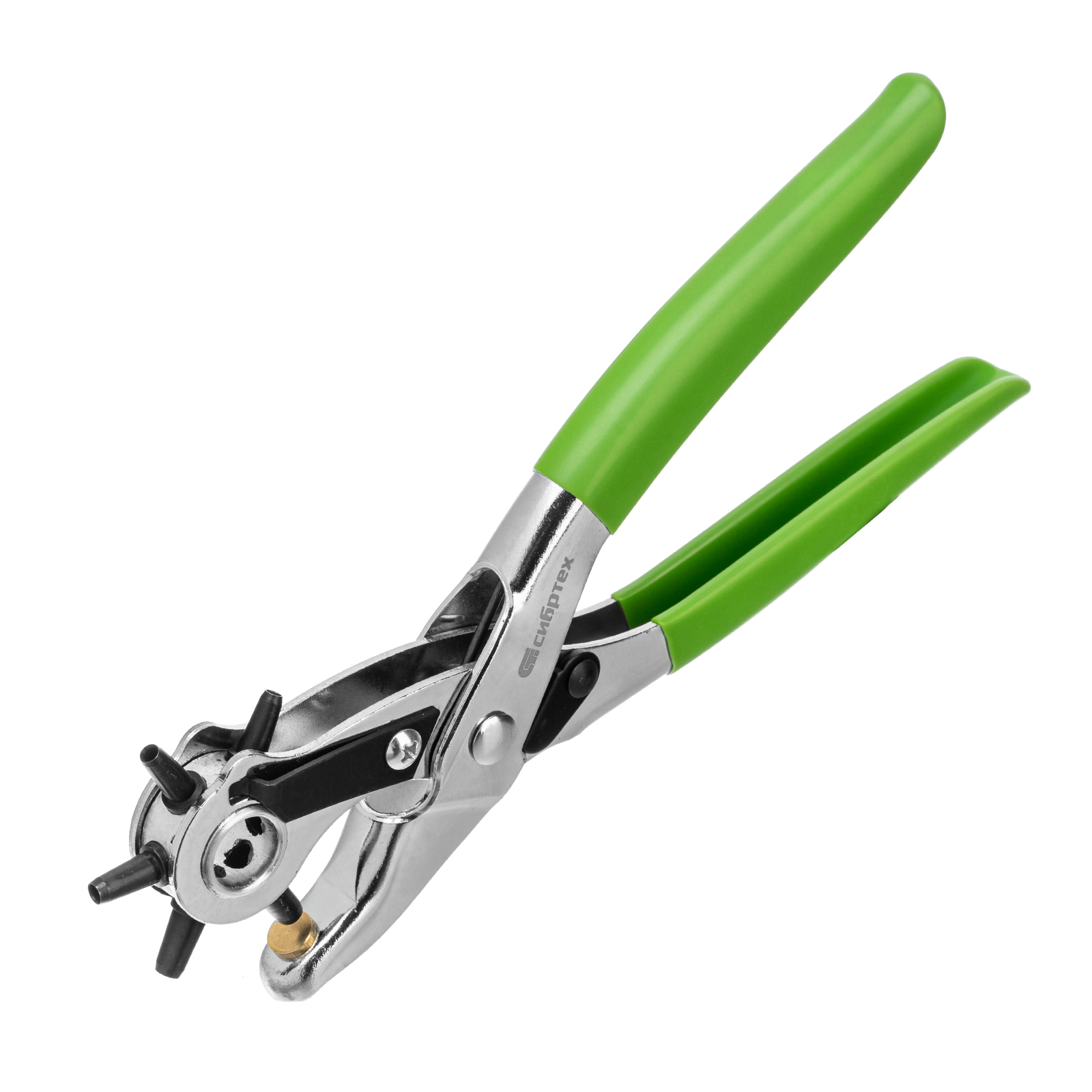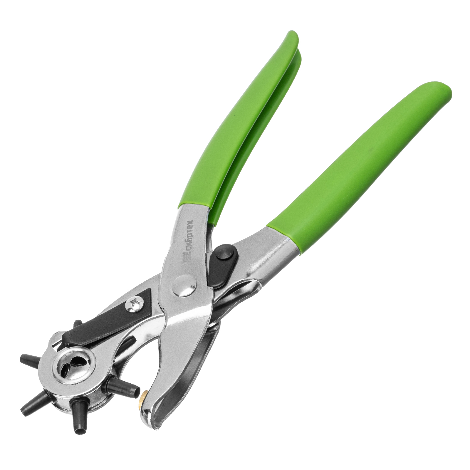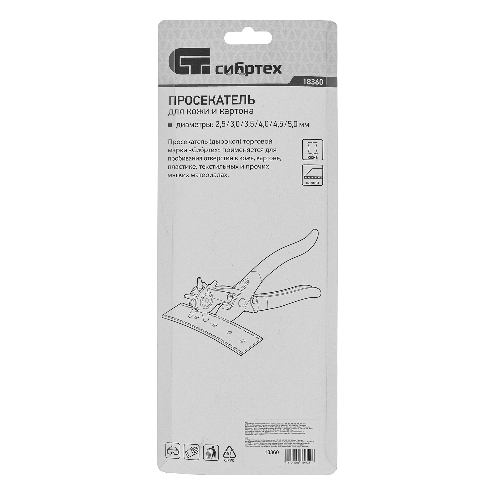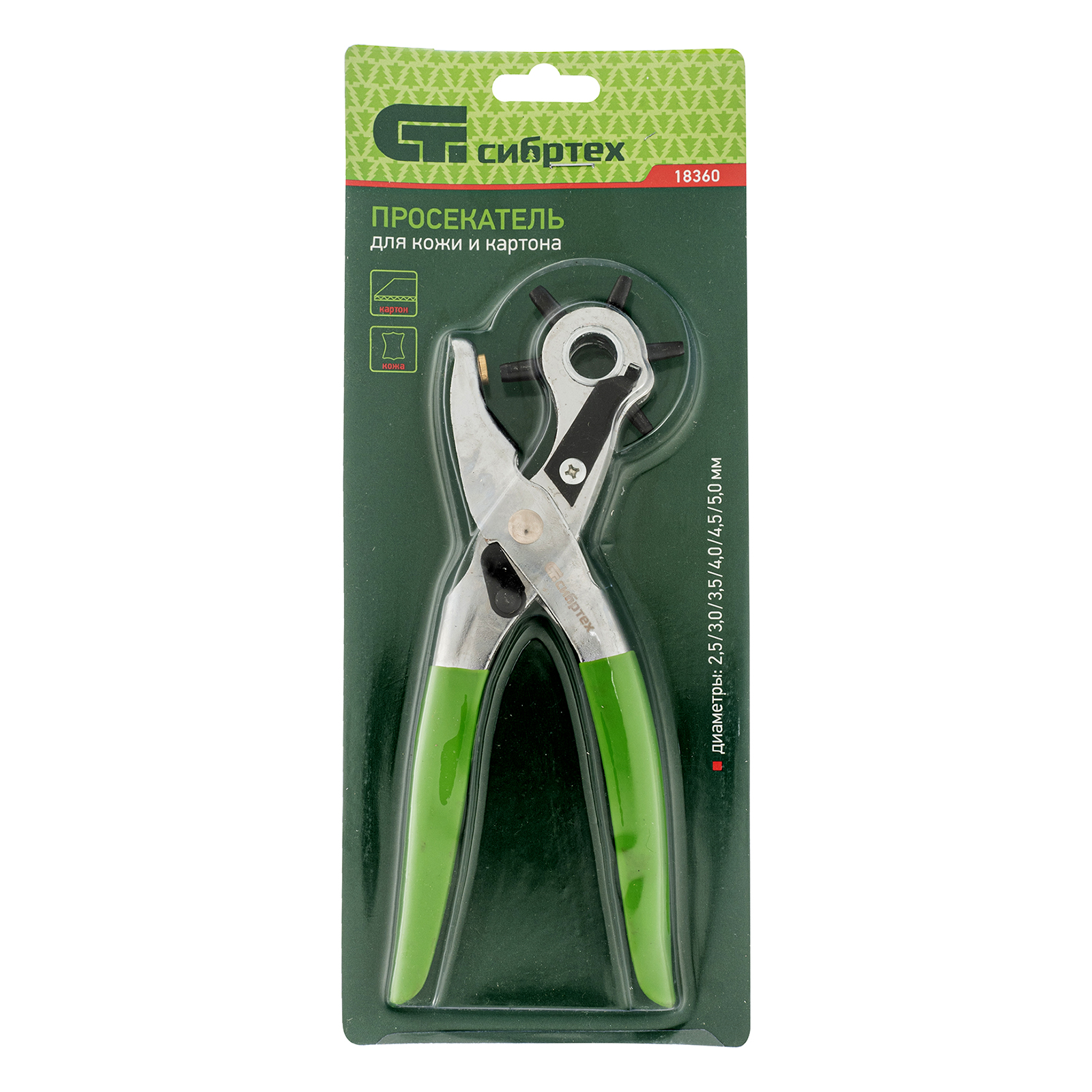 <p>Просекатель (дырокол) для кожи и картона Сибртех 18360 позволяет проделывать отверстия различного диаметра: 2,5, 3,0, 3,5, 4,0, 4,5, 5,0 мм. С его помощью можно проколоть неплотные изделия толщиной до 3 мм. Это идеальный инструмент для работы в мастерской и дома.</p><h2>Преимущества</h2><ul><li>Прочность и надежность просекателя достигается благодаря качественным материалам изготовления — пробойники выполнены из стали 40 Cr (40 X), а наковальня — из латуни.</li><li>Никелевое покрытие защищает просекатель от образования коррозии.</li><li>Обливные рукоятки удобно лежат в руке, что повышает комфорт работы.</li></ul>